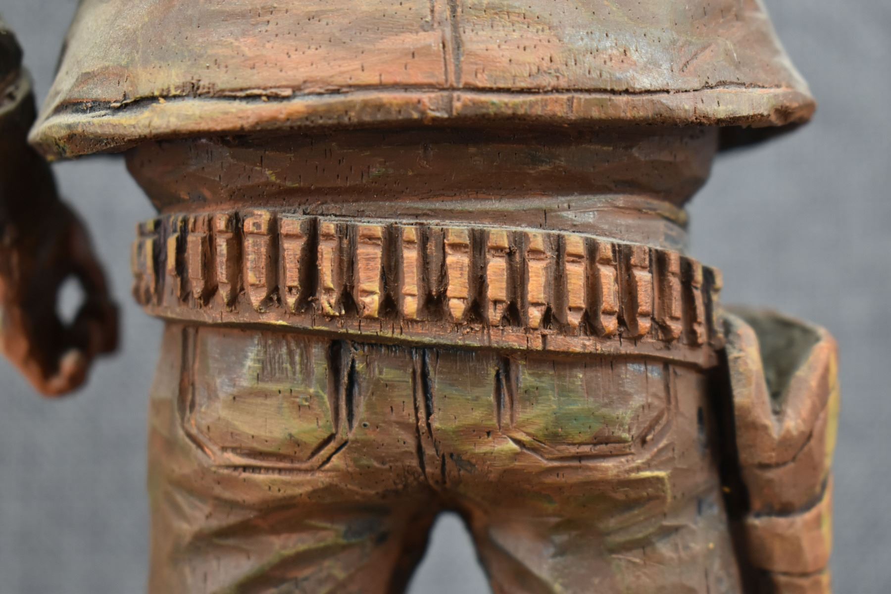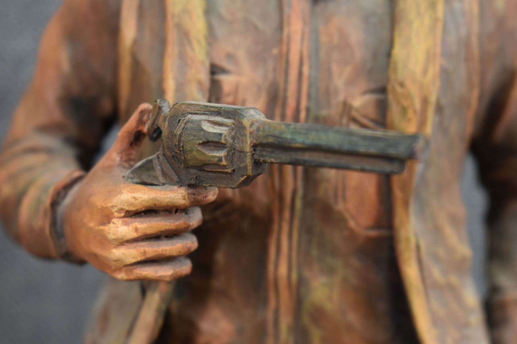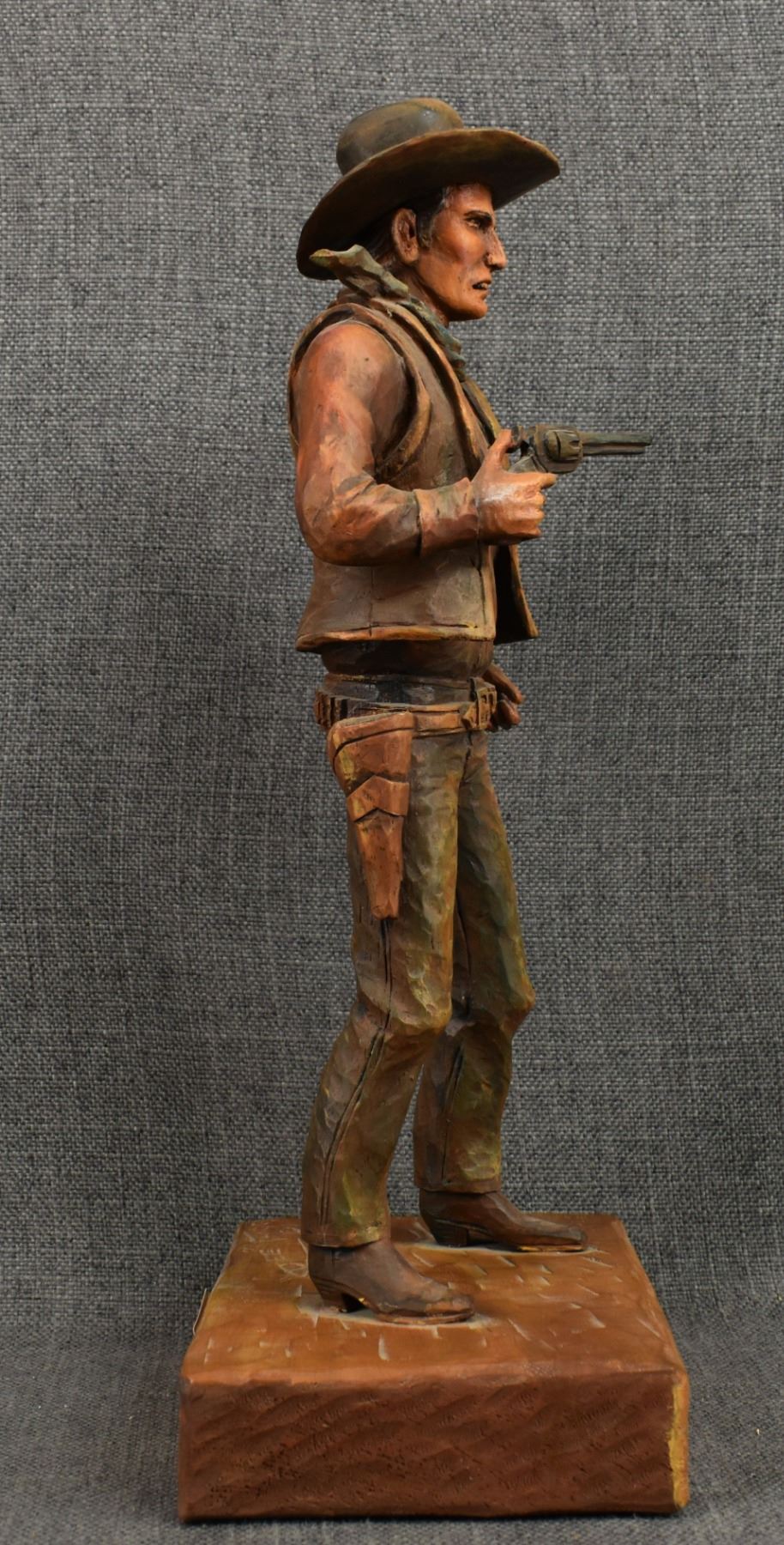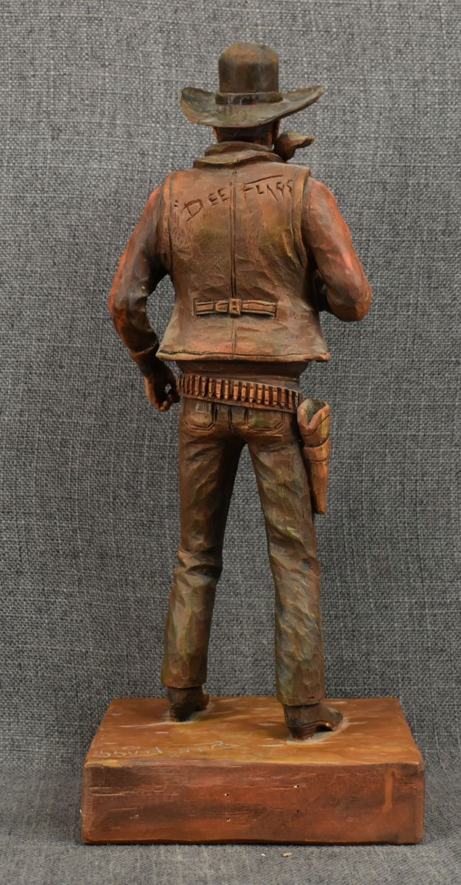 1960's Western. Hand carved wood depicting Jessie James. Signed Dee Flagg. 15'' tall