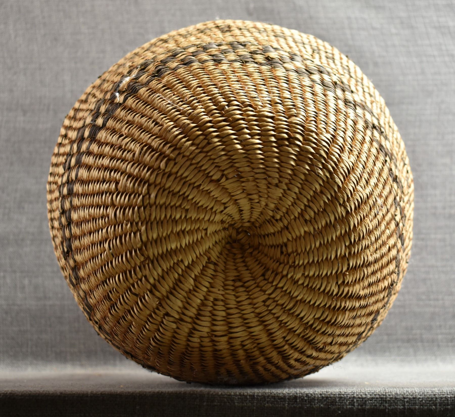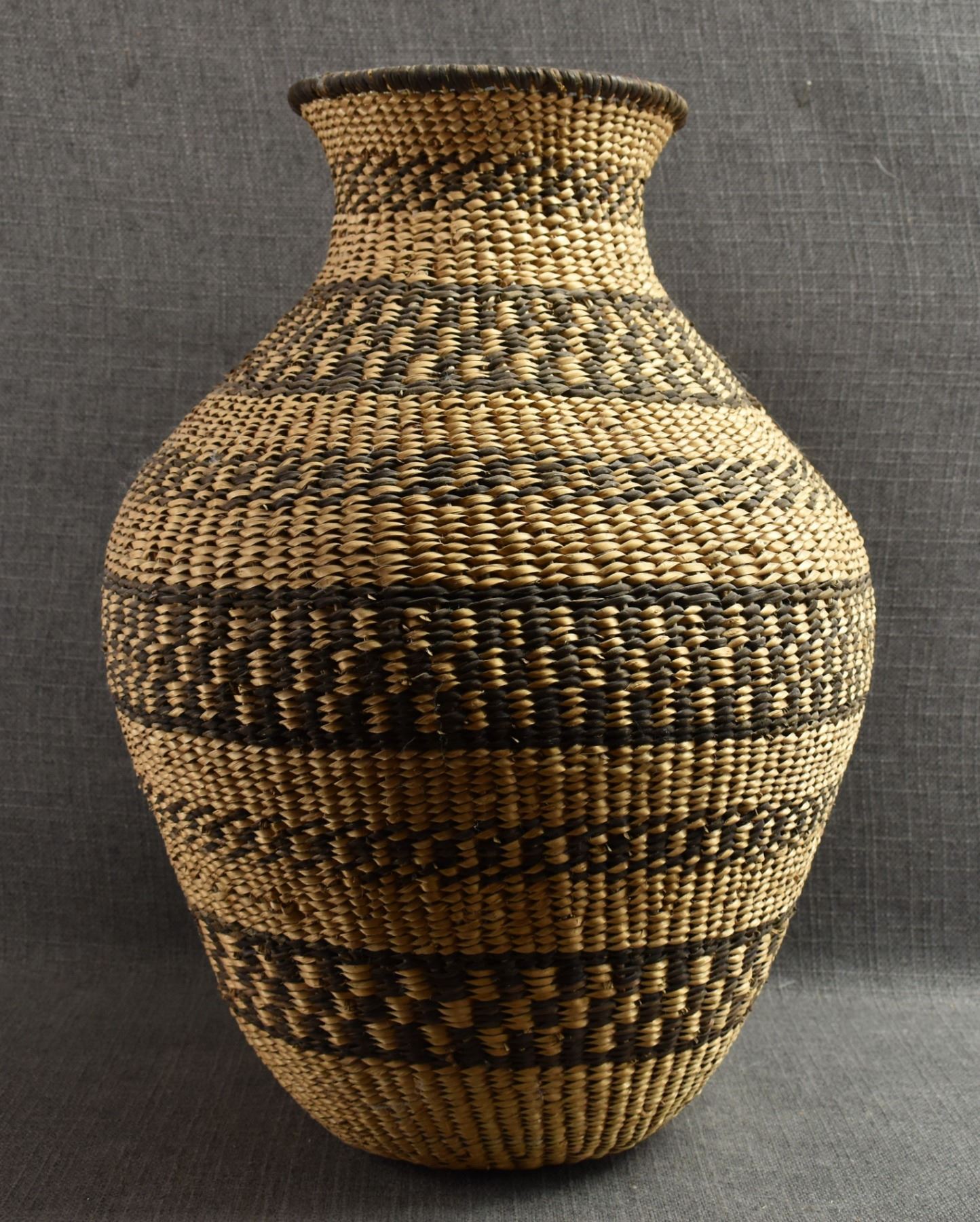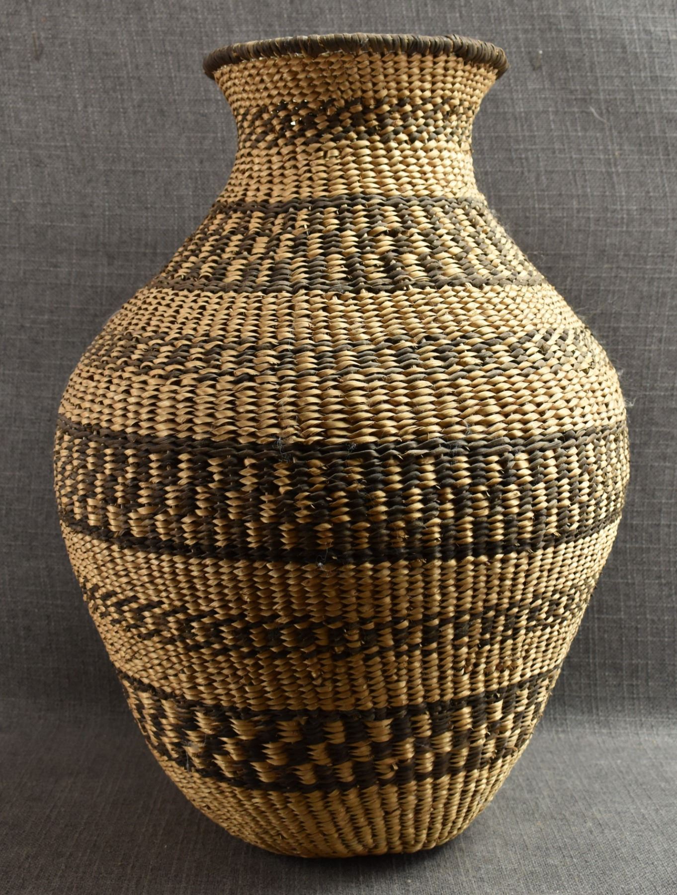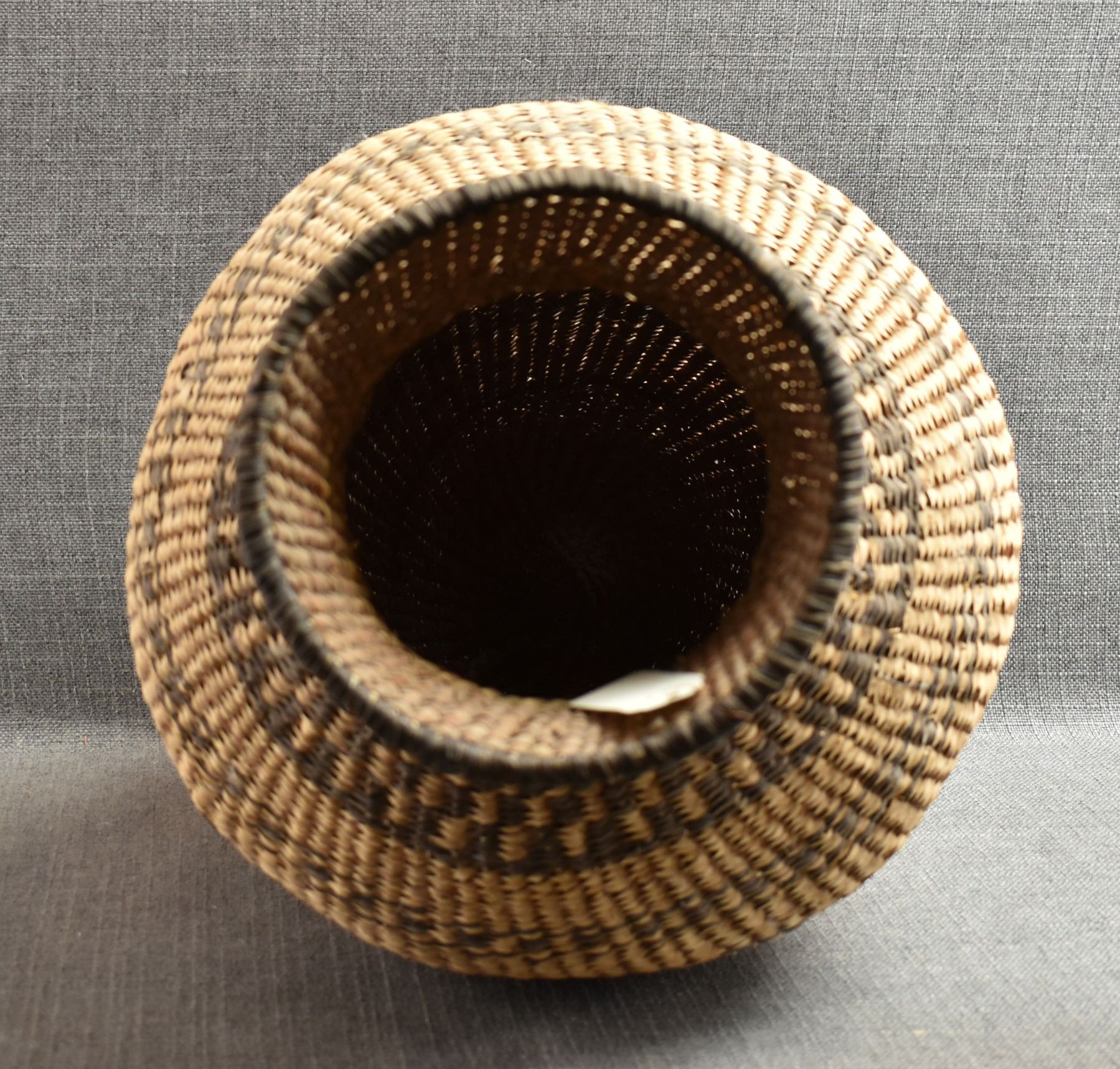 1980's white Mountain Apache. Hand woven banded design basketry olla. By Lina Guzman. 19'' x 14''