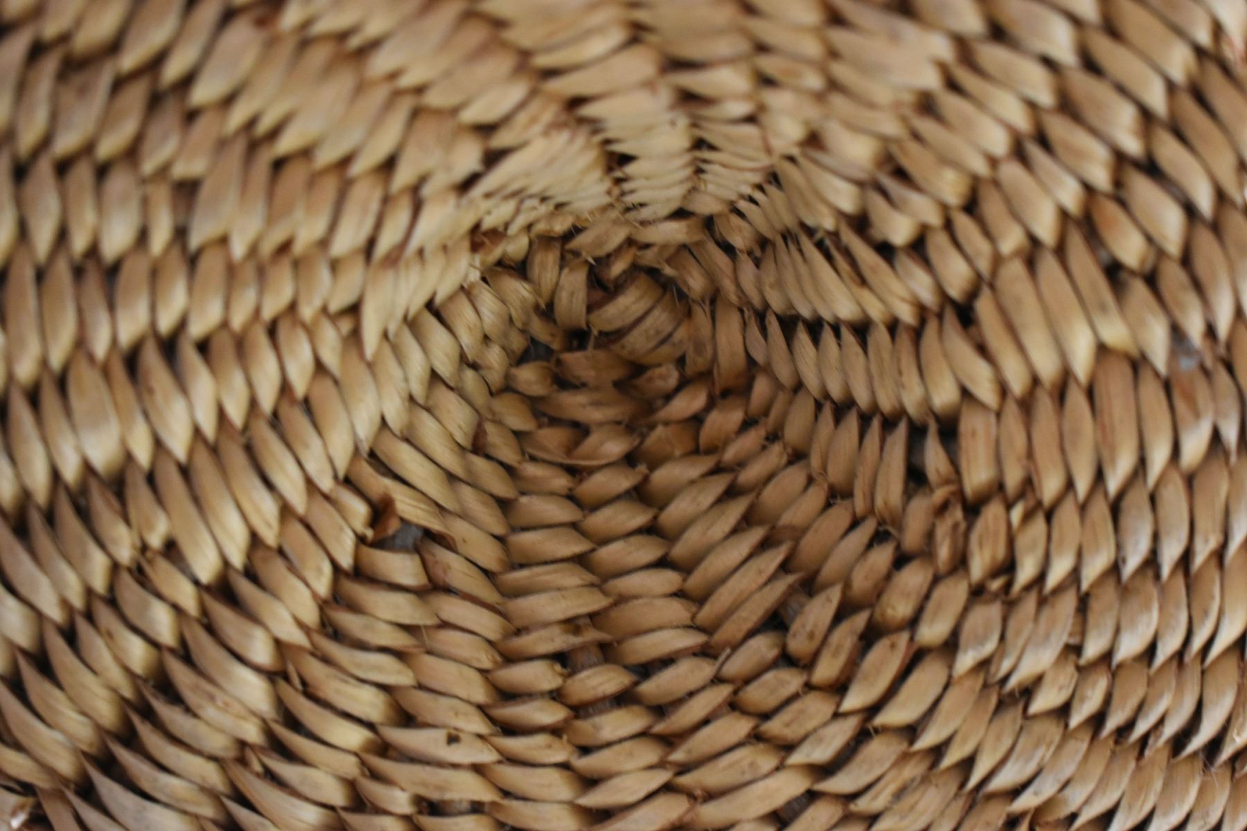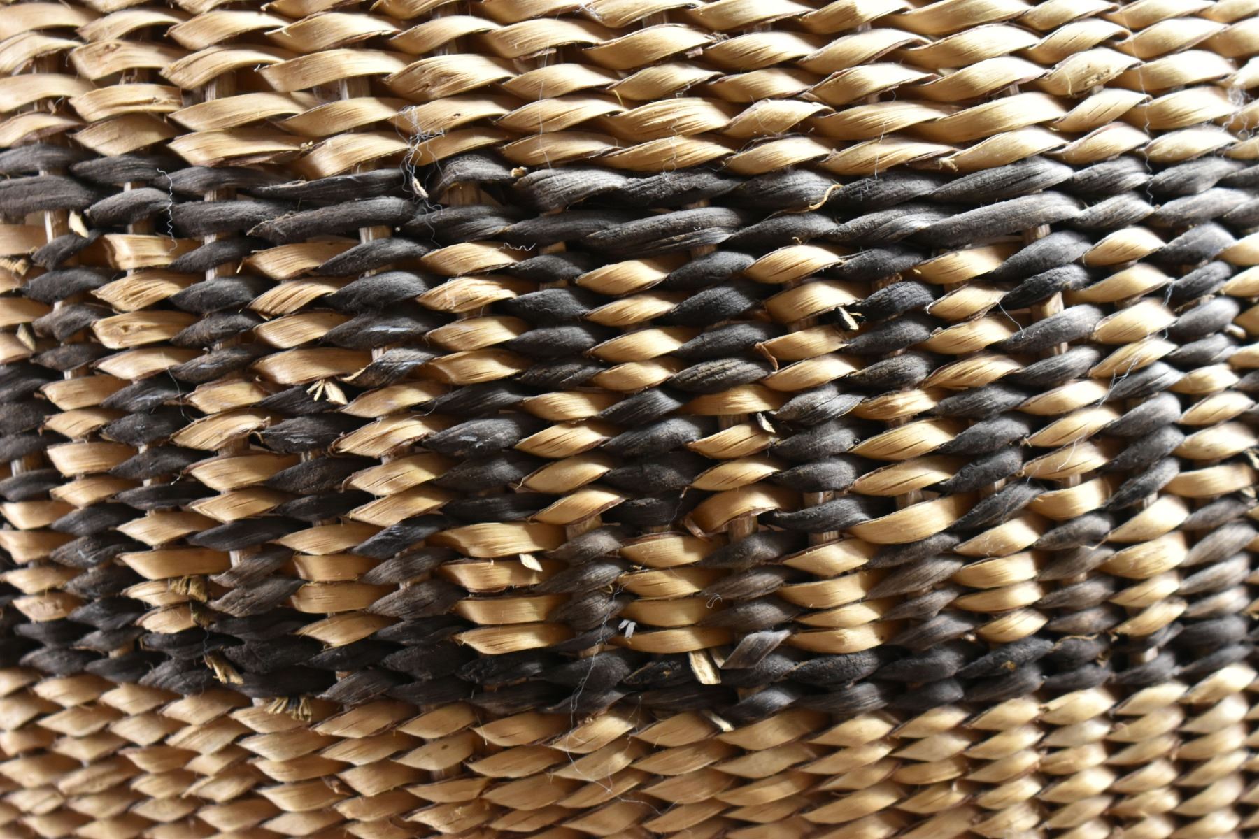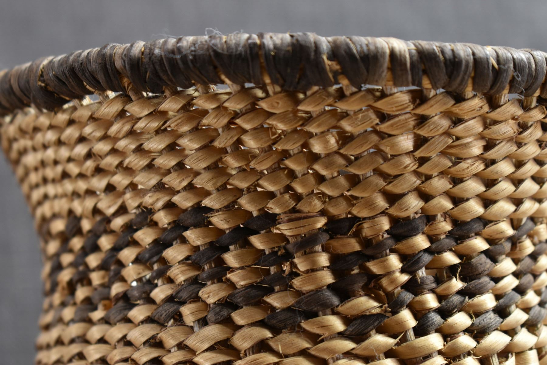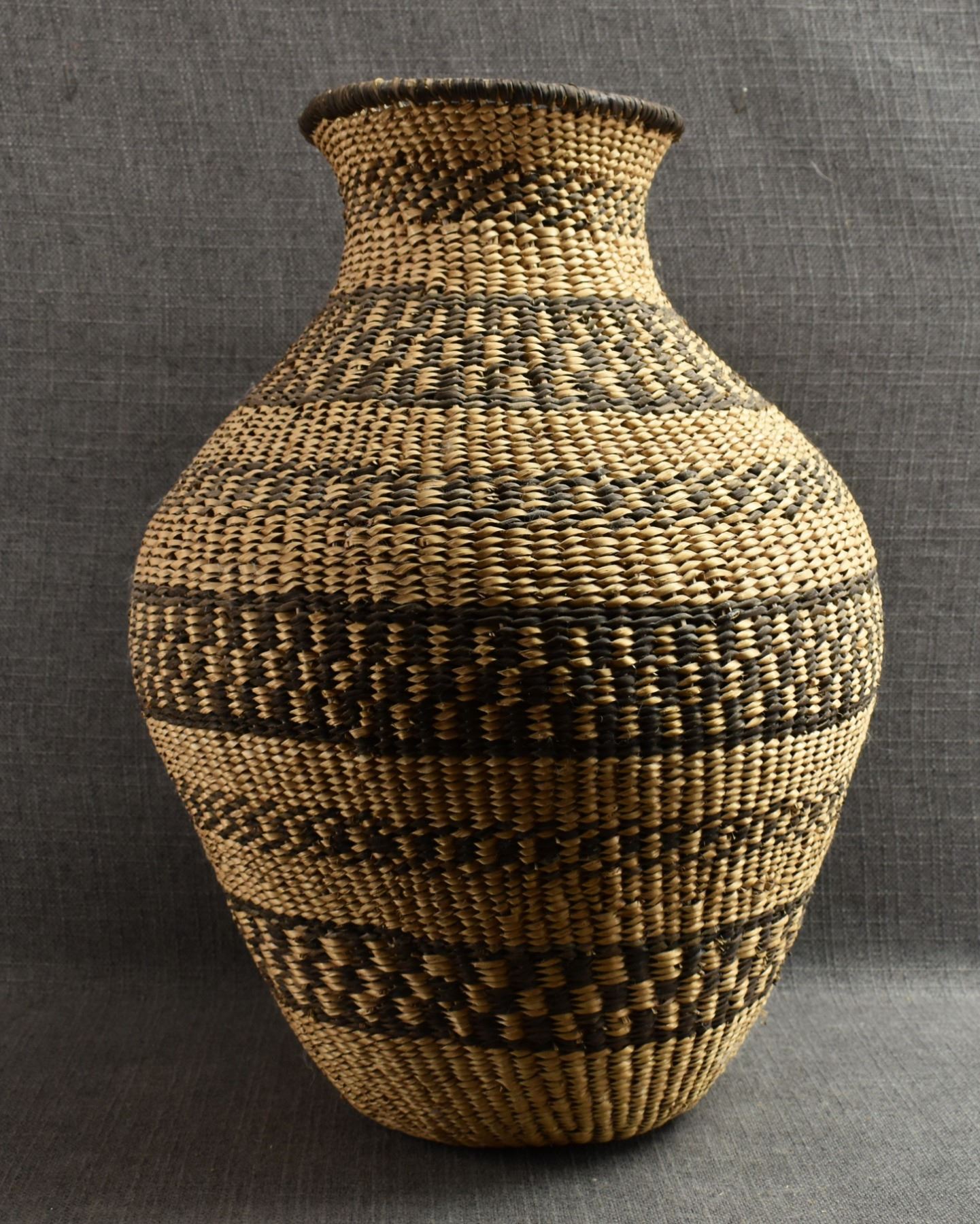 1980's white Mountain Apache. Hand woven banded design basketry olla. By Lina Guzman. 19'' x 14''