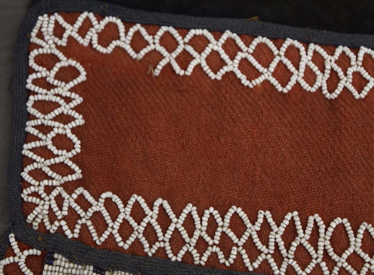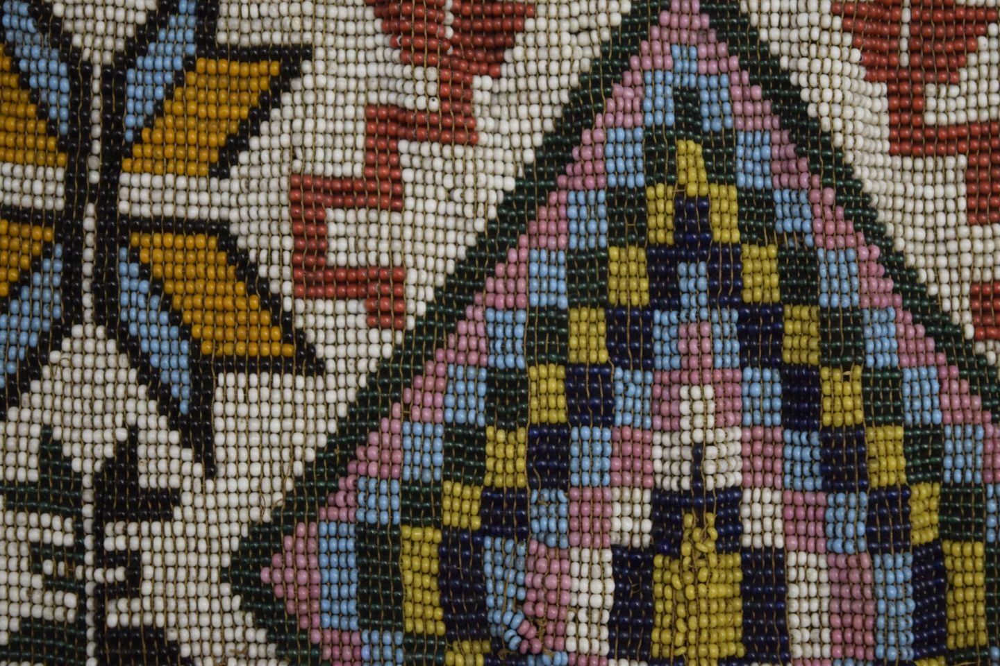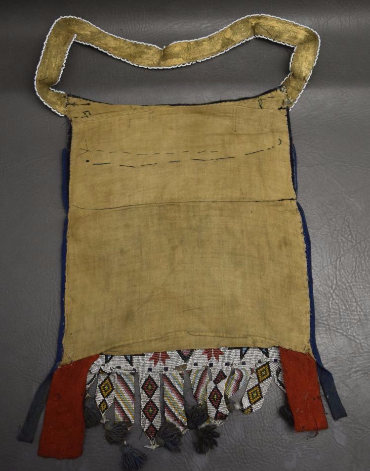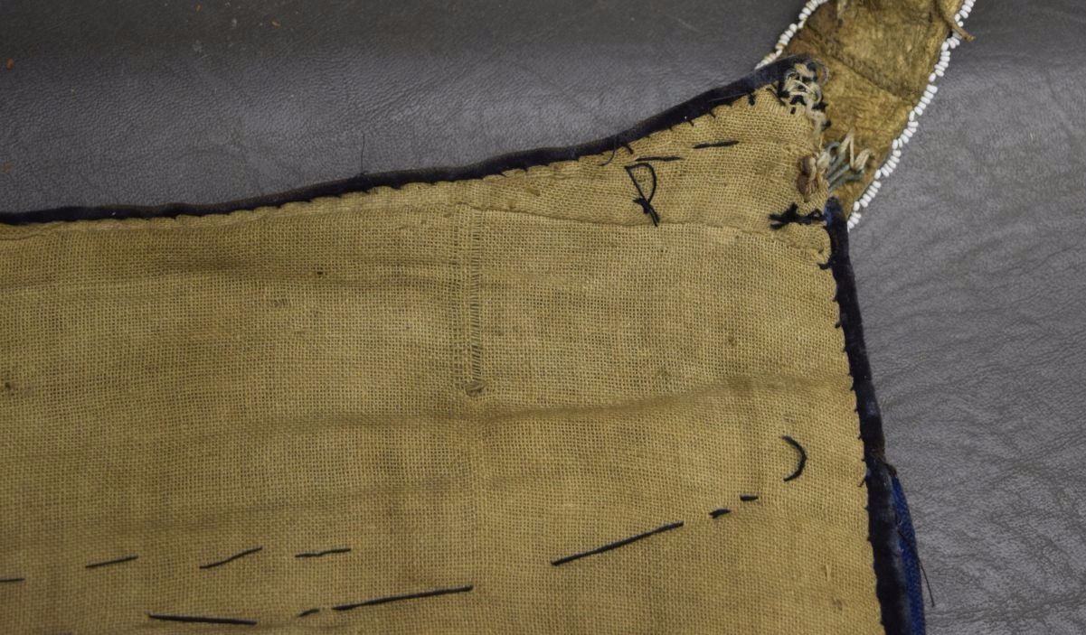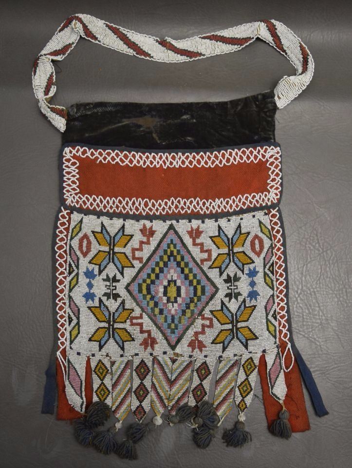 1890's geometric beaded design on cloth has minor damage and bead loss 15'' x 12'' excluding handle