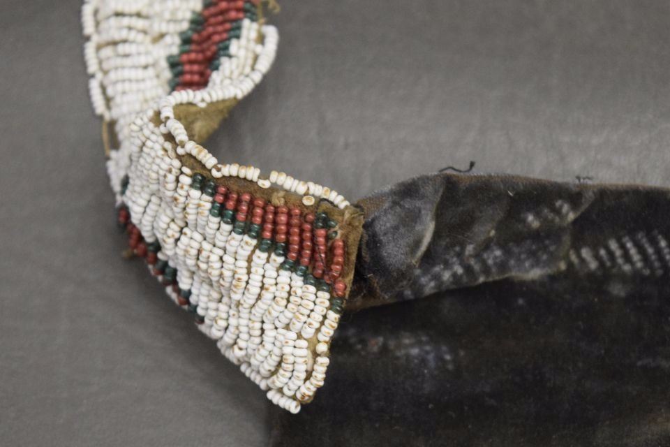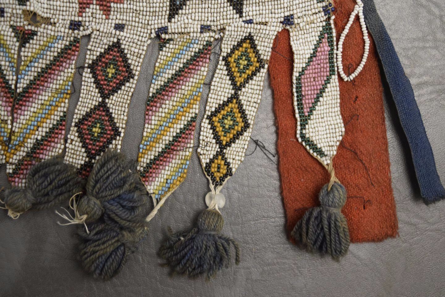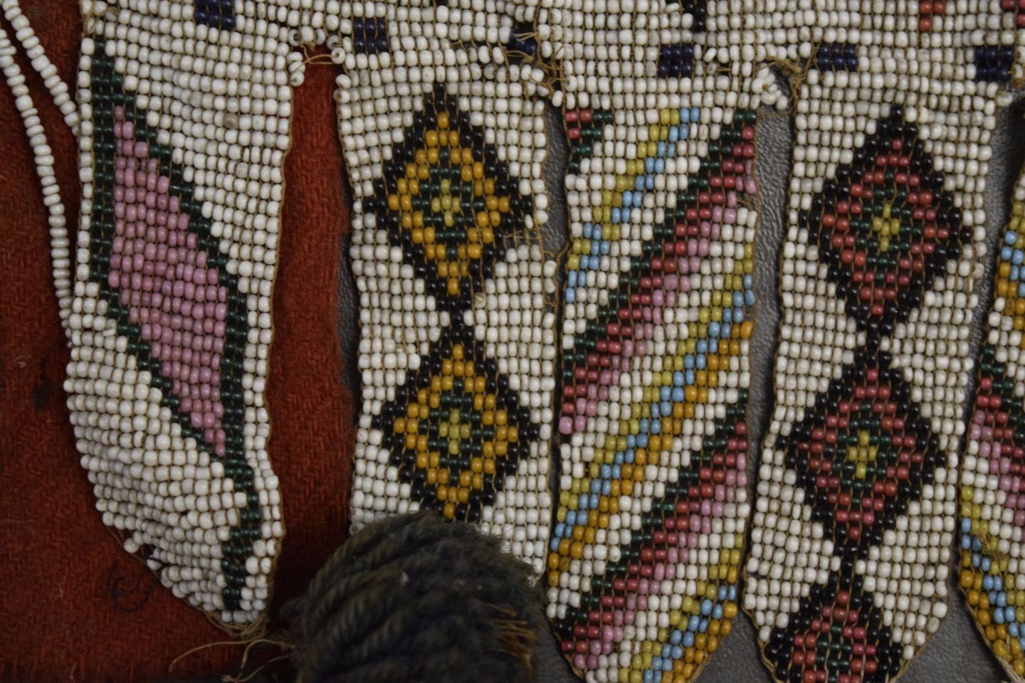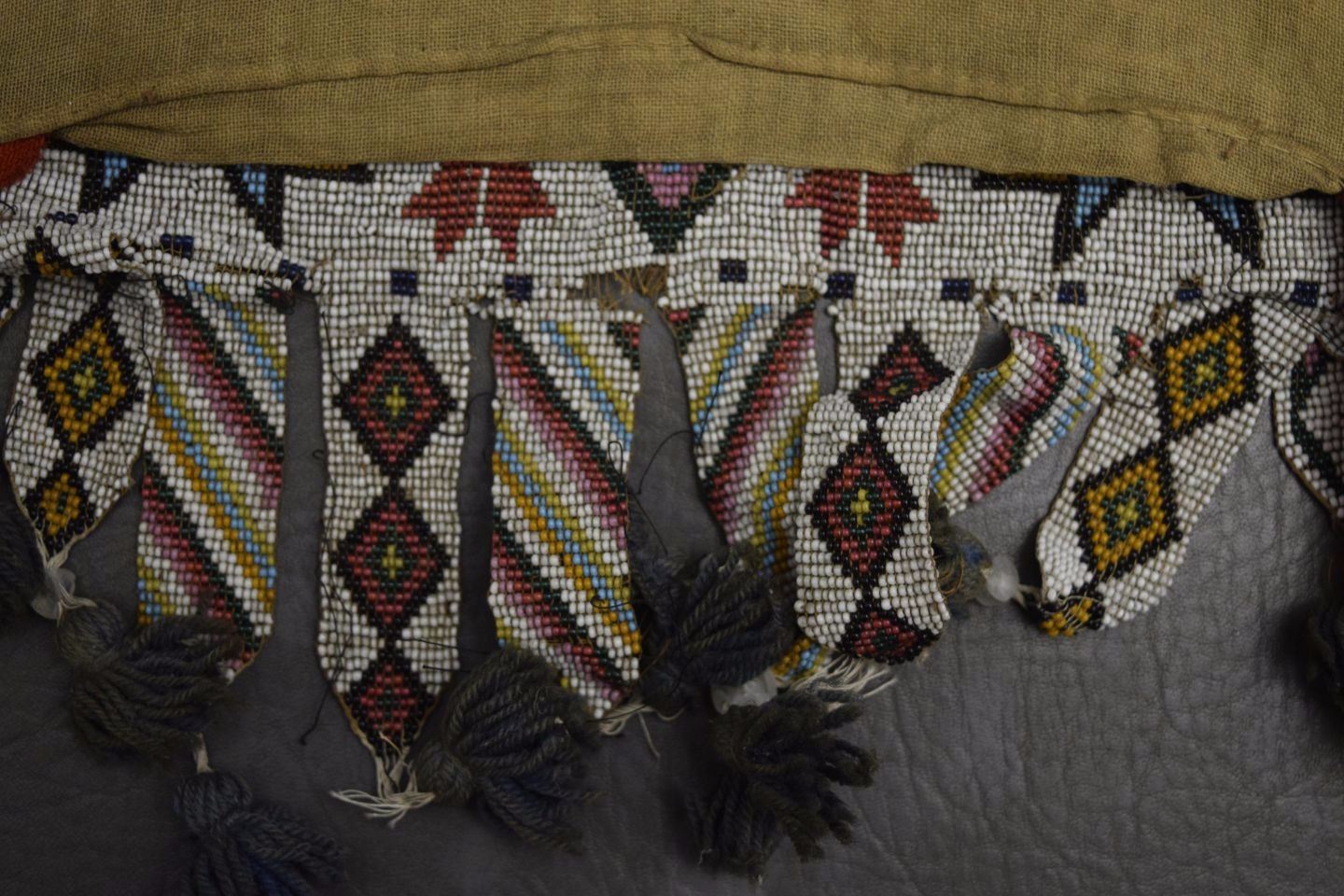 1890's geometric beaded design on cloth has minor damage and bead loss 15'' x 12'' excluding handle