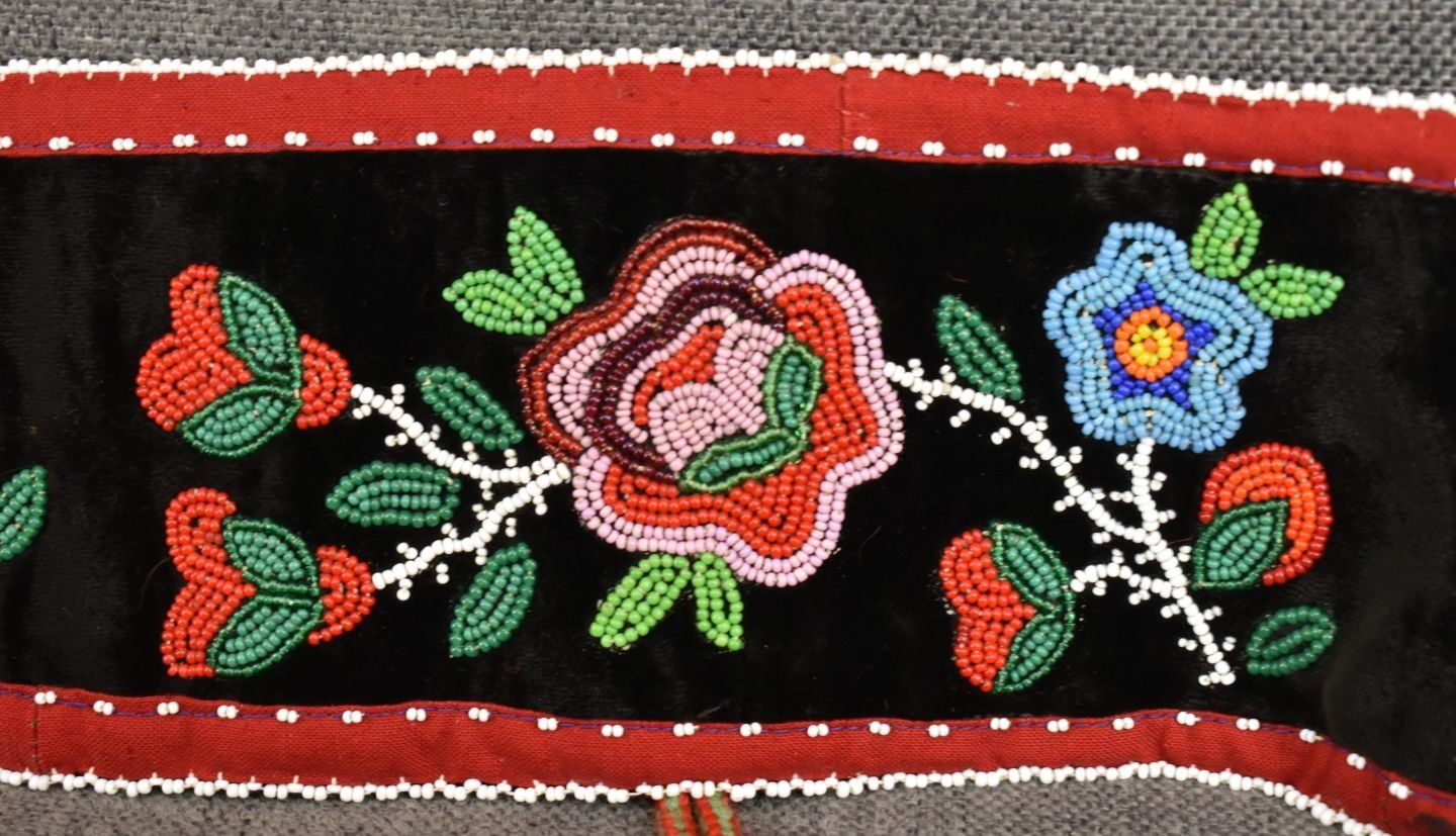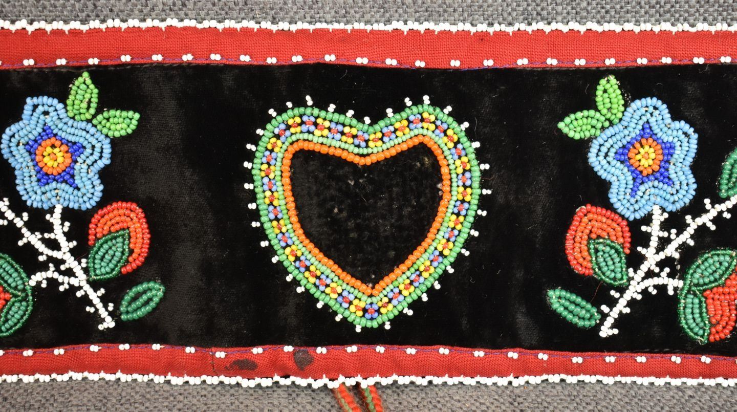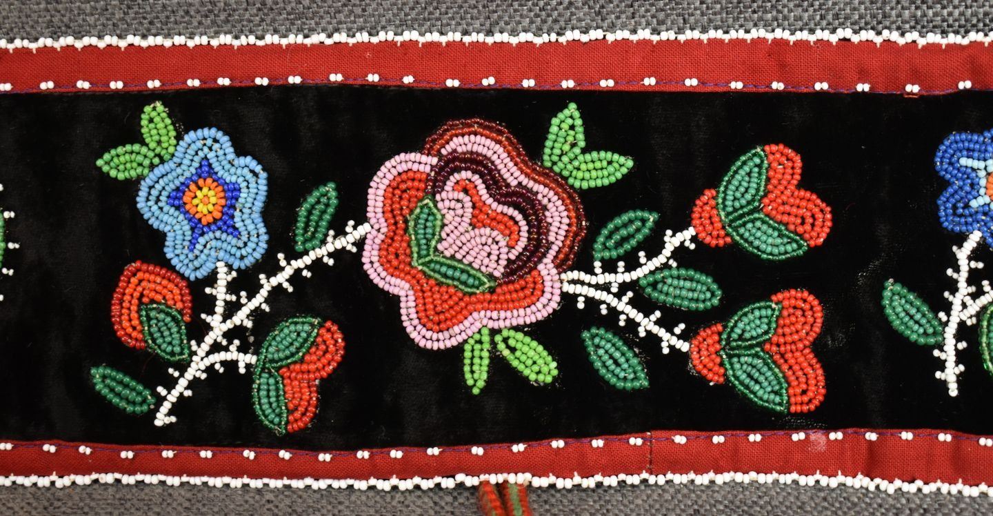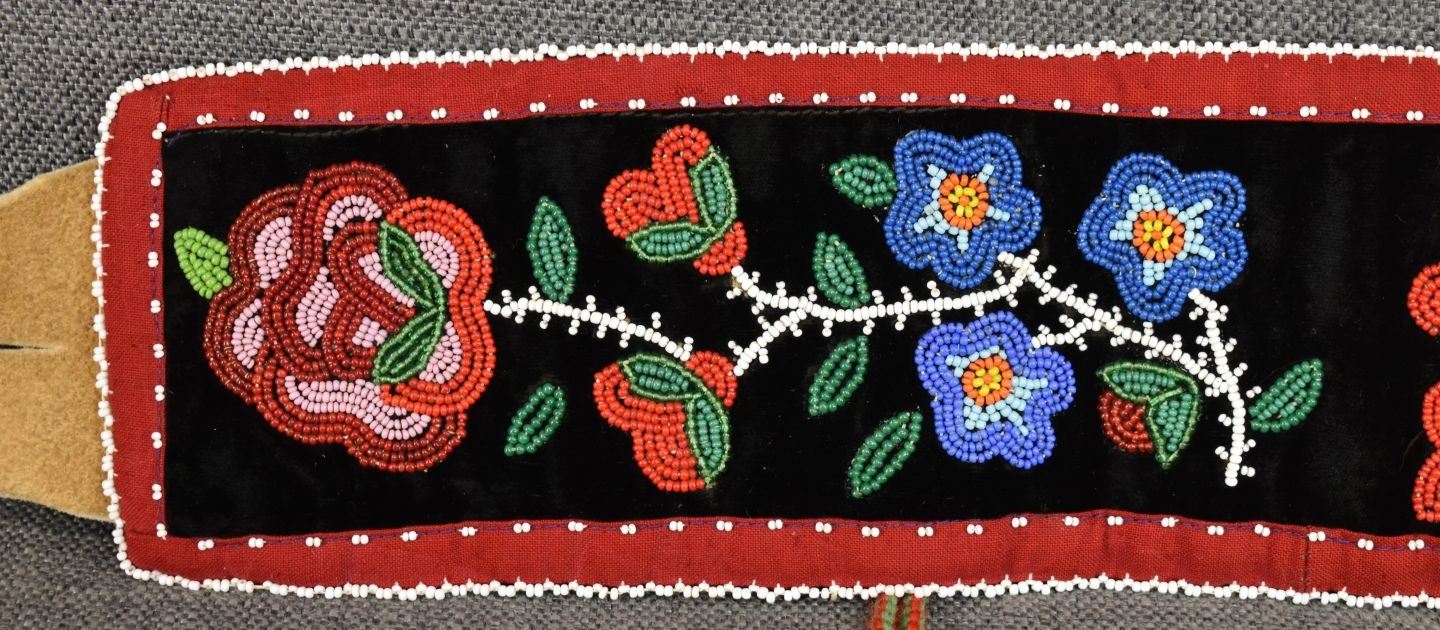 20th century woodland Indian, hand made with thread sown floral design on velvet and trade cloth 4.5" x 39" plus leather buckle