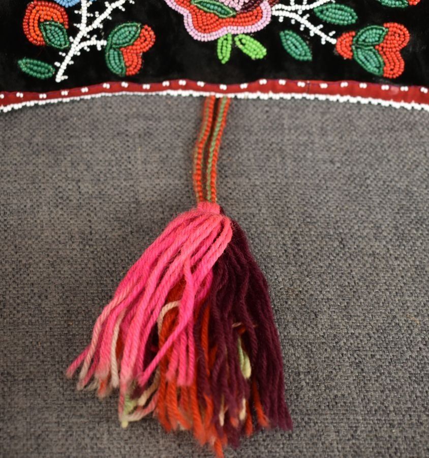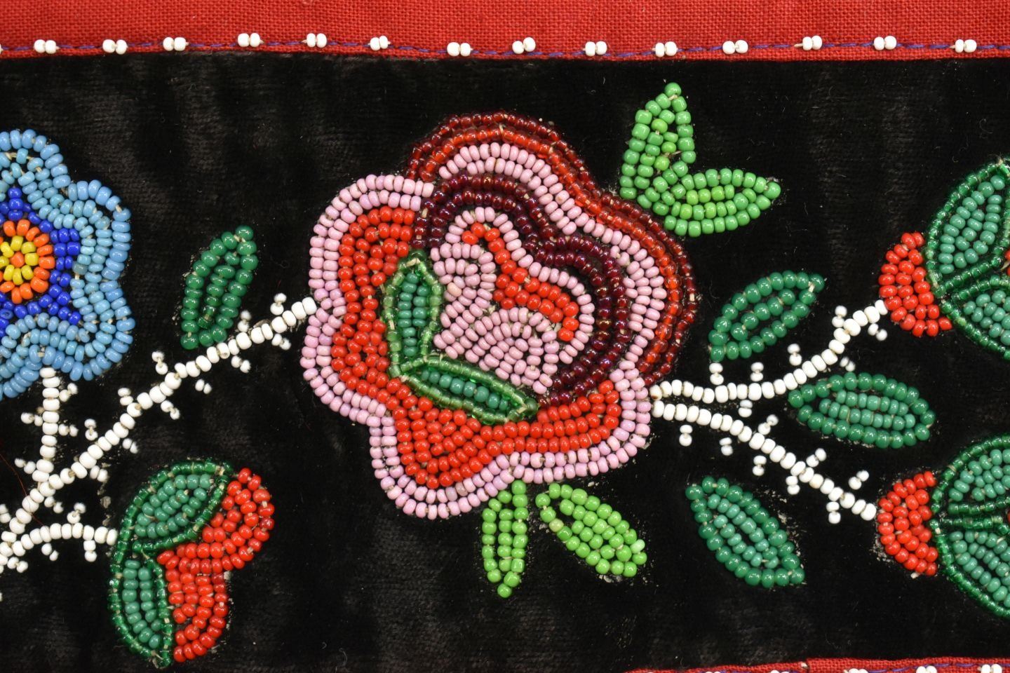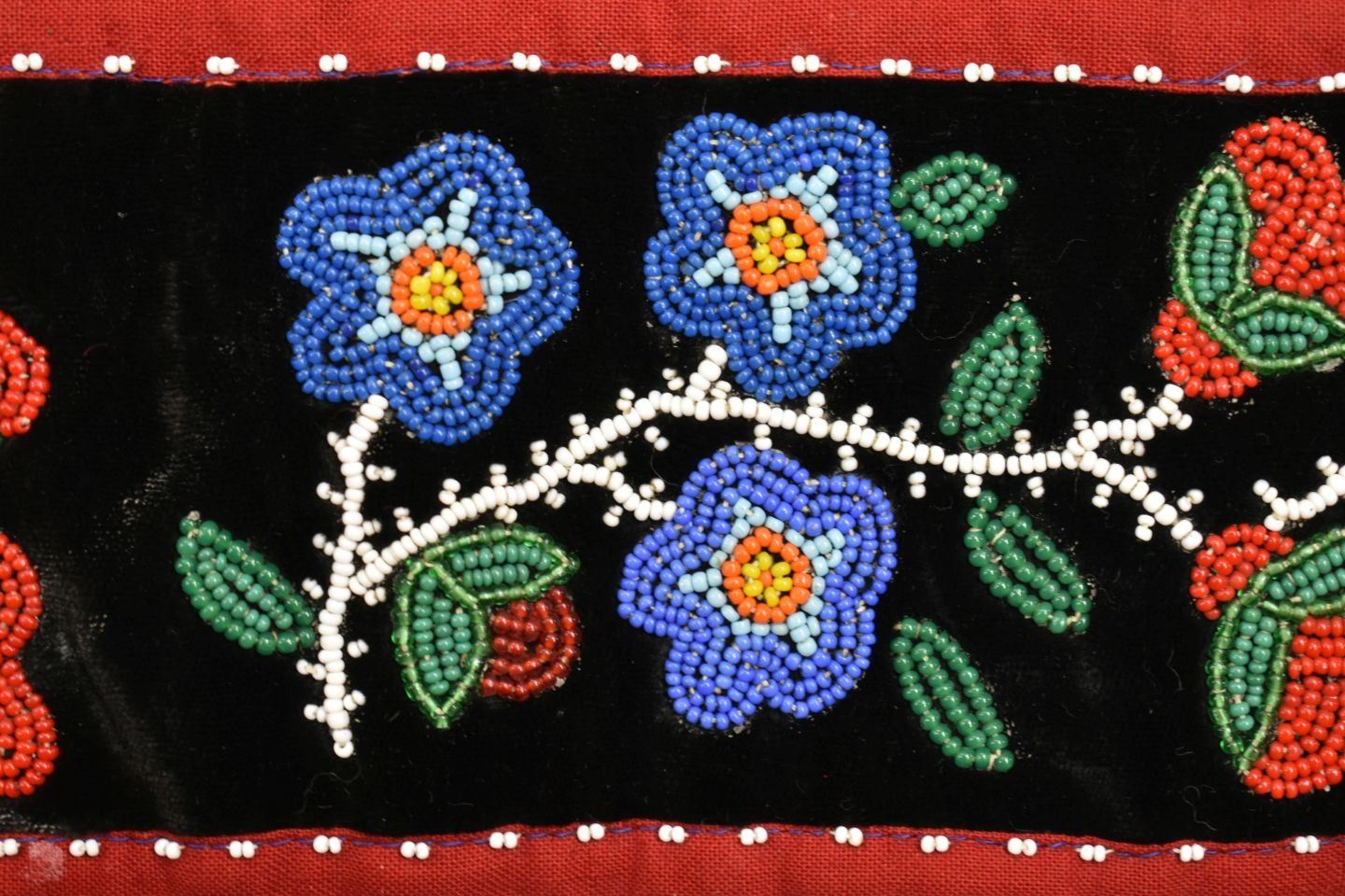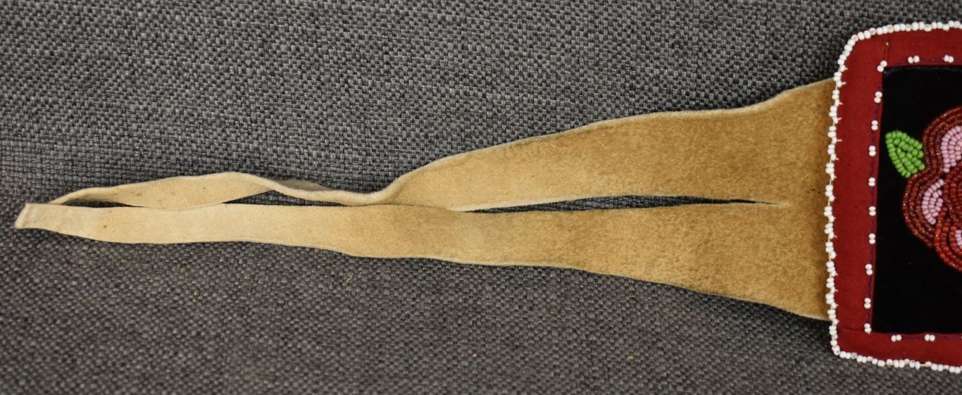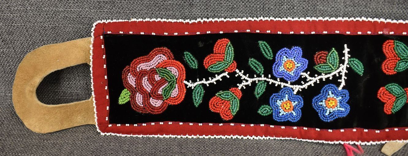20th century woodland Indian, hand made with thread sown floral design on velvet and trade cloth 4.5" x 39" plus leather buckle