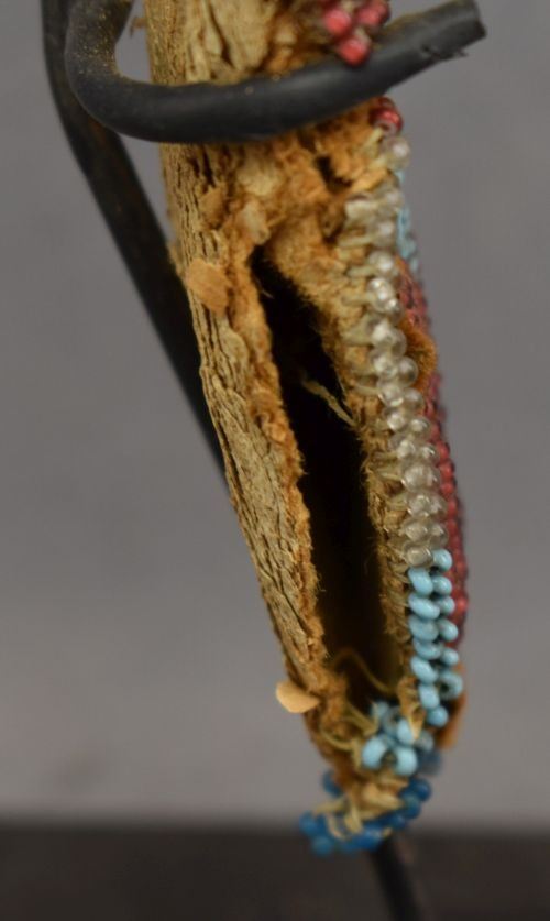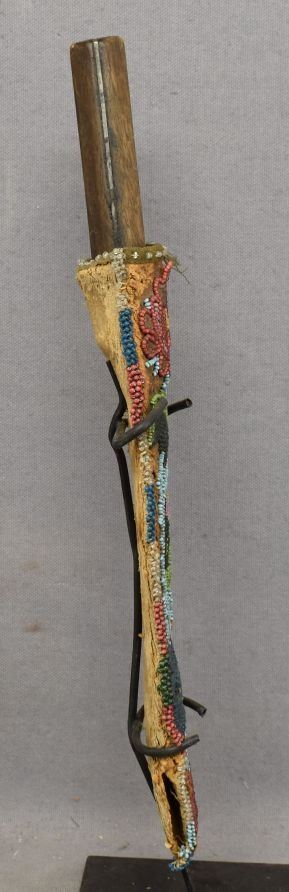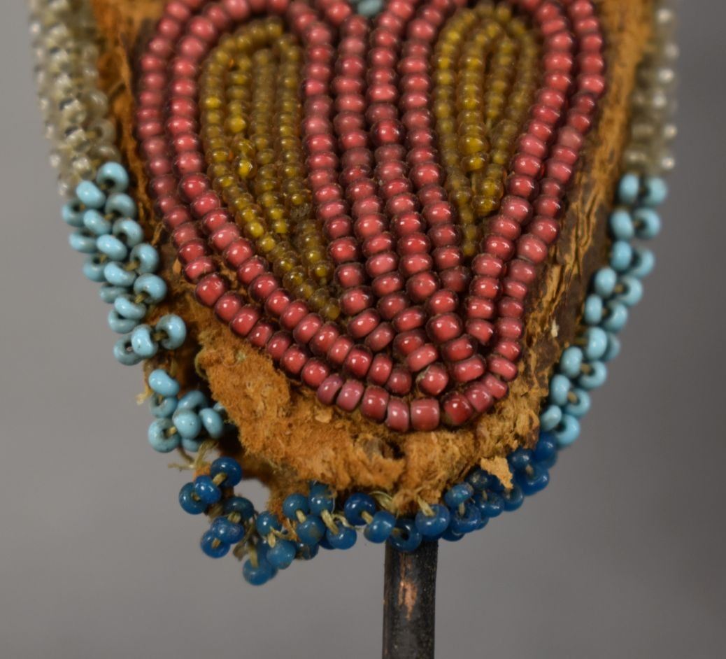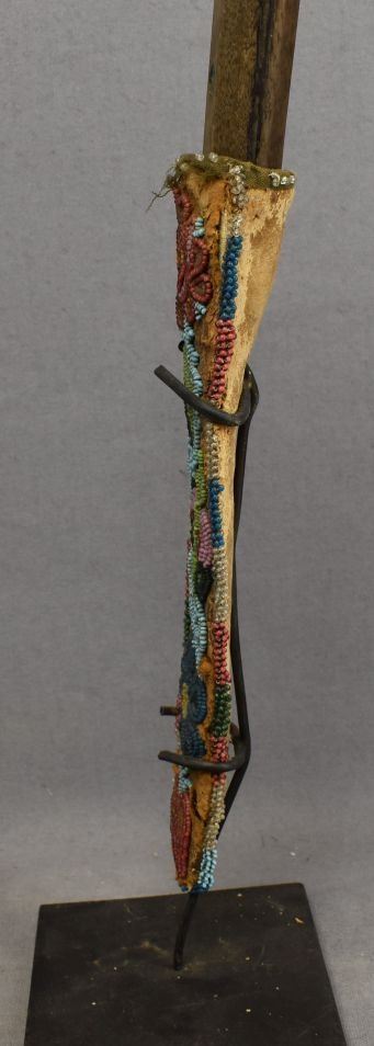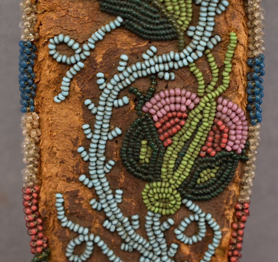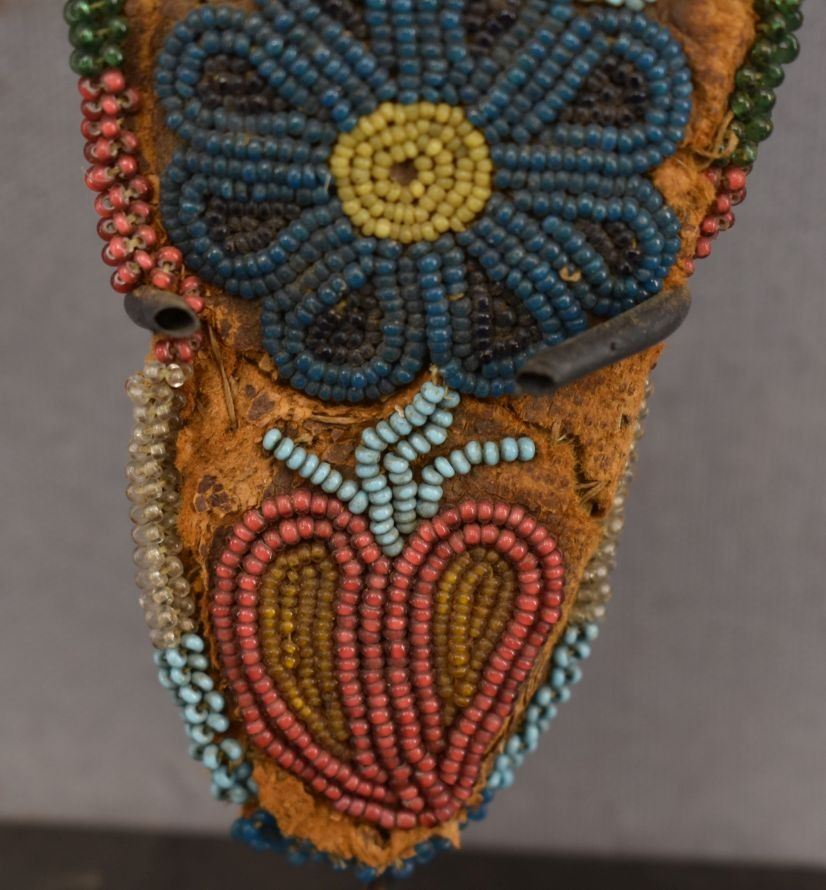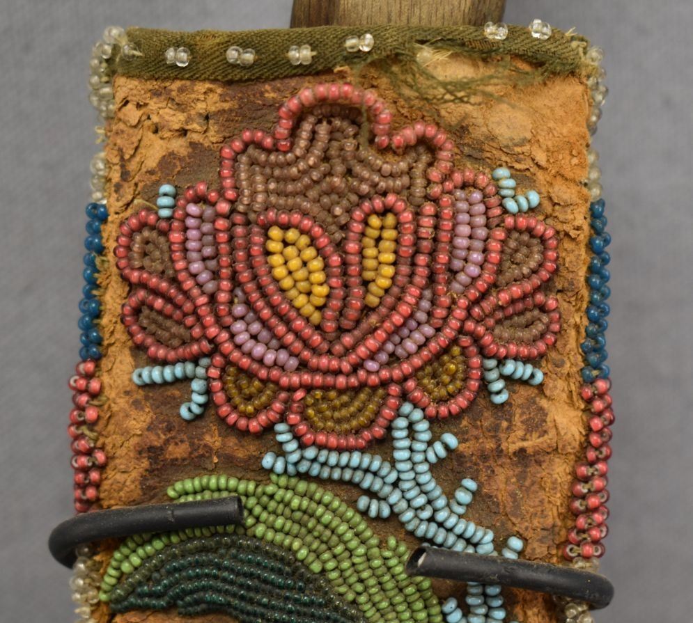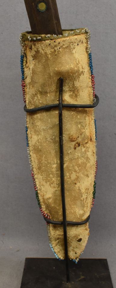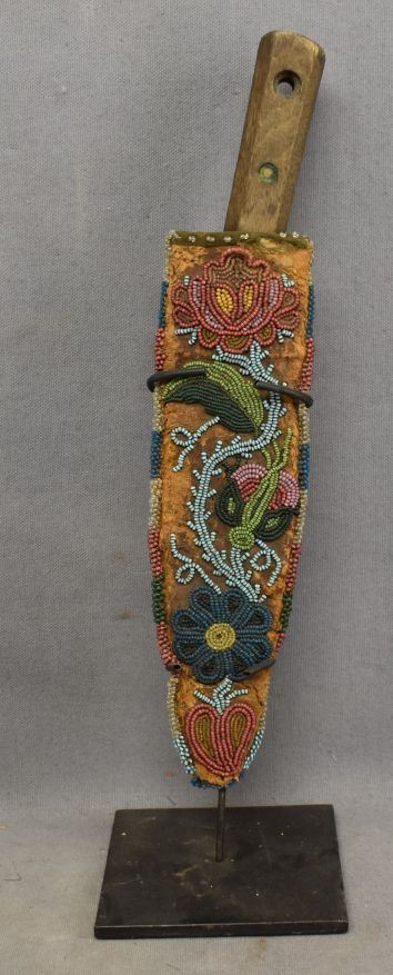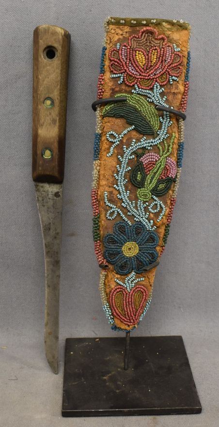 1900's hand beaded floral design on hide 9'' x 2'' has damage and antique knife 10'' long
