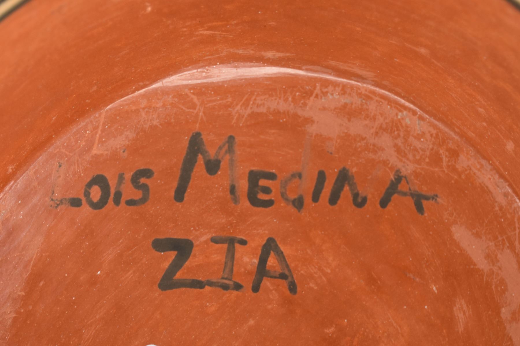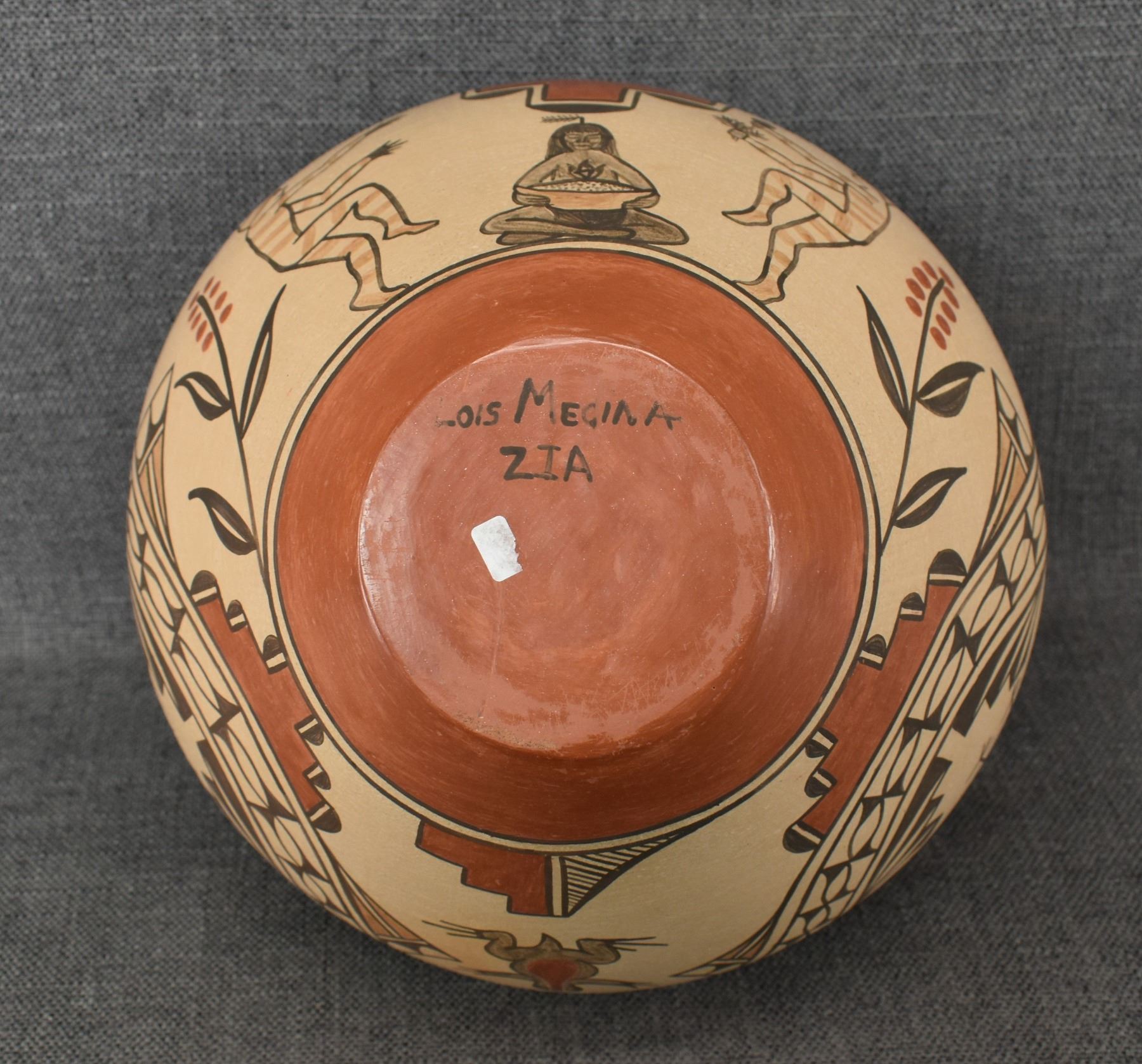 1980's Zia, hand coiled with polychrome painted and kiva design signed Lois Medina. 8.5" x 10"