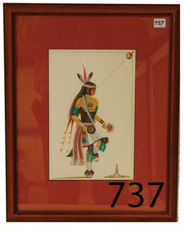 ca. LAST Q 20TH CENT. original tempera of pueblo dancer, by Rafael Medina, titled “Bird Society Dance”,11.5” x 7.5”.