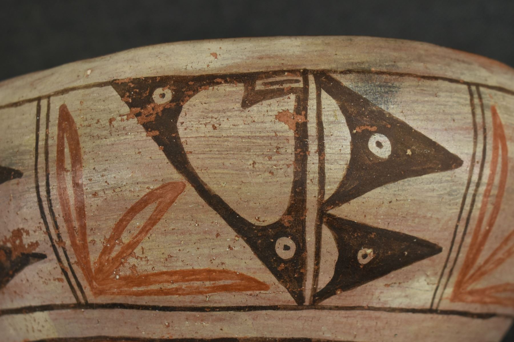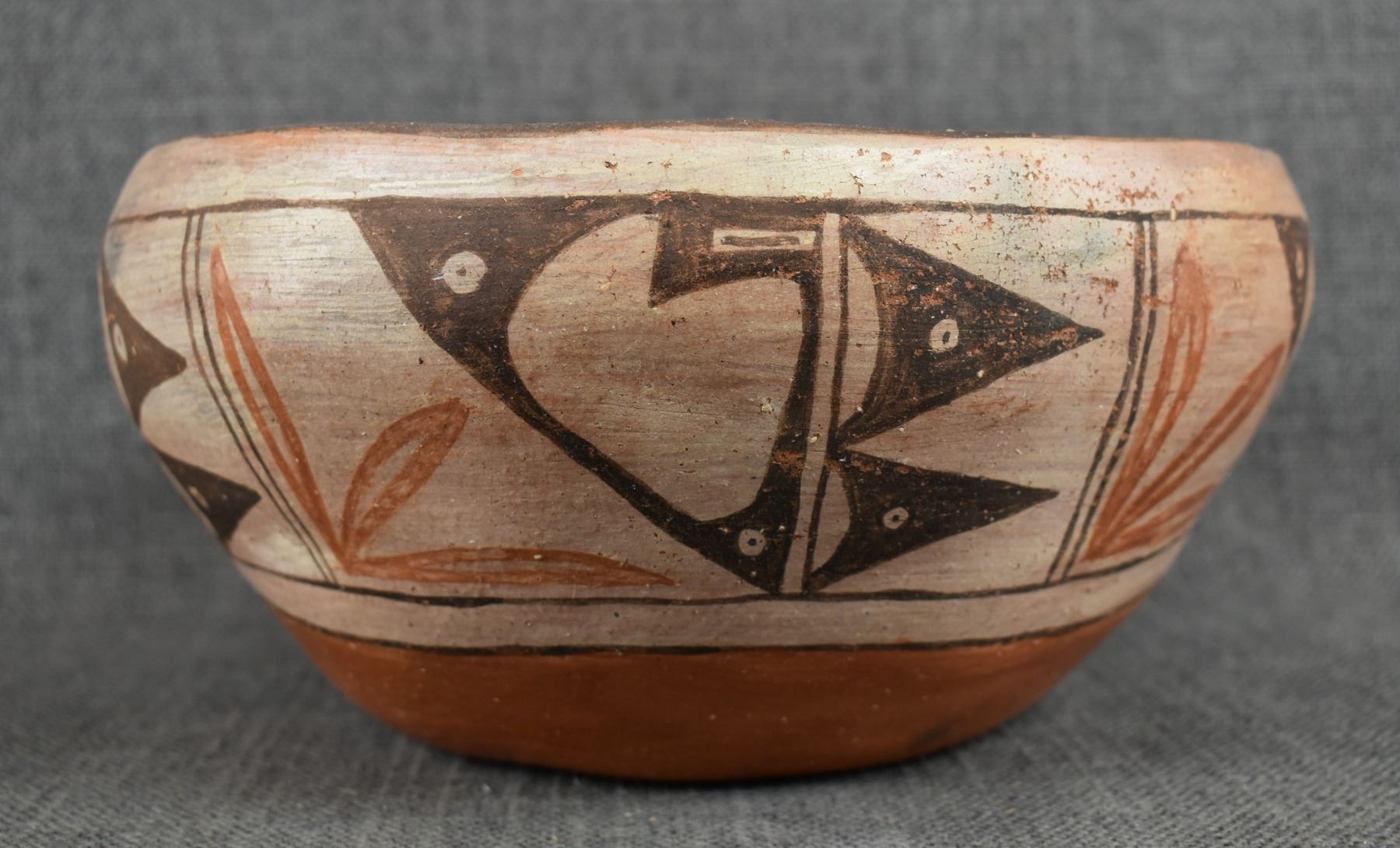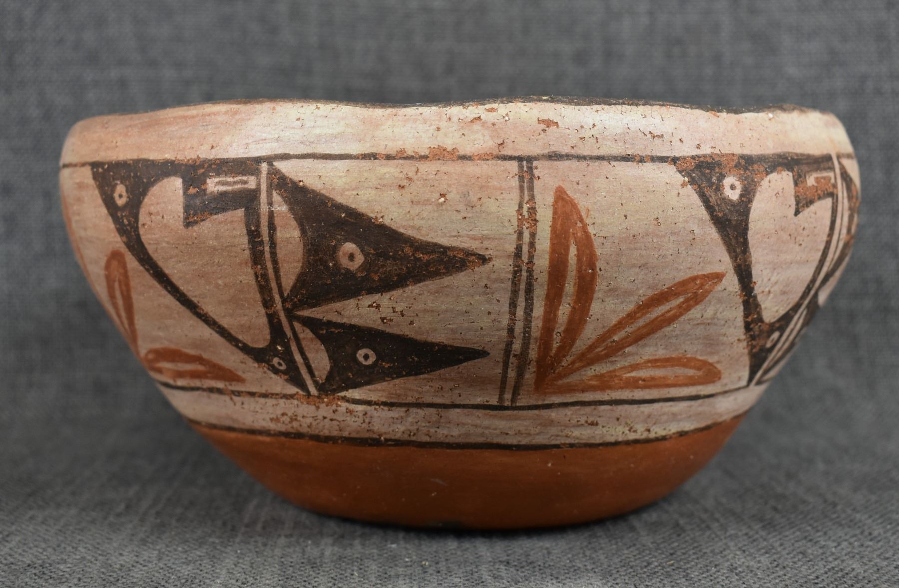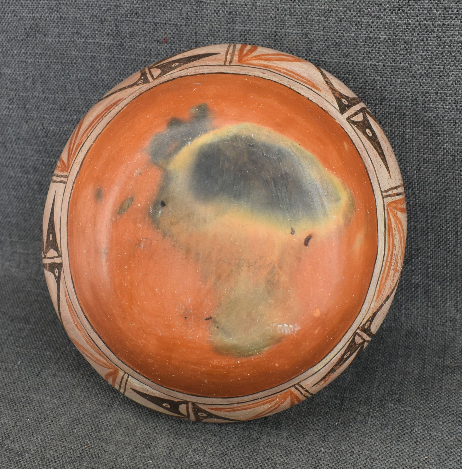 1950's Zia. Hand coiled and painted polychrome design pottery bowl. 4.75'' x 9''