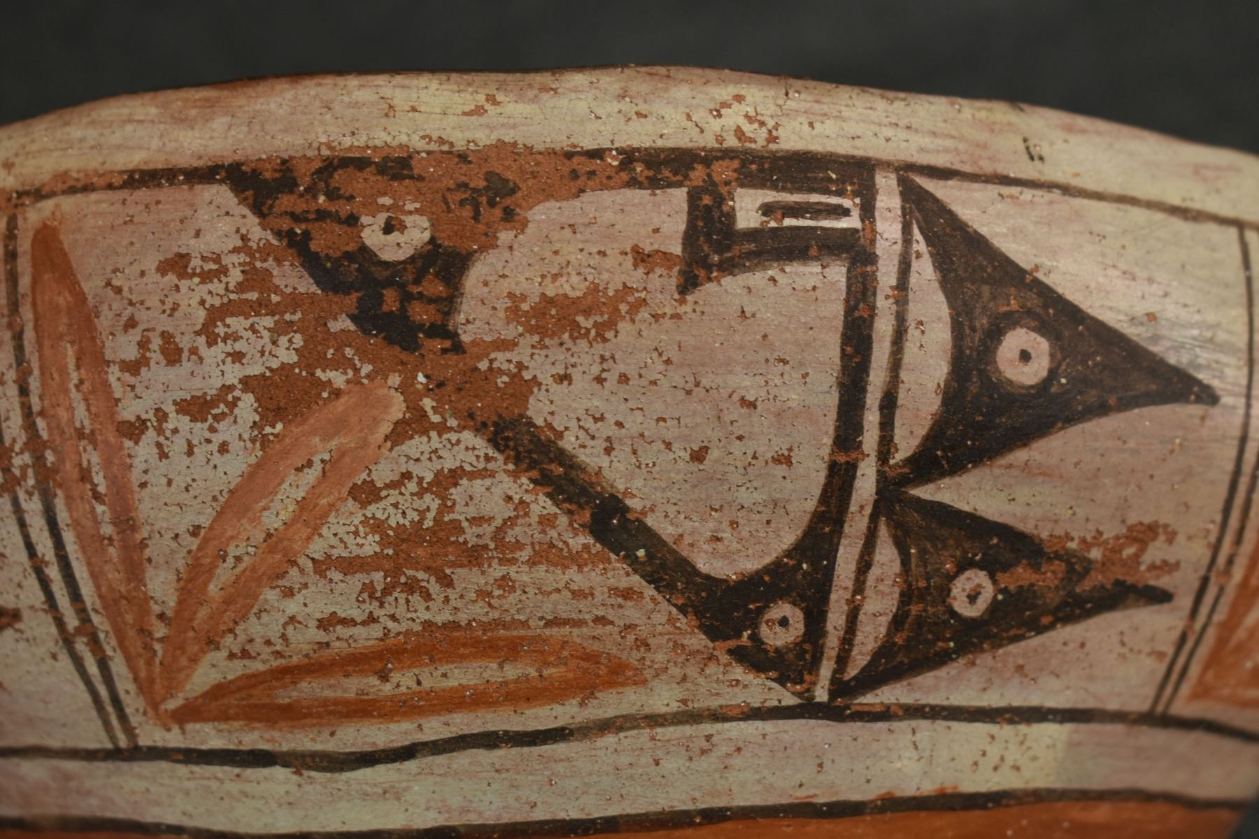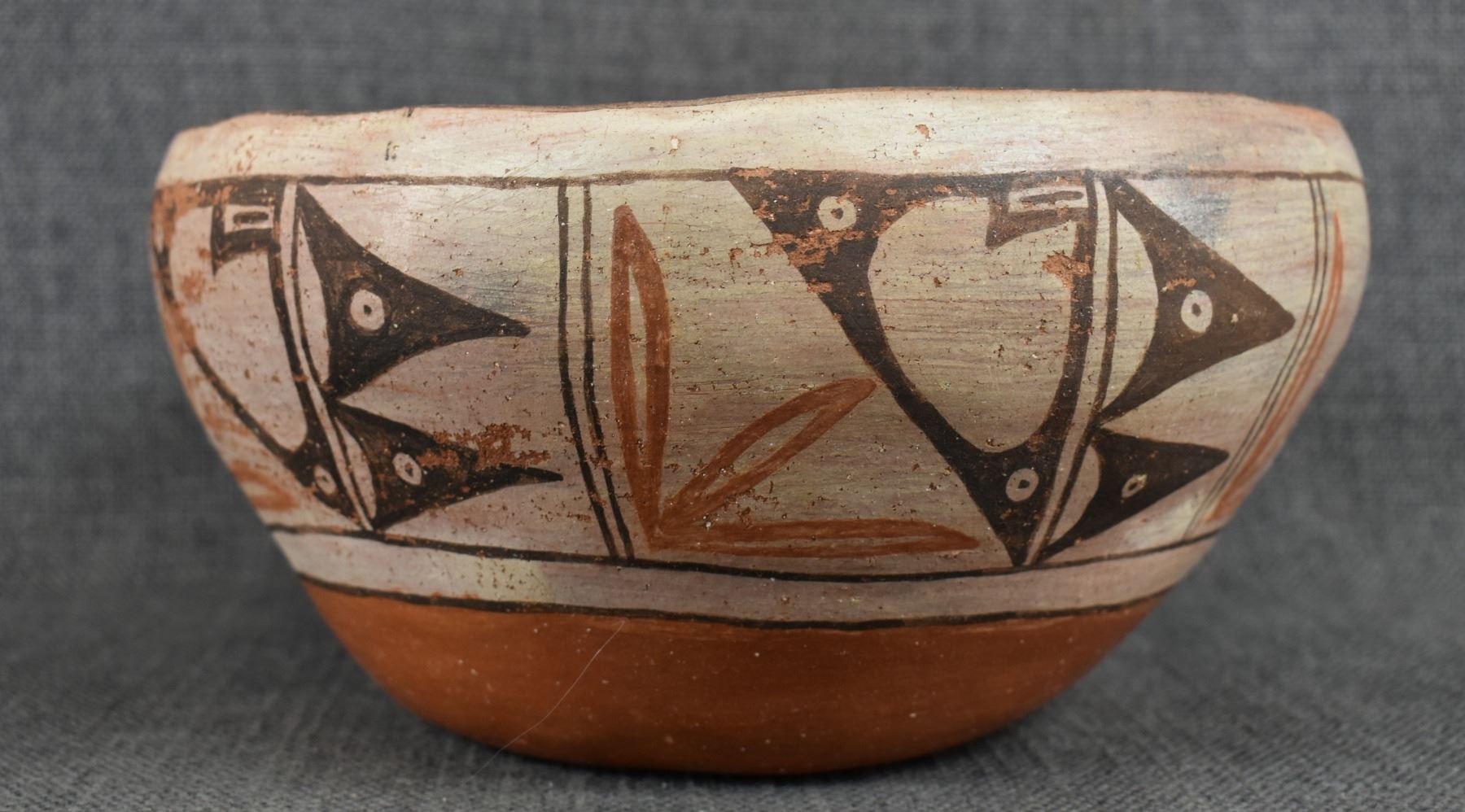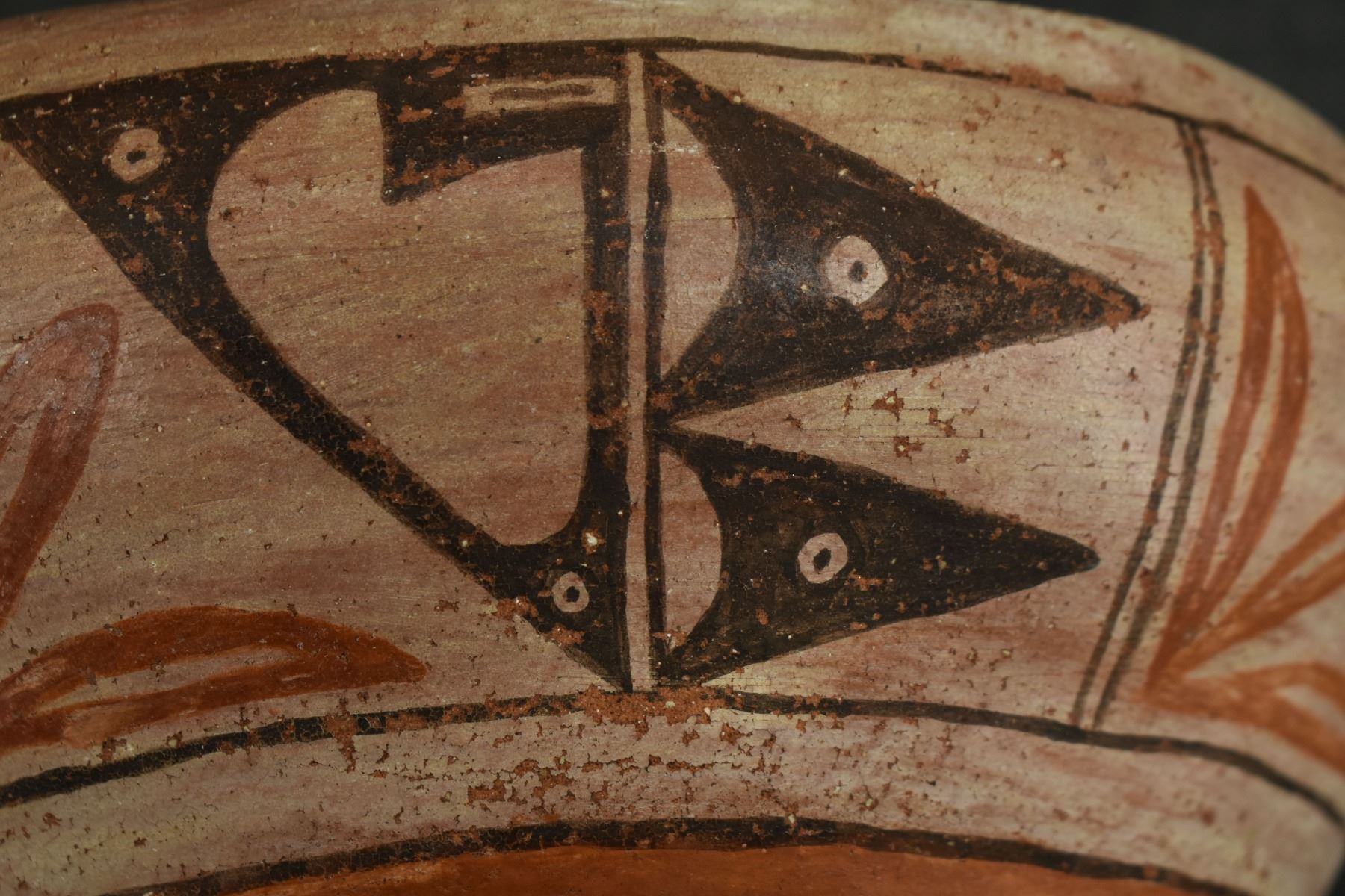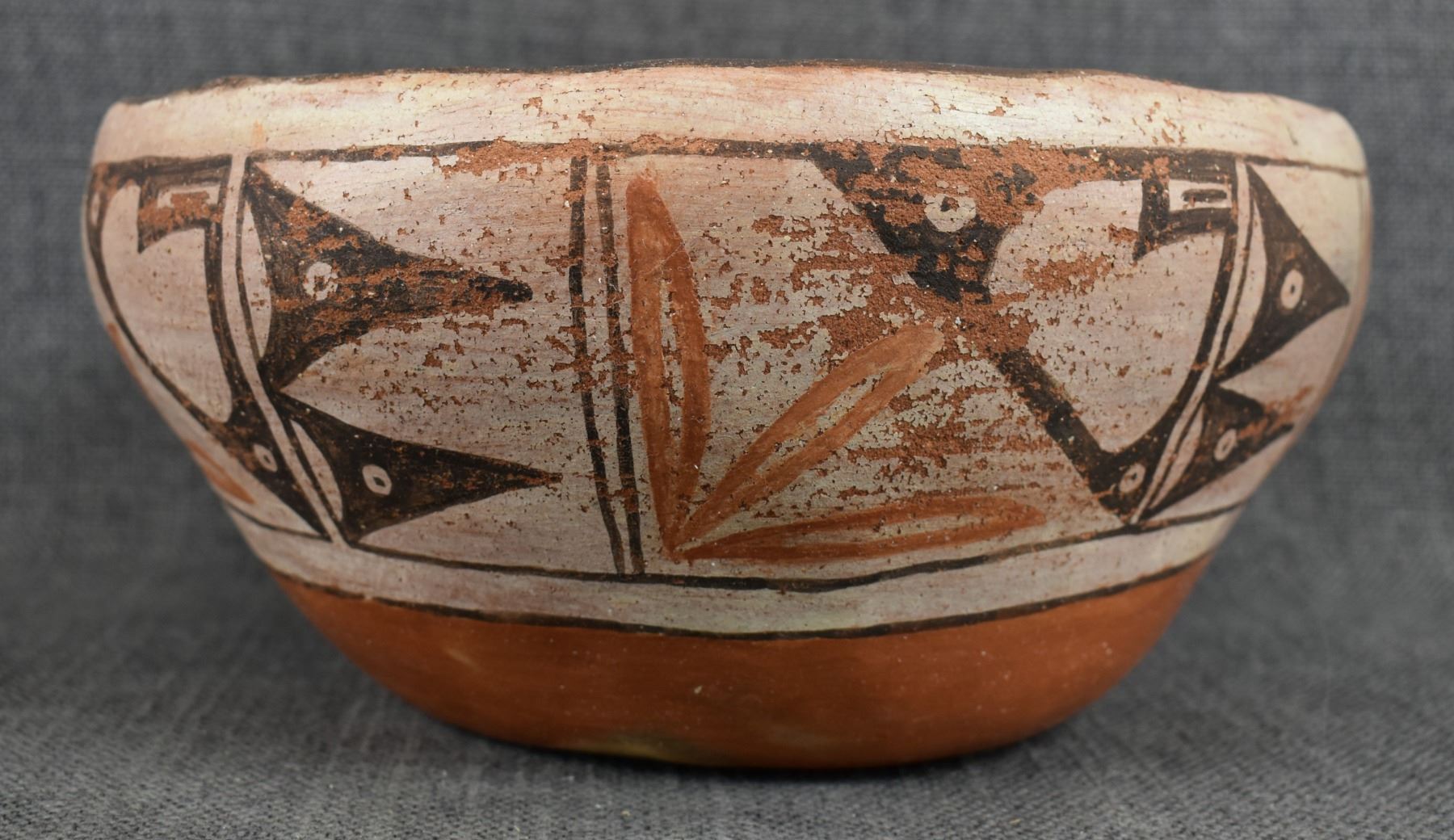 1950's Zia. Hand coiled and painted polychrome design pottery bowl. 4.75'' x 9''