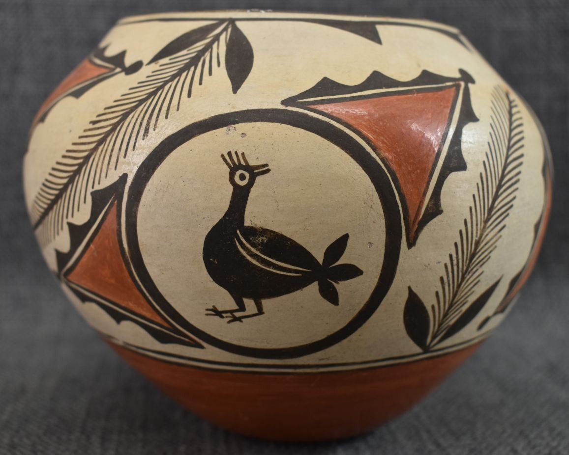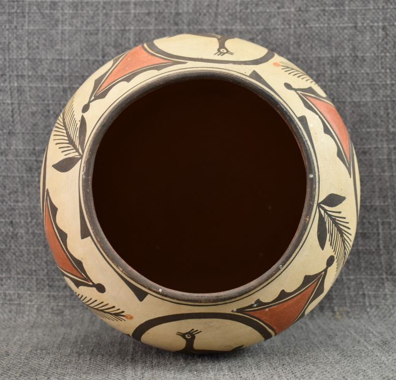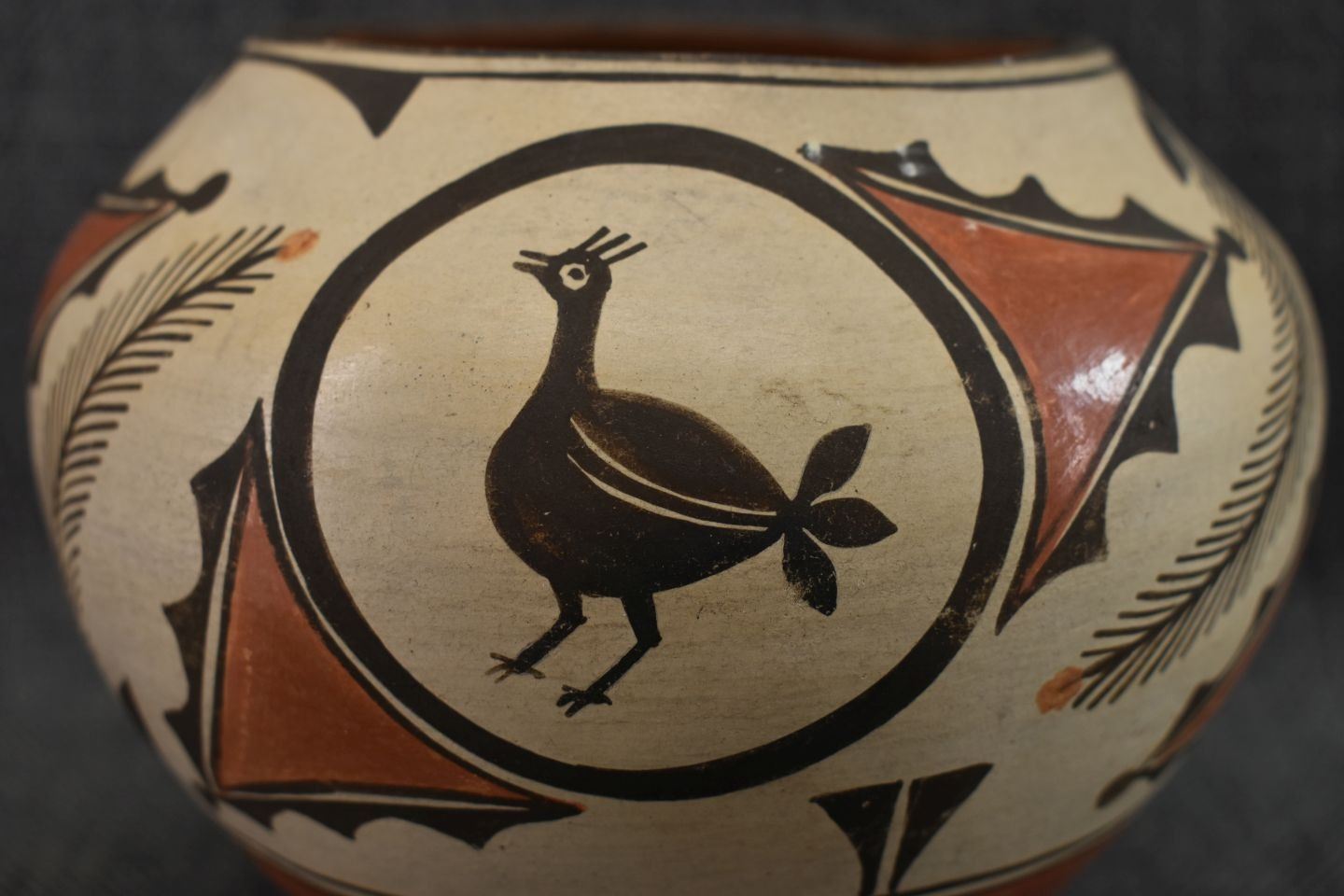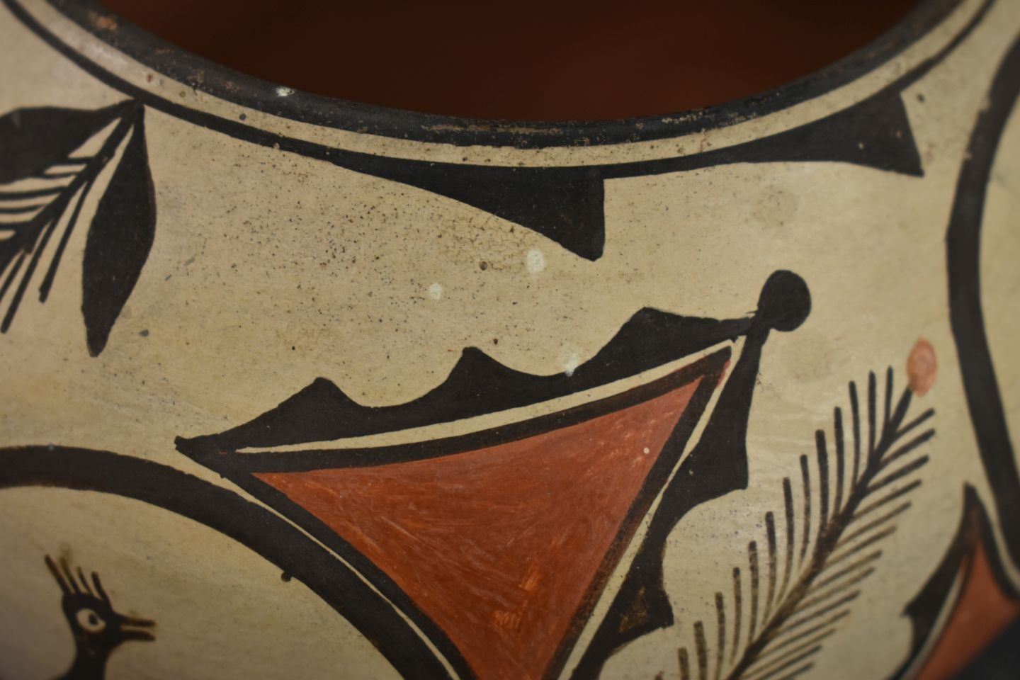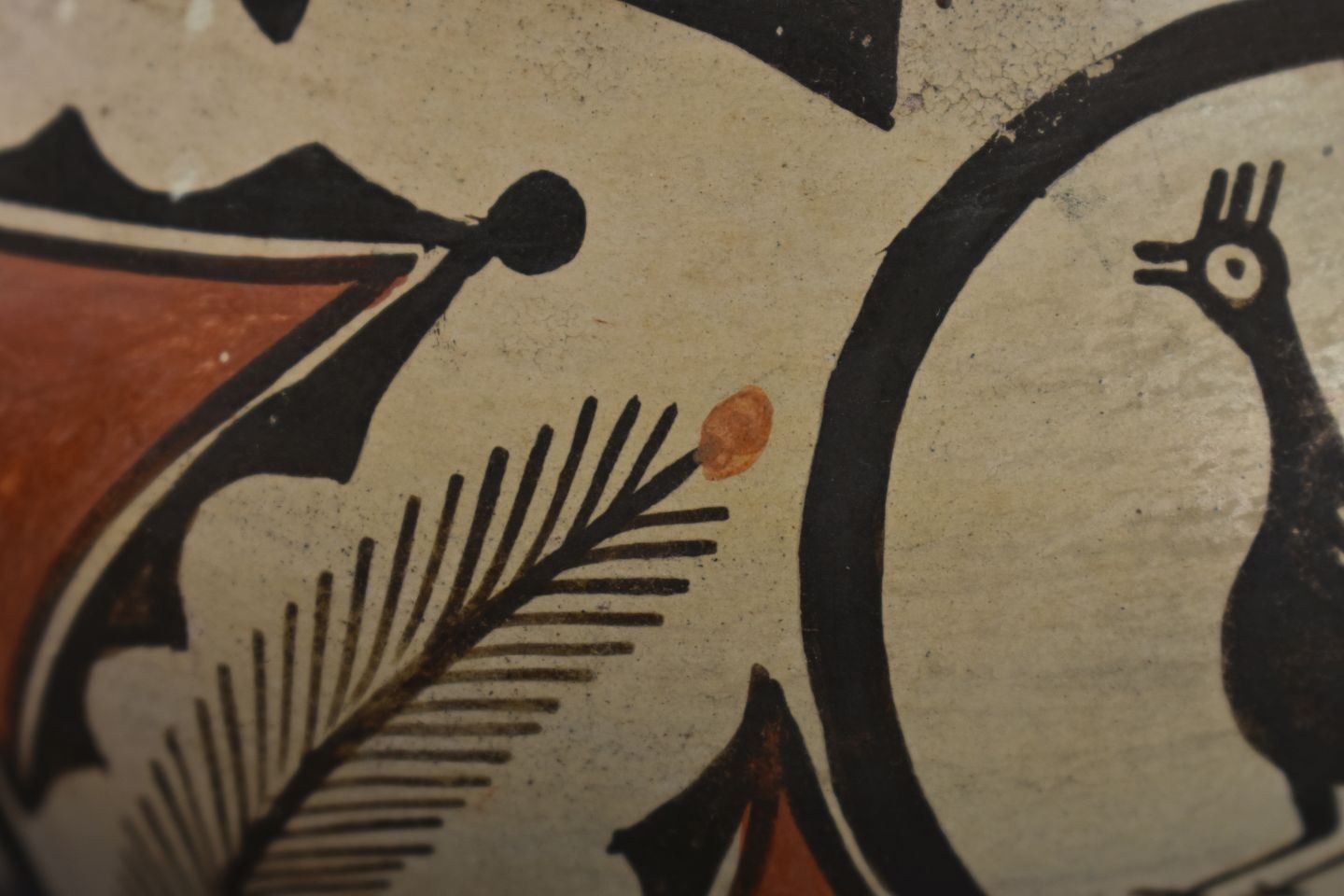 1950's Zia, hand coiled with polychrome painted geometric floral and bird design 4.75" x 6"