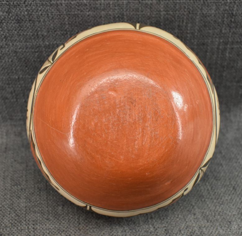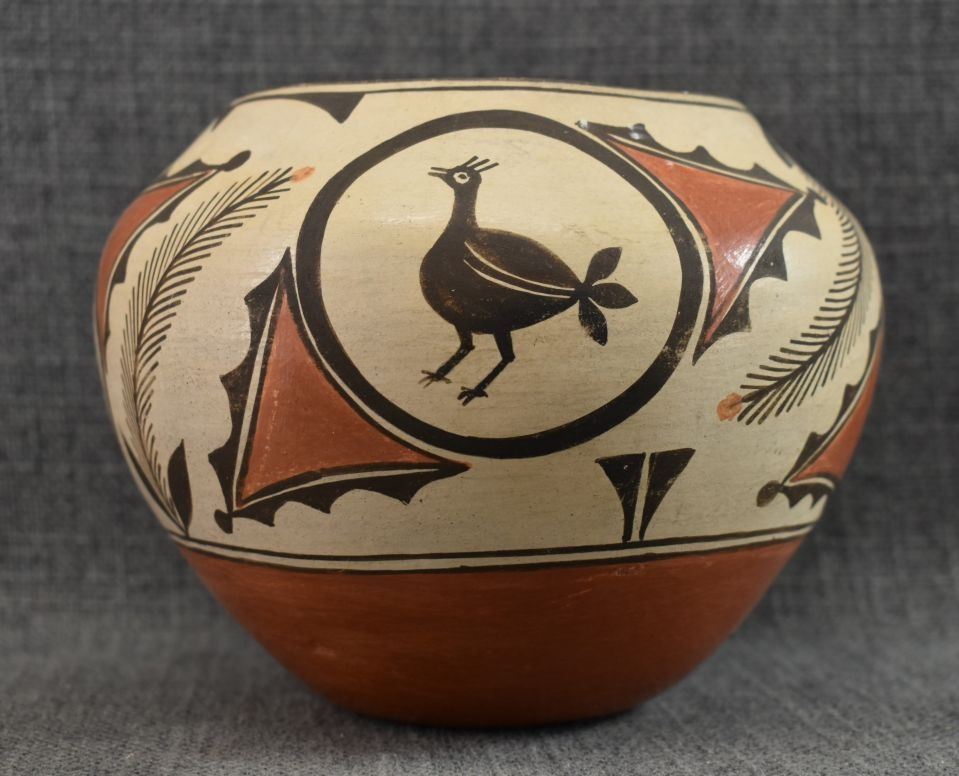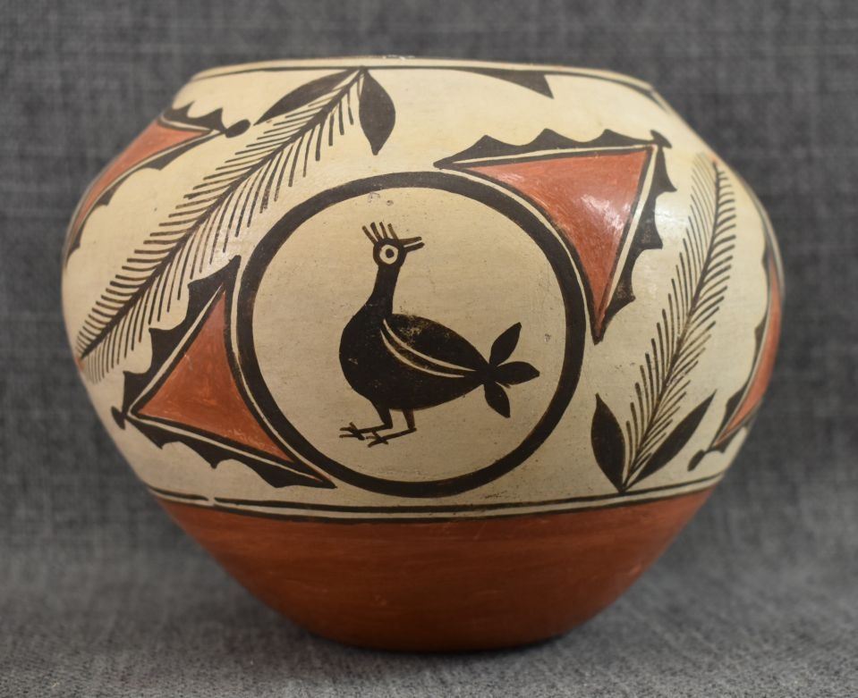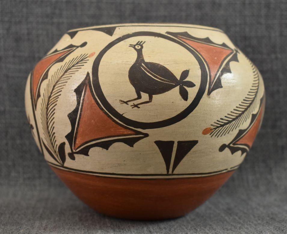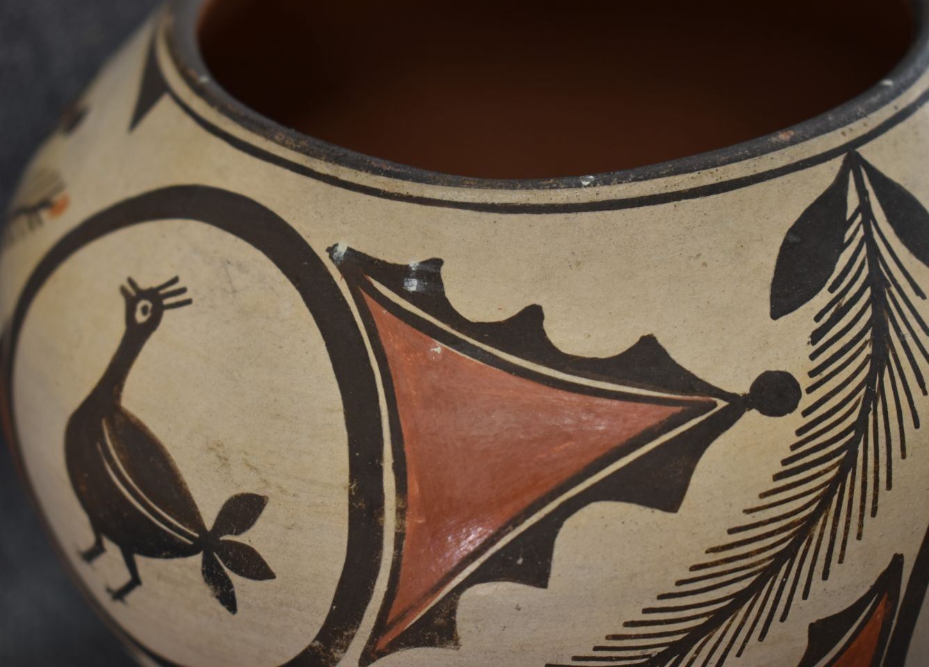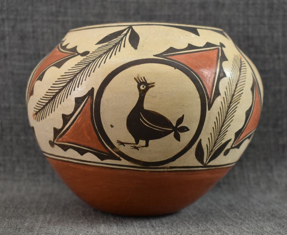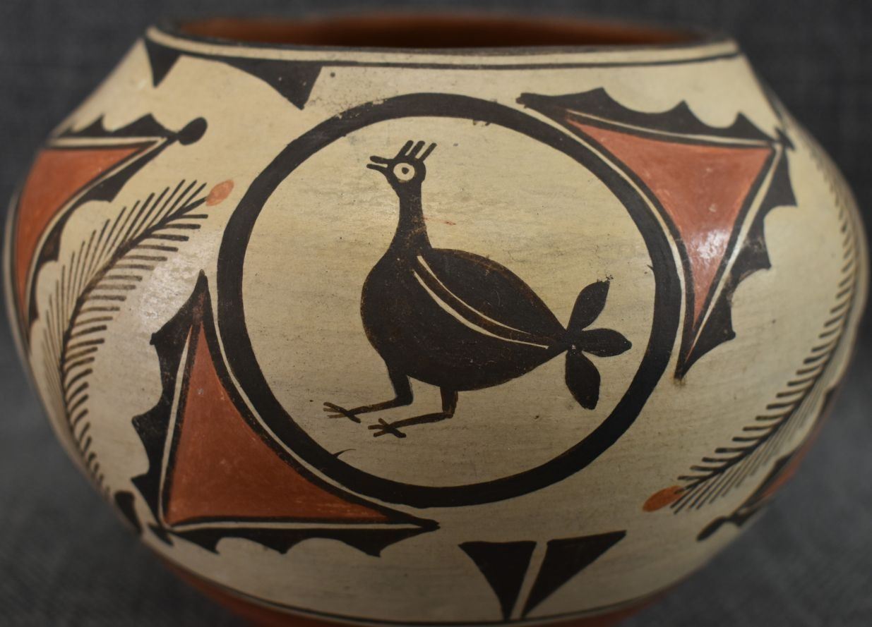 1950's Zia, hand coiled with polychrome painted geometric floral and bird design 4.75" x 6"