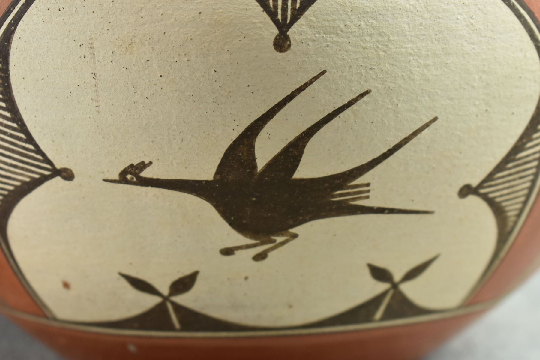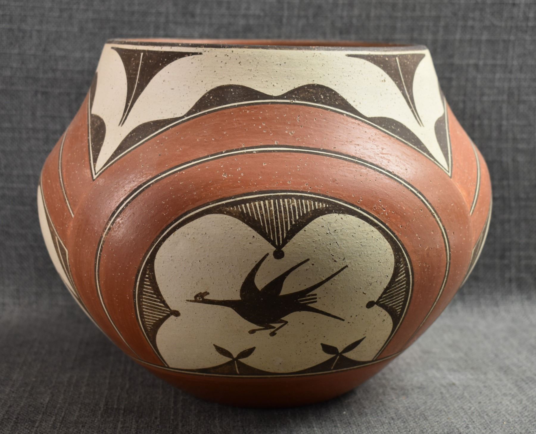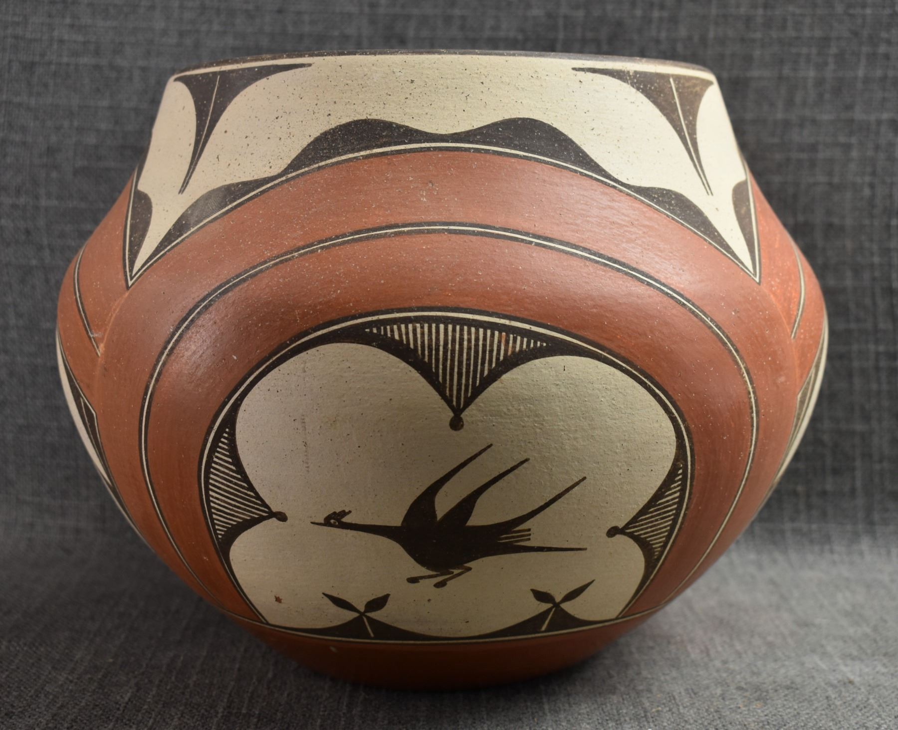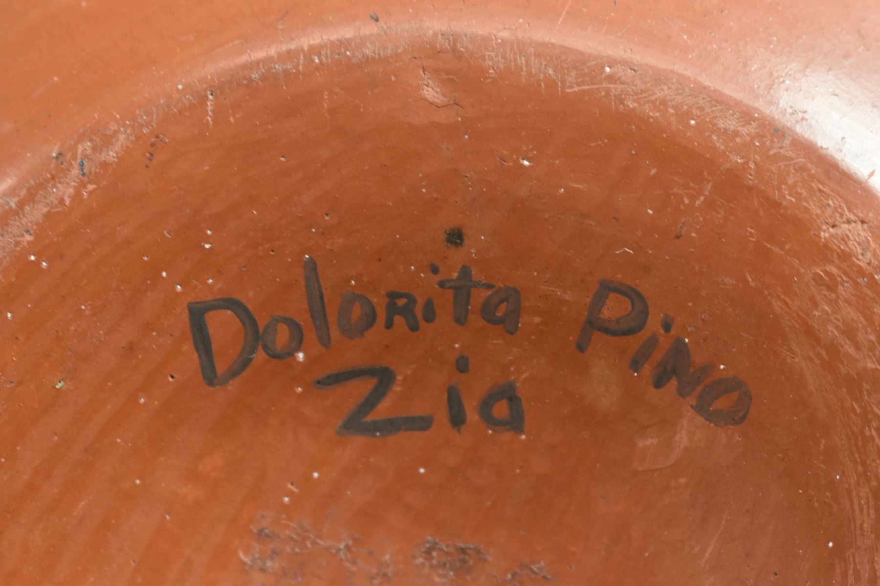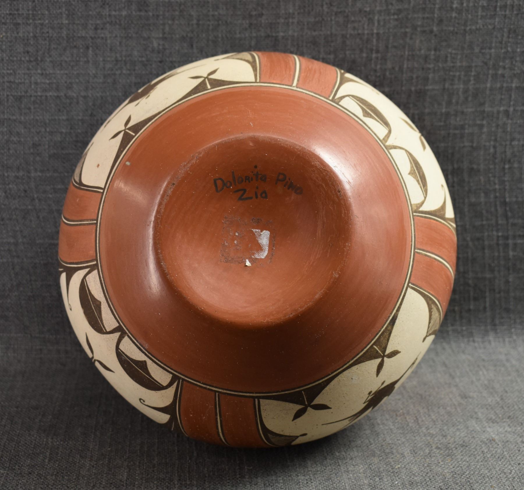 1970-80's Zia, hand coiled and polychrome painted traditional design by Dolorita Pino. 8'' x 11''