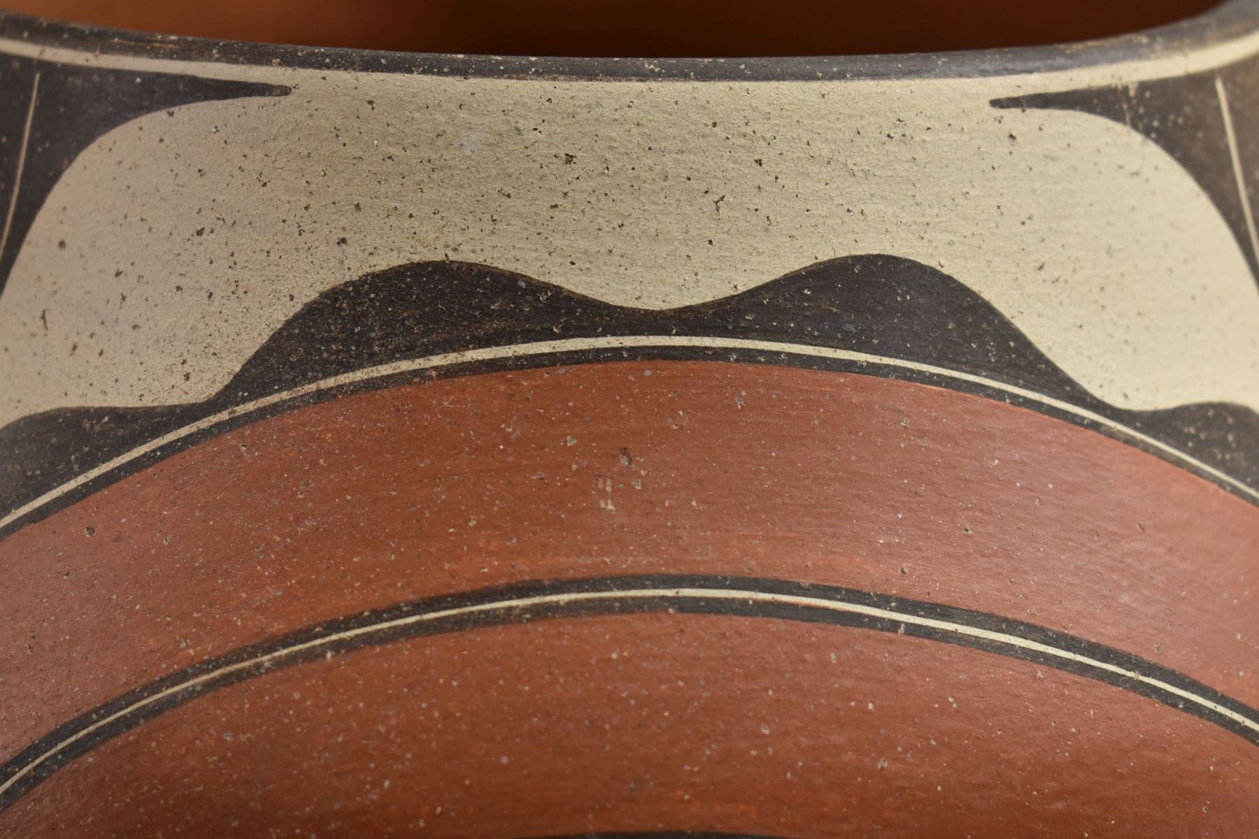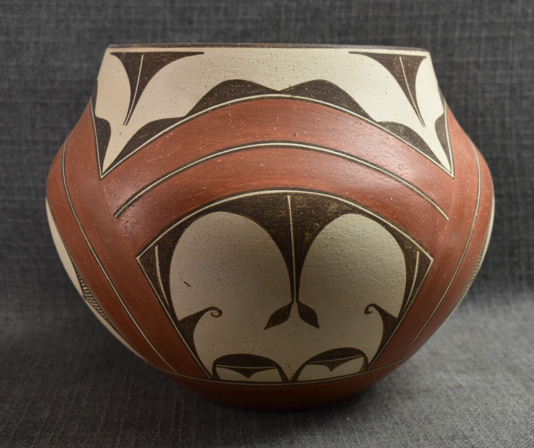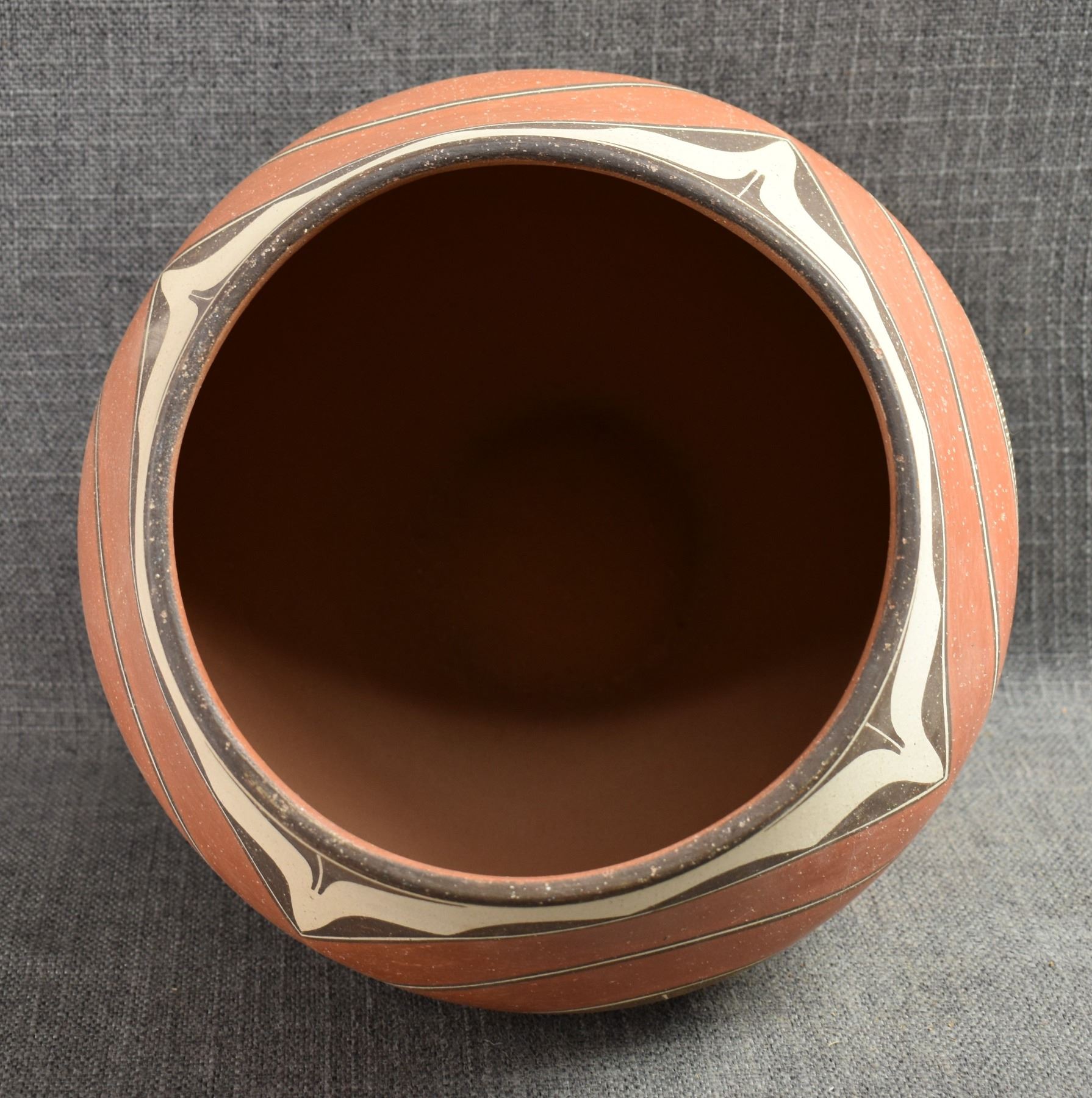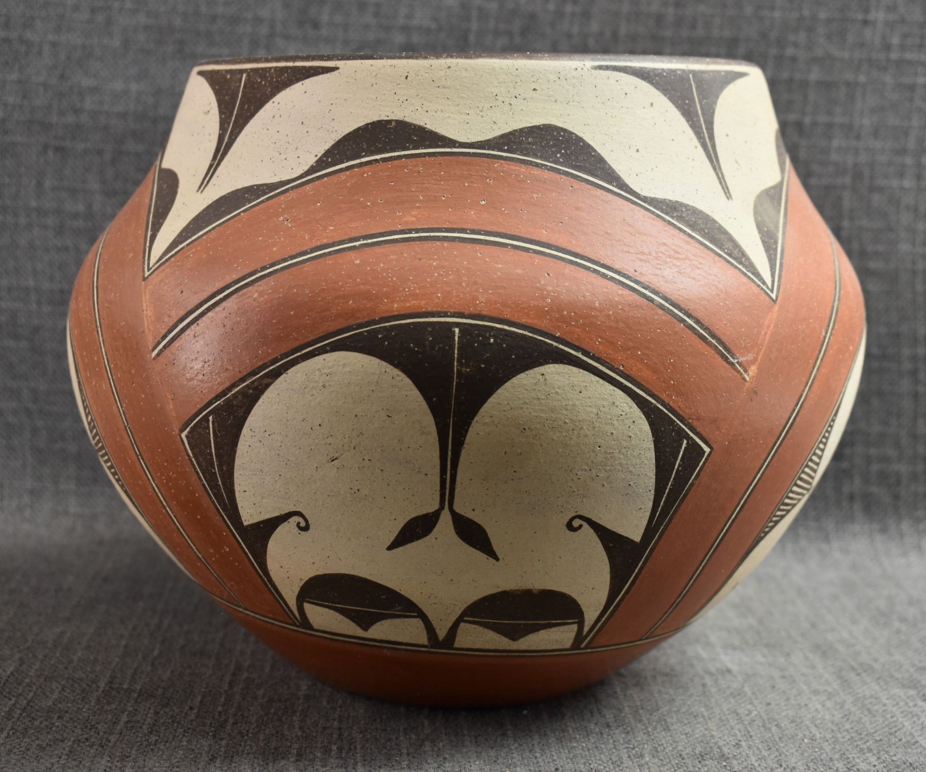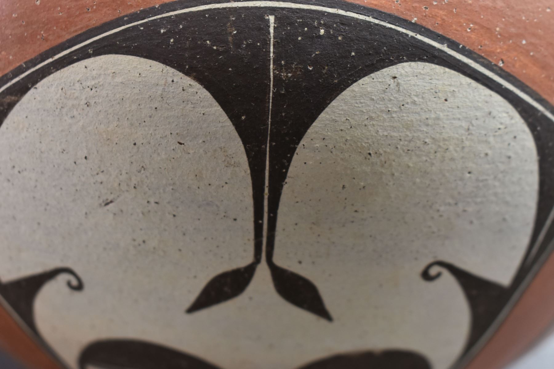 1970-80's Zia, hand coiled and polychrome painted traditional design by Dolorita Pino. 8'' x 11''