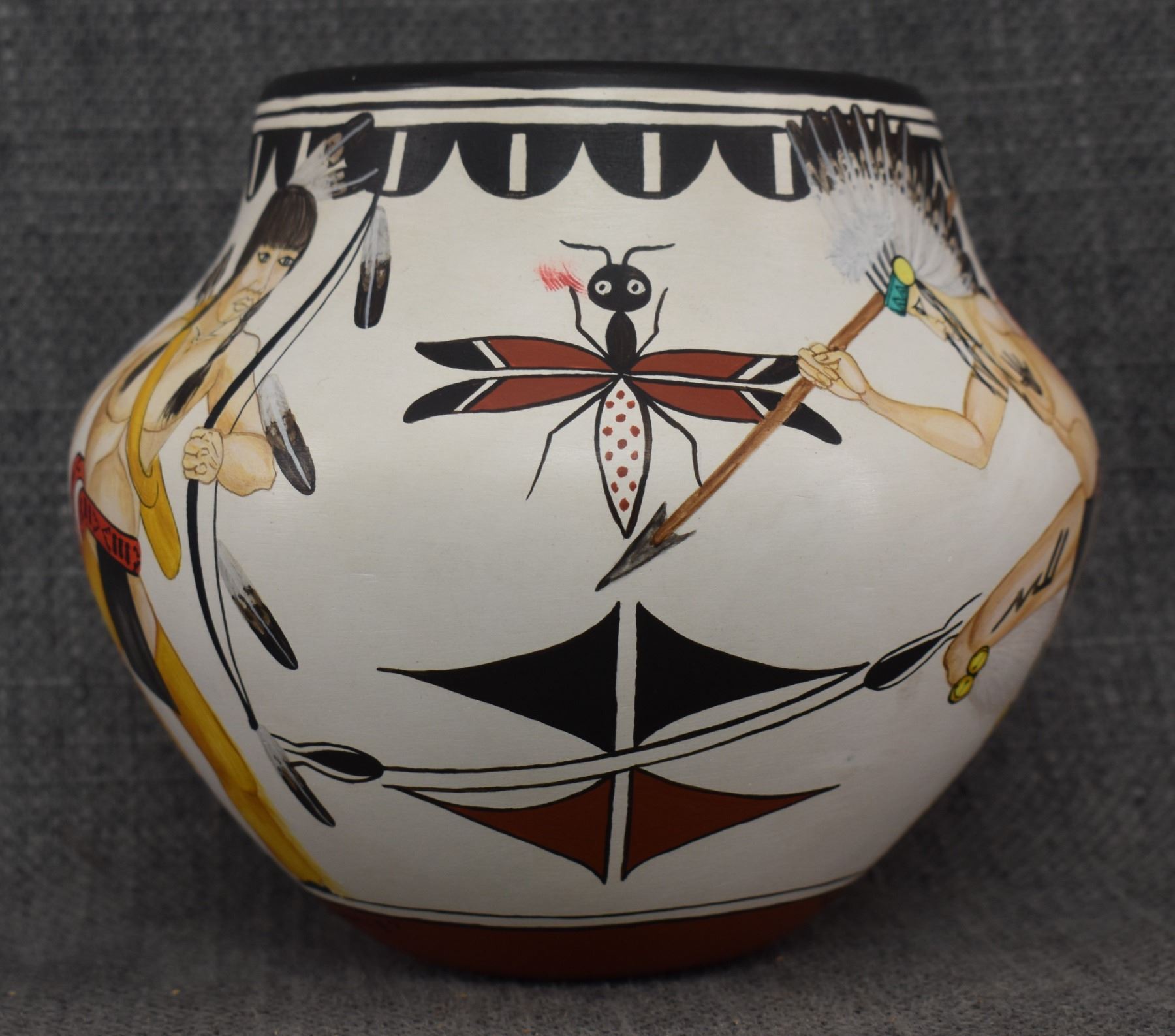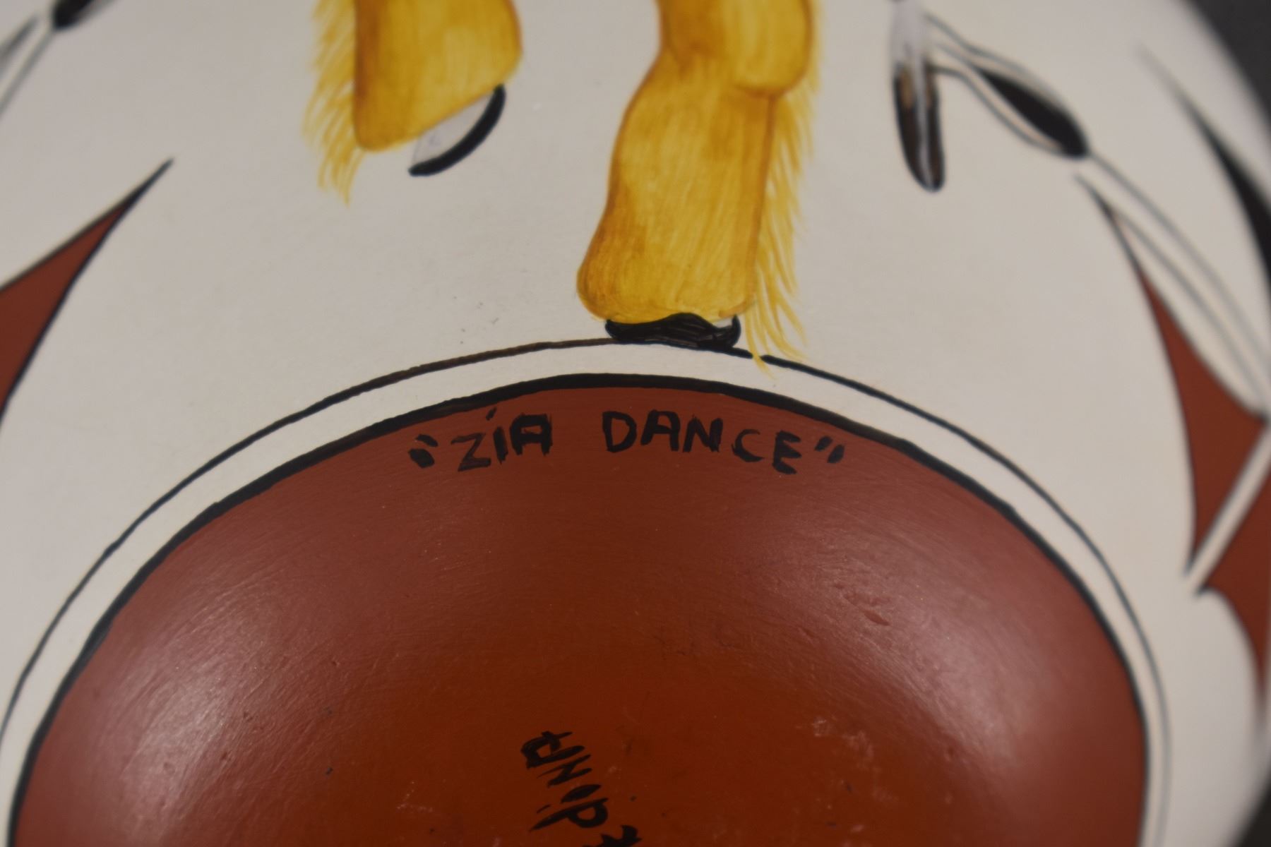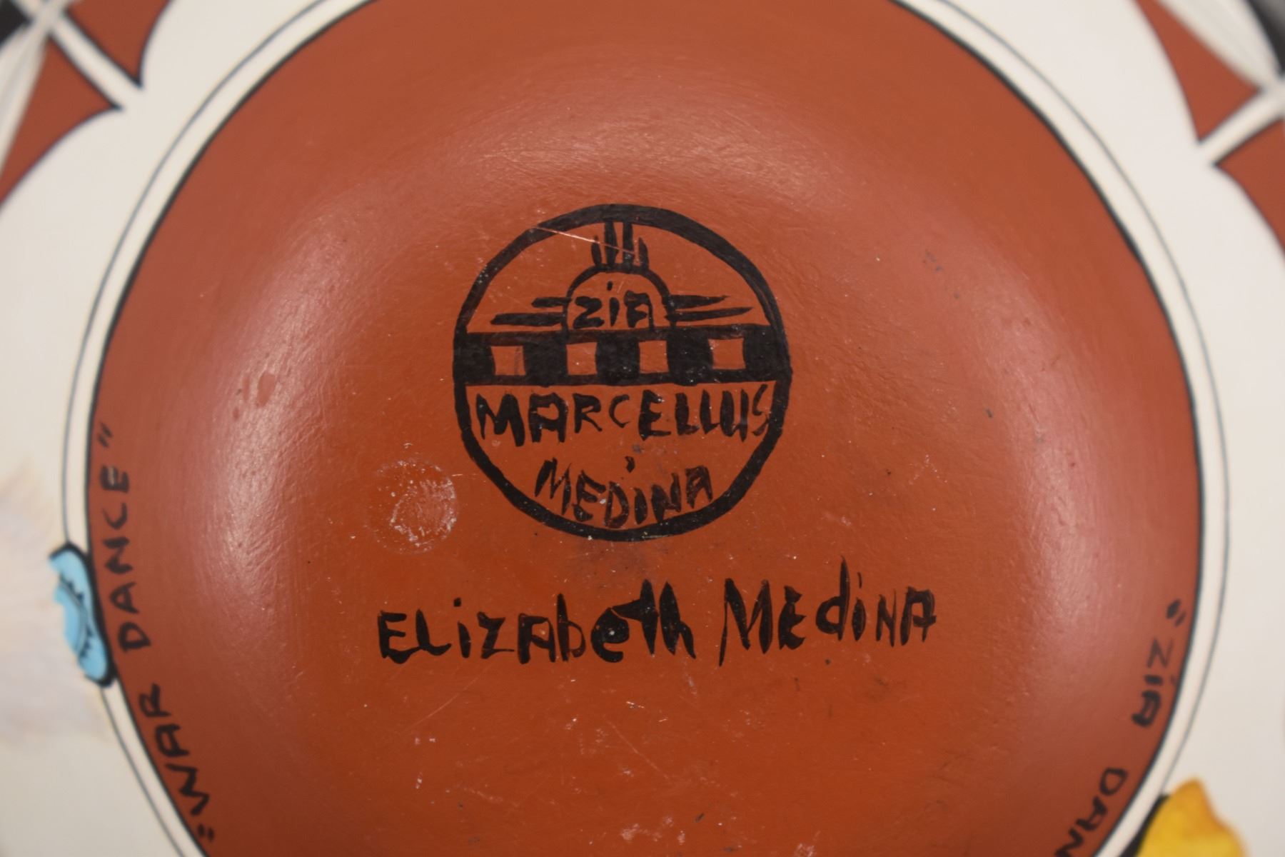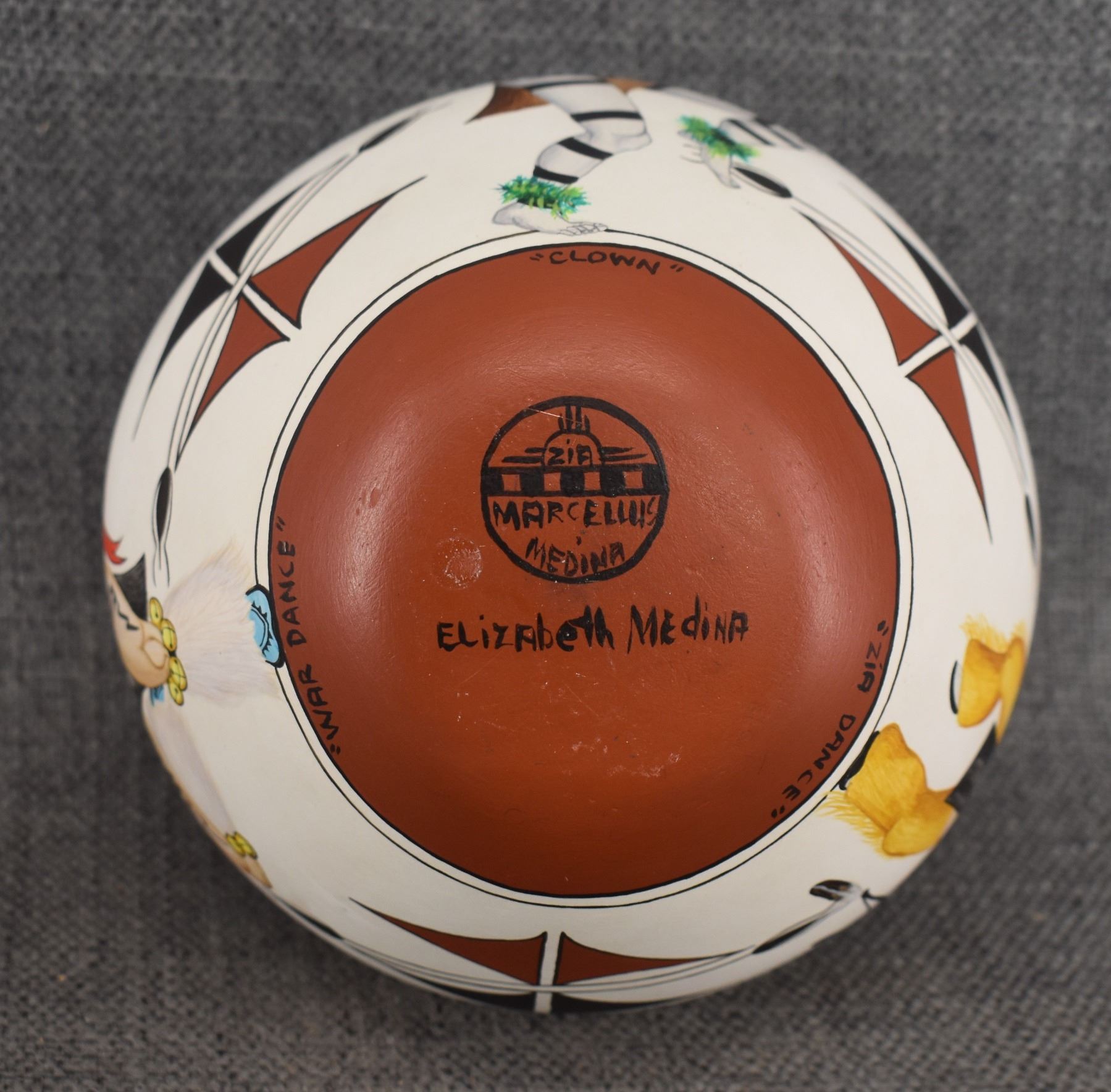 1980's Zia. Hand coiled and painted depicting dancers and kachina figures, signed Elizabeth & Marcellus Medina. 5'' x 6''
