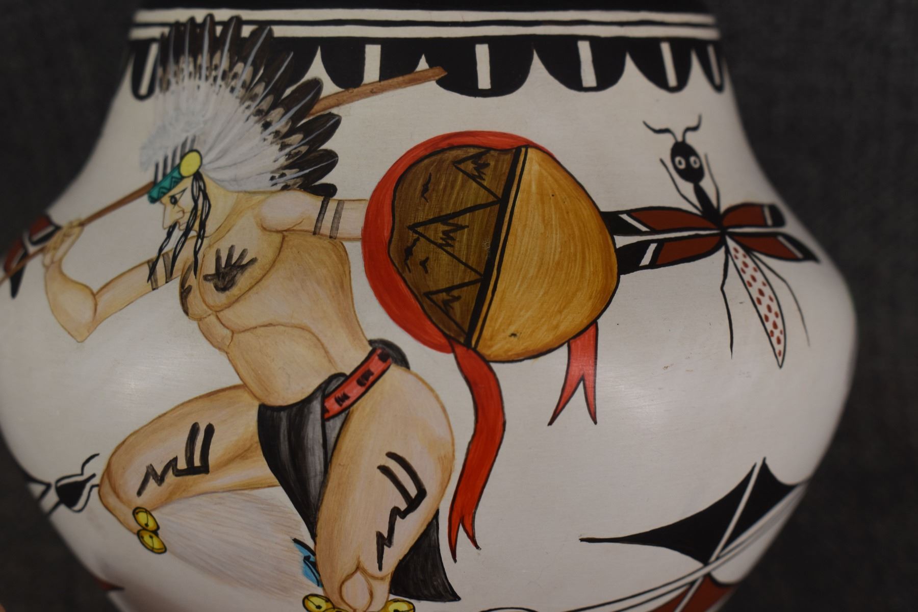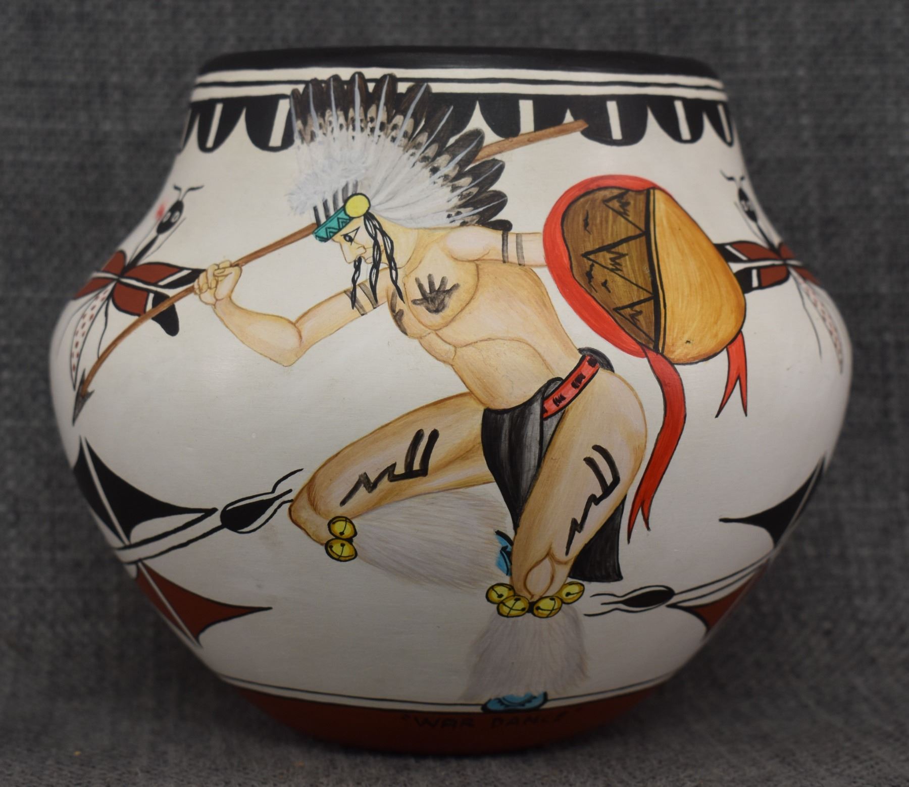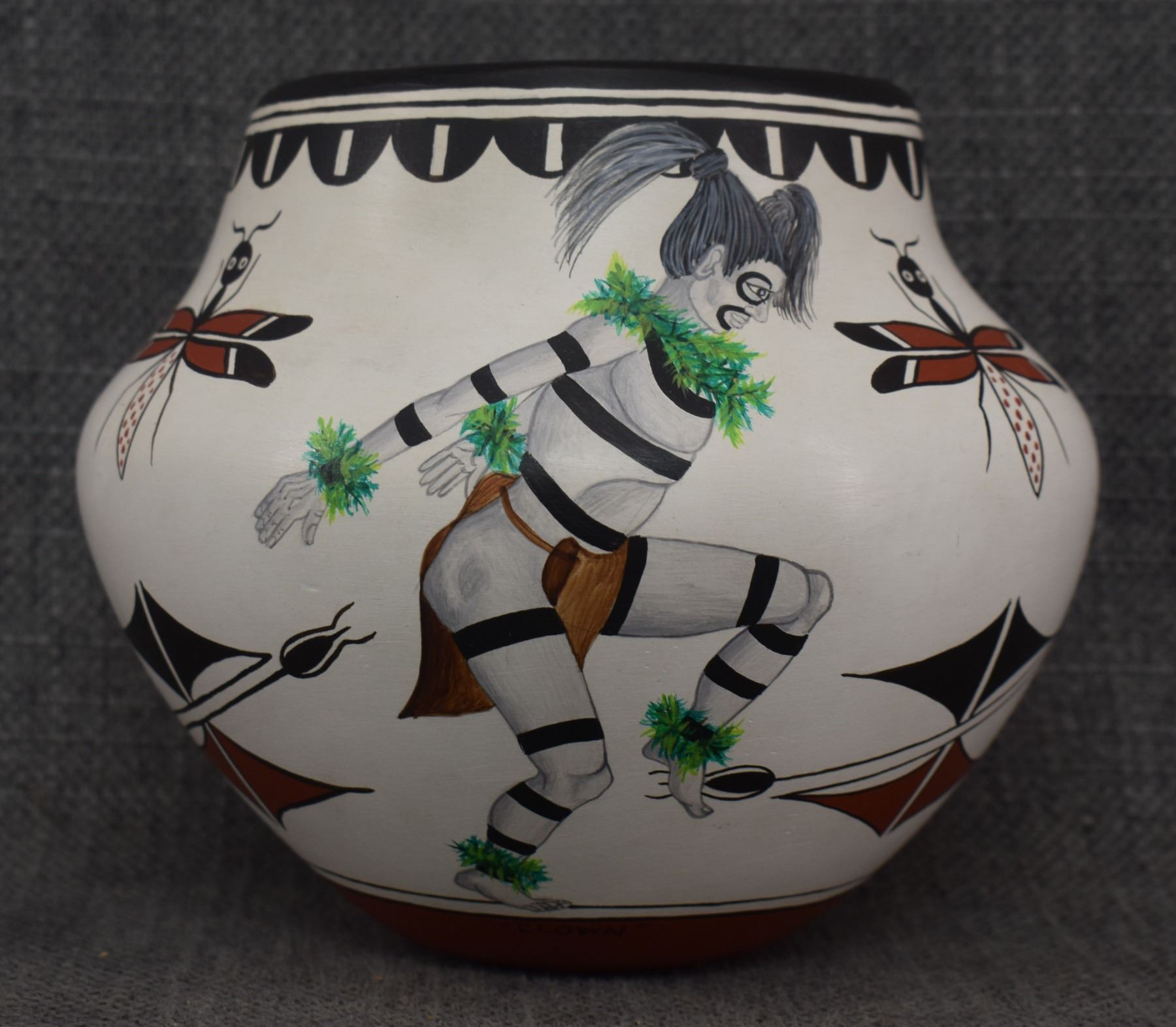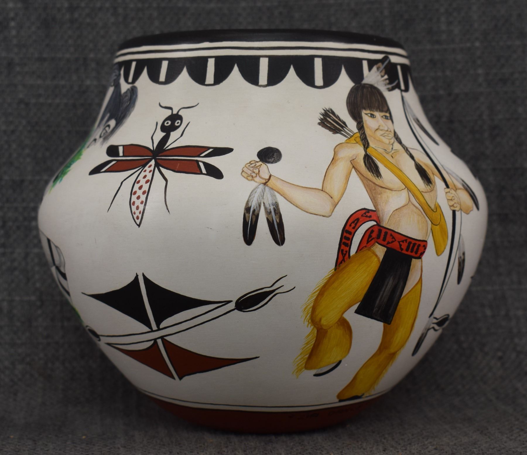 1980's Zia. Hand coiled and painted depicting dancers and kachina figures, signed Elizabeth & Marcellus Medina. 5'' x 6''