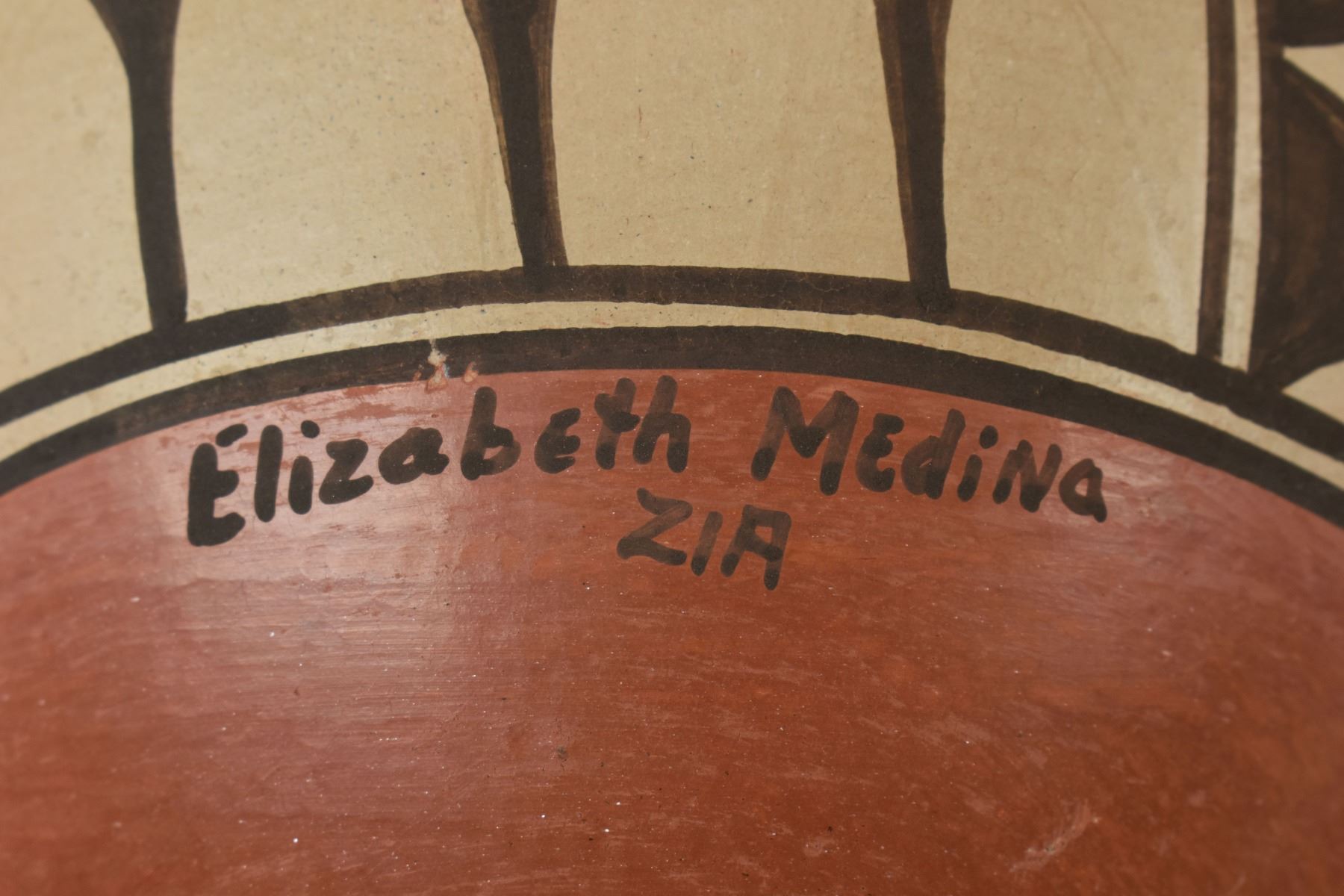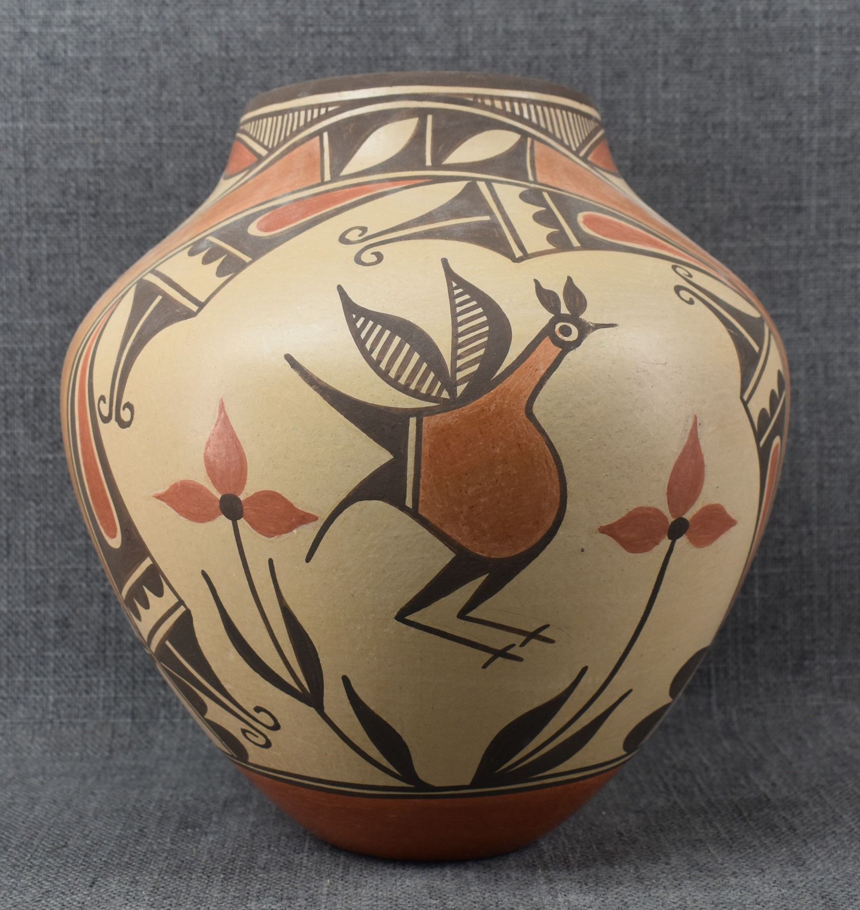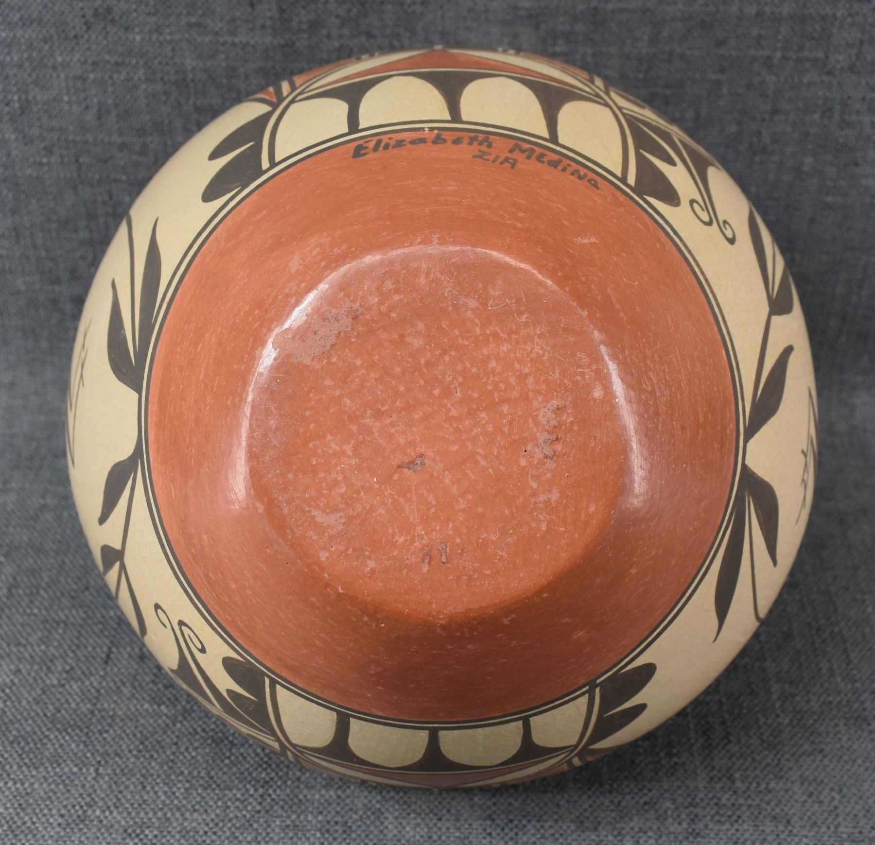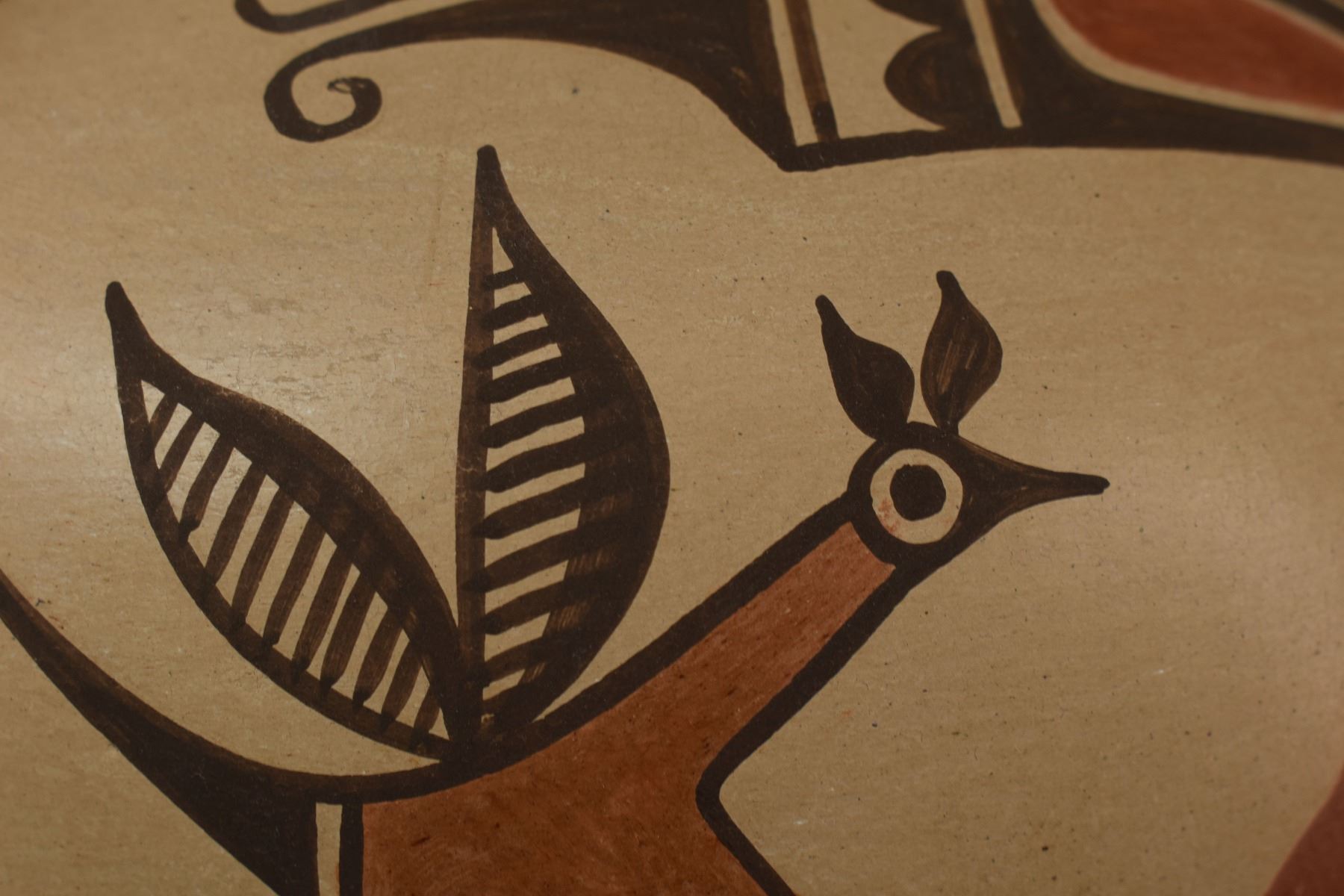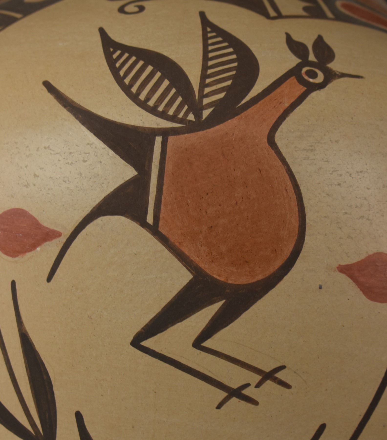 1980's Zia, hand coiled with four color painted raincloud bird and floral design by Elizabeth Medina 9.5" x 9"