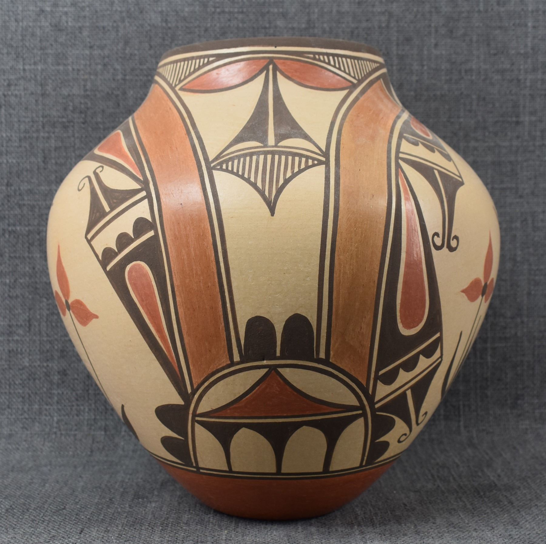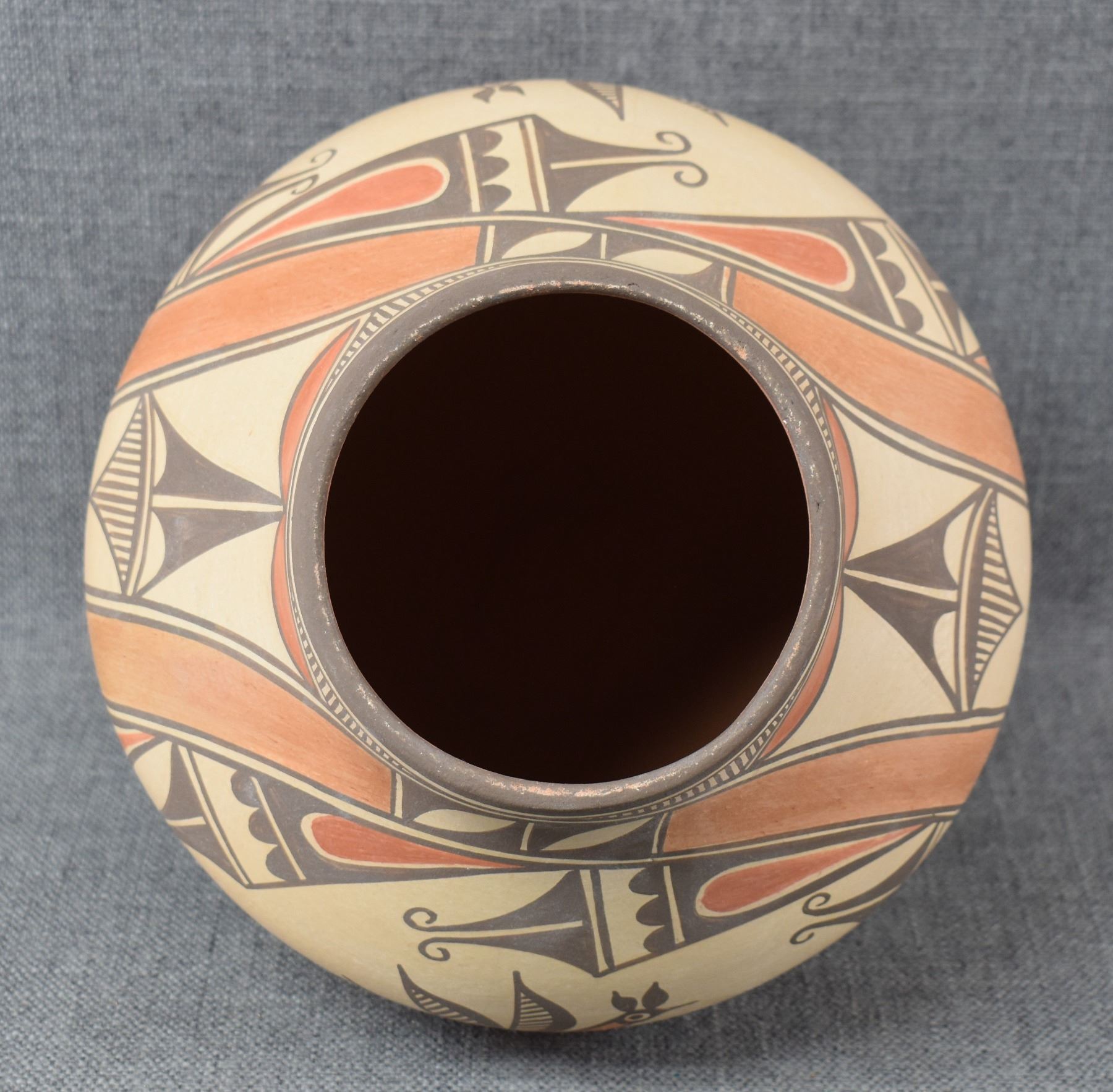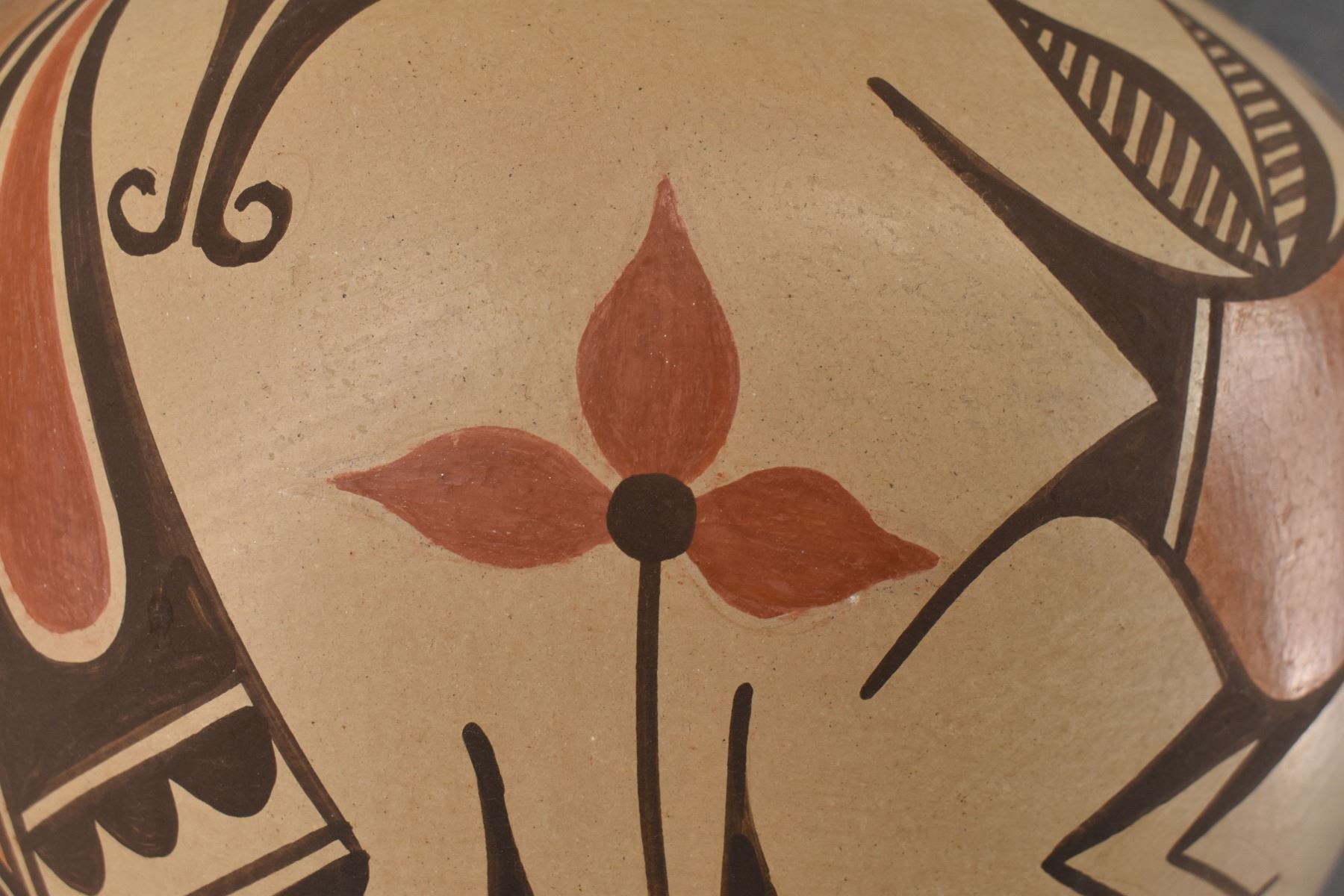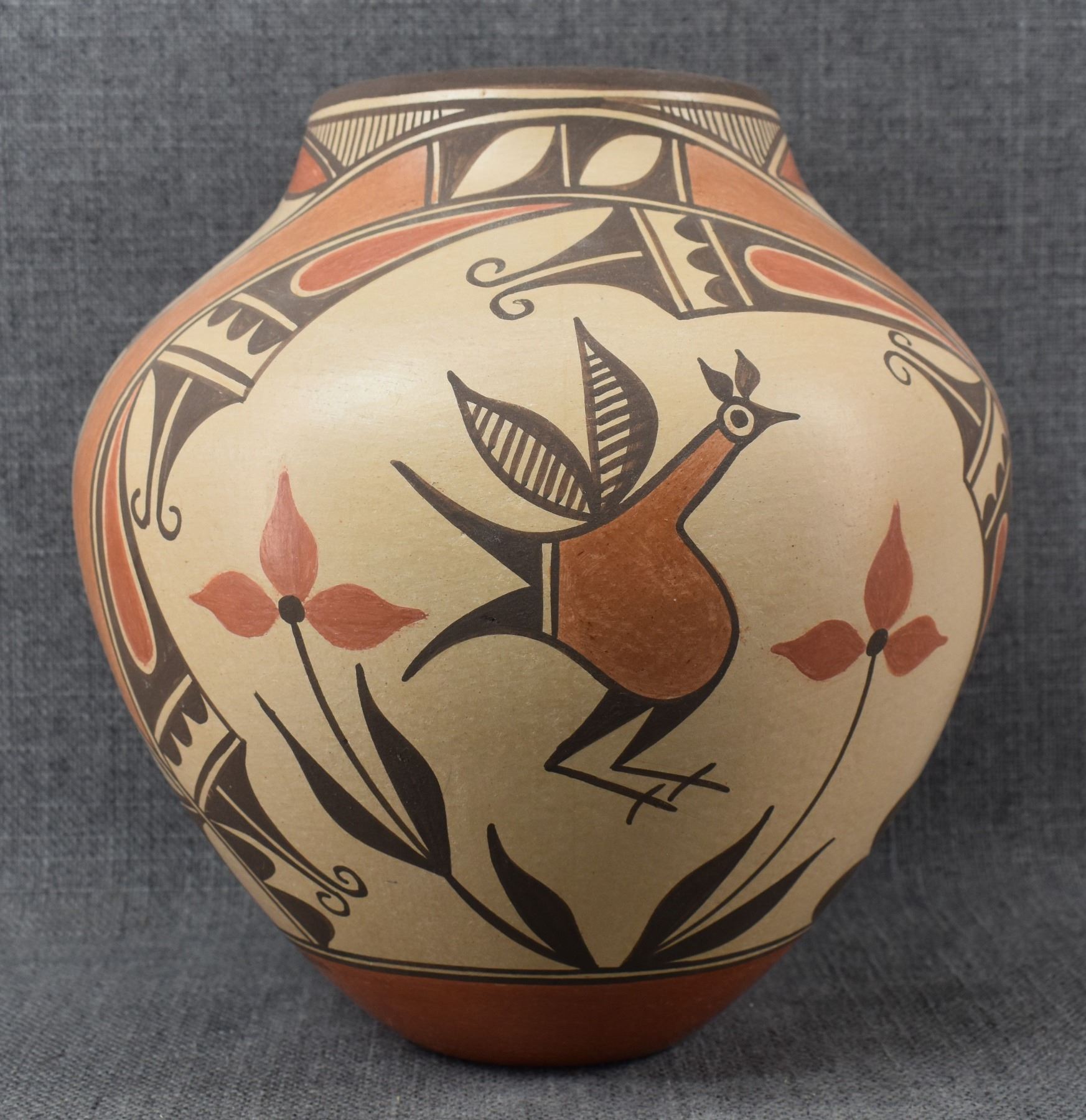 1980's Zia, hand coiled with four color painted raincloud bird and floral design by Elizabeth Medina 9.5" x 9"