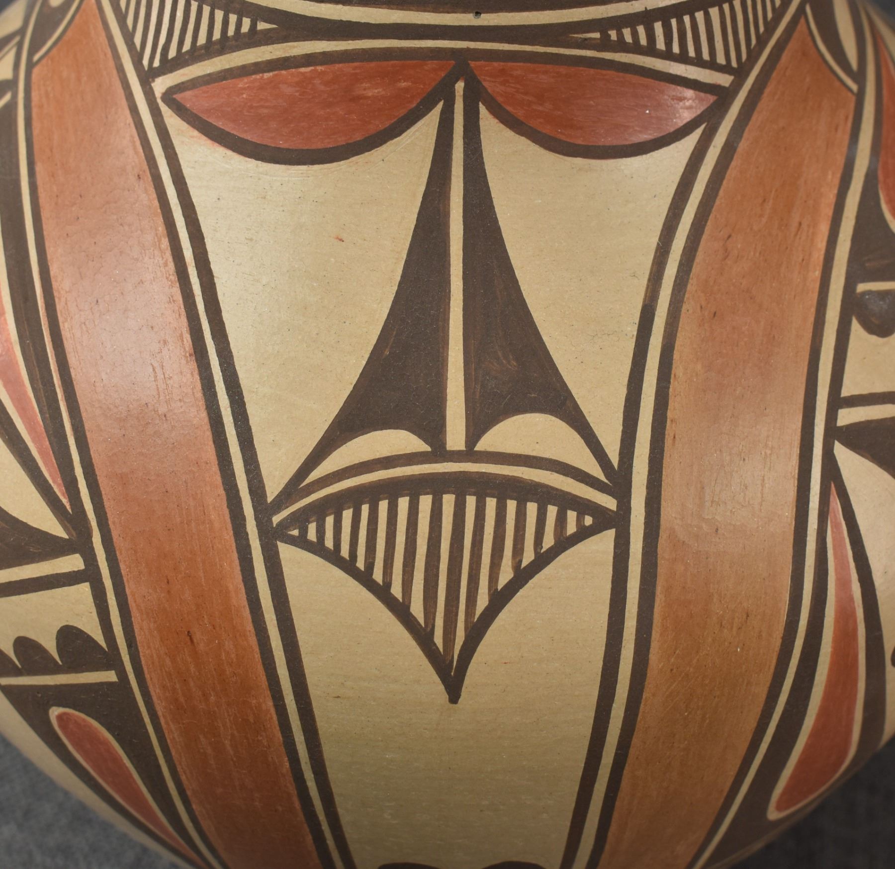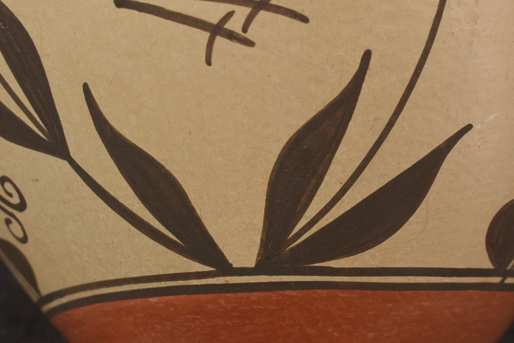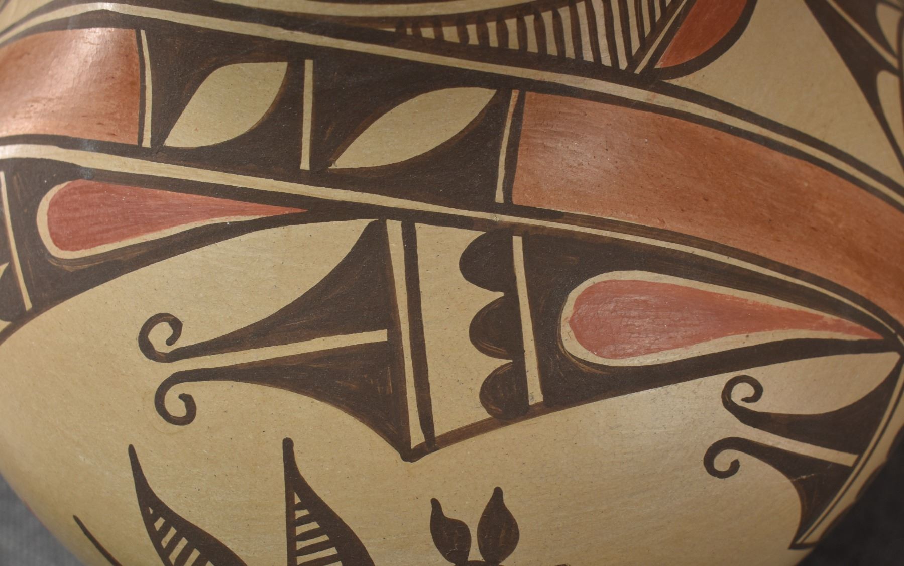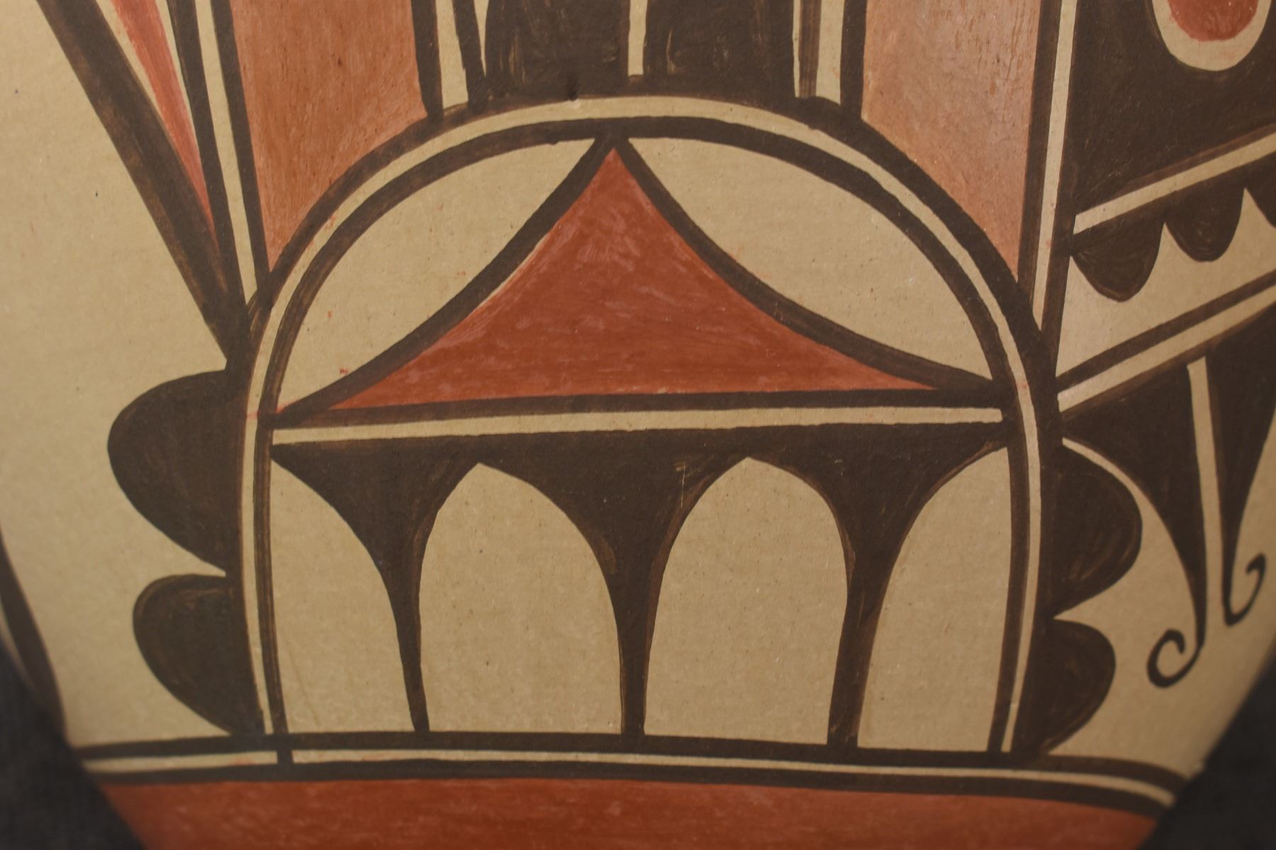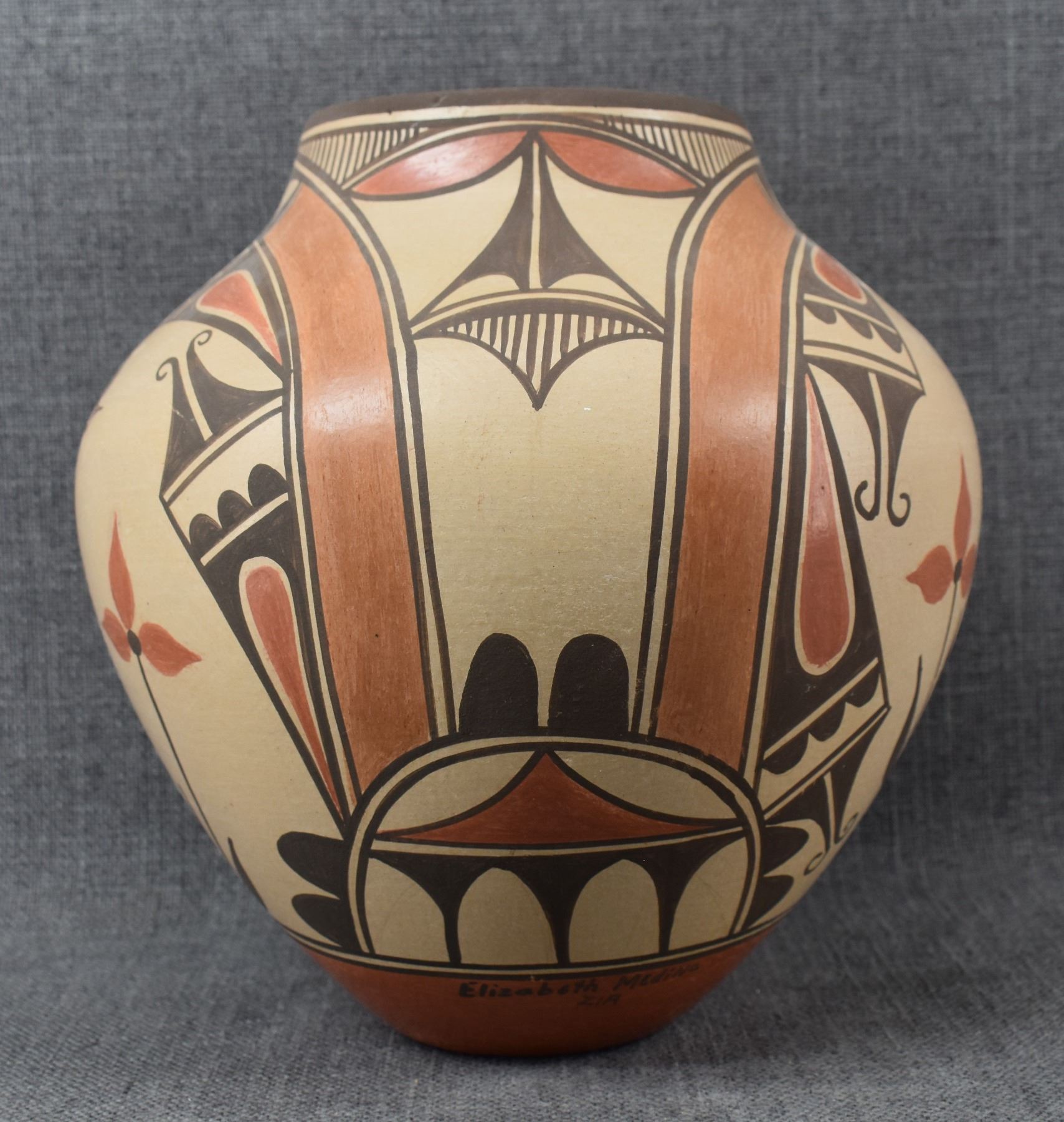 1980's Zia, hand coiled with four color painted raincloud bird and floral design by Elizabeth Medina 9.5" x 9"