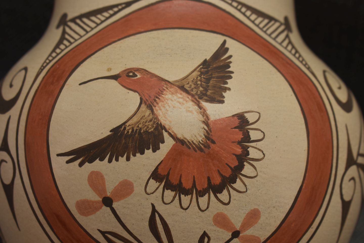 1980-90's Zia, hand coiled with polychrome painted humming bird design. Pottery olla signed Marcellus and Elizabeth Medina. 6.5'' x 7''