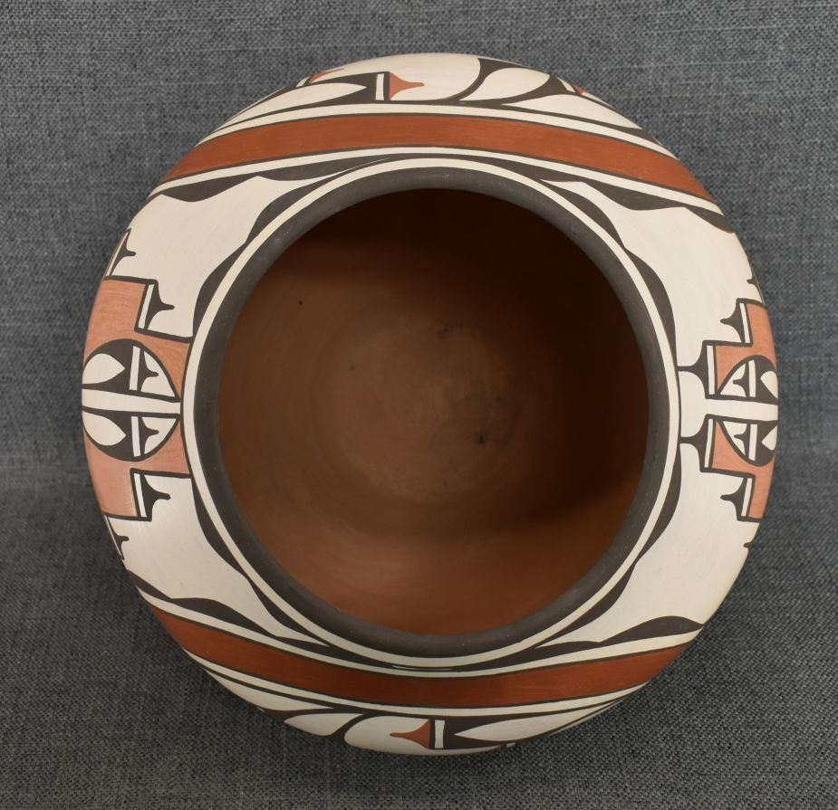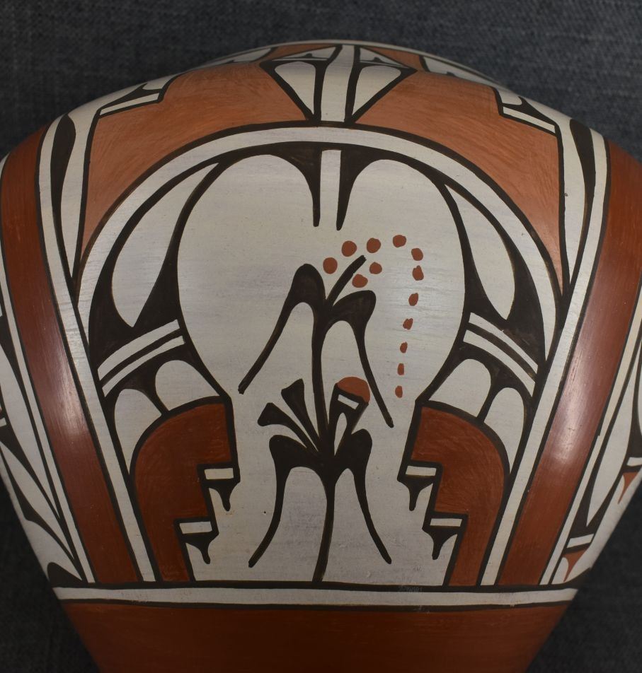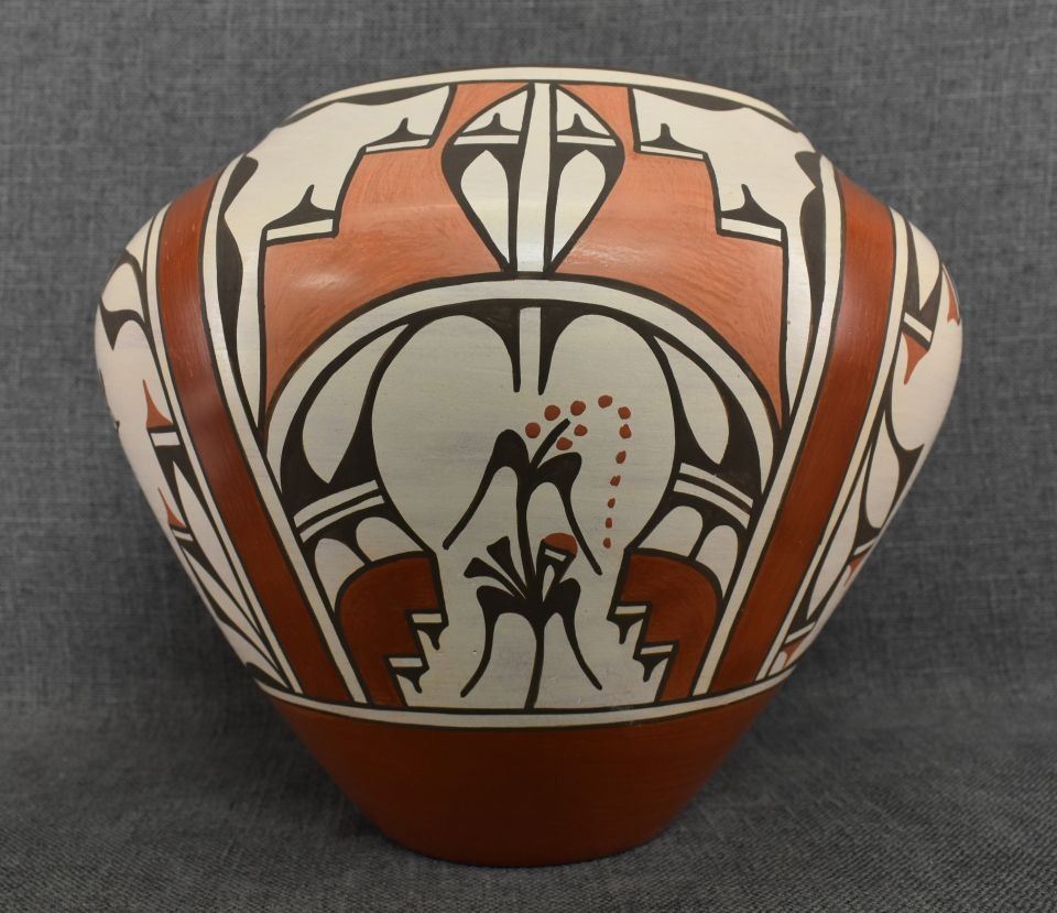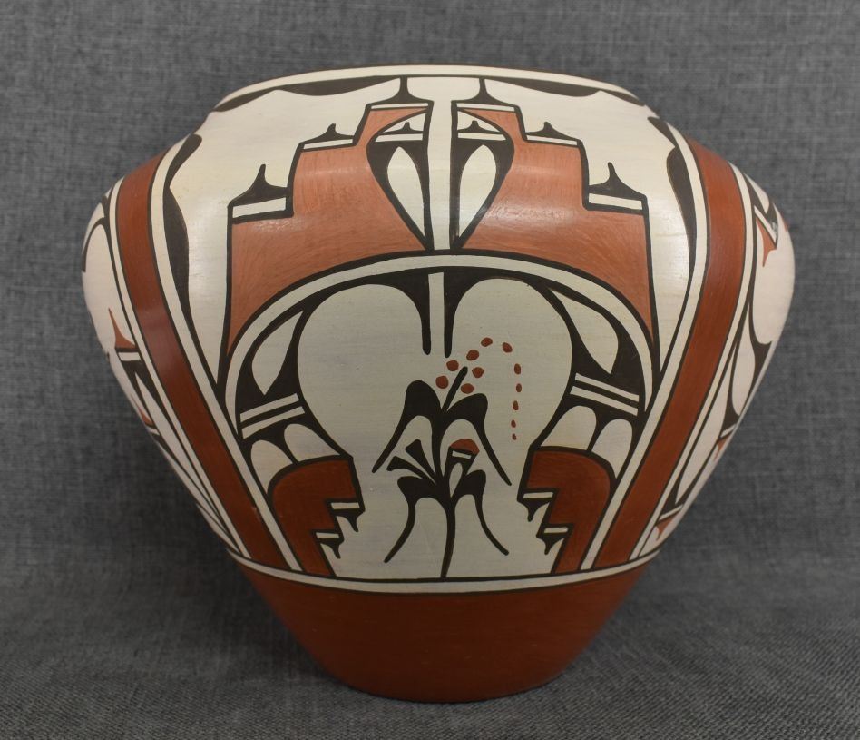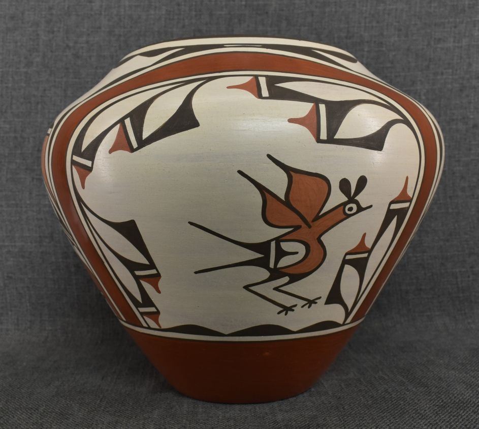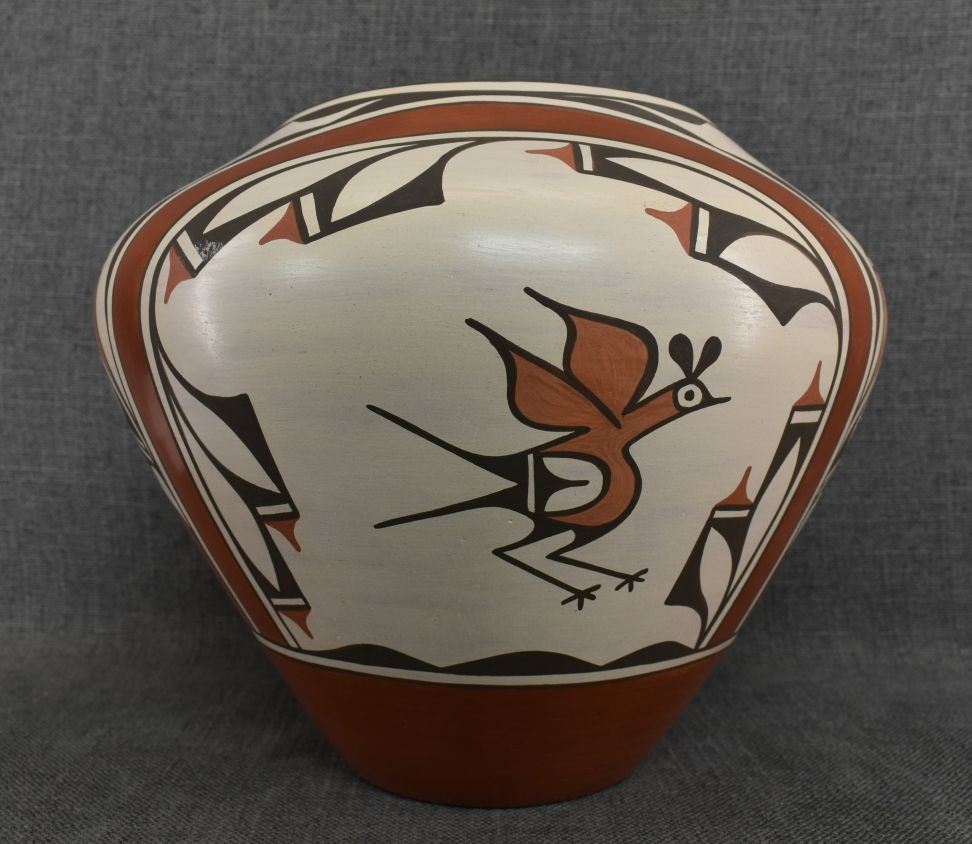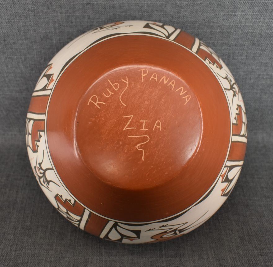 1980-90's Zia, hand coiled four color painted floral and bird design by Ruby Panana 10" x 12"