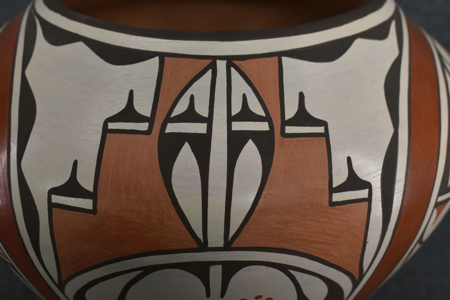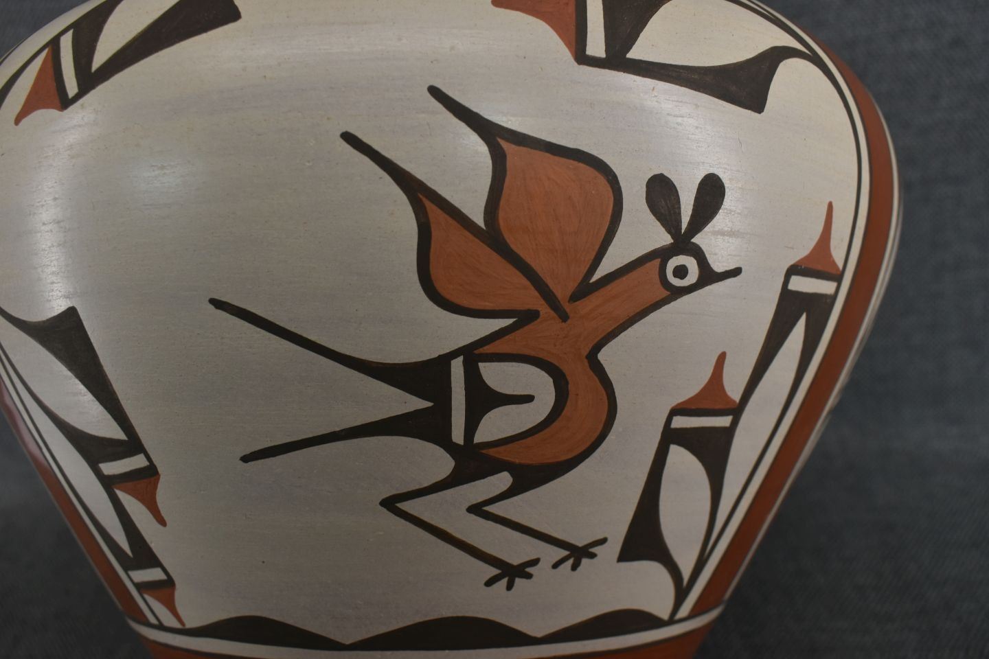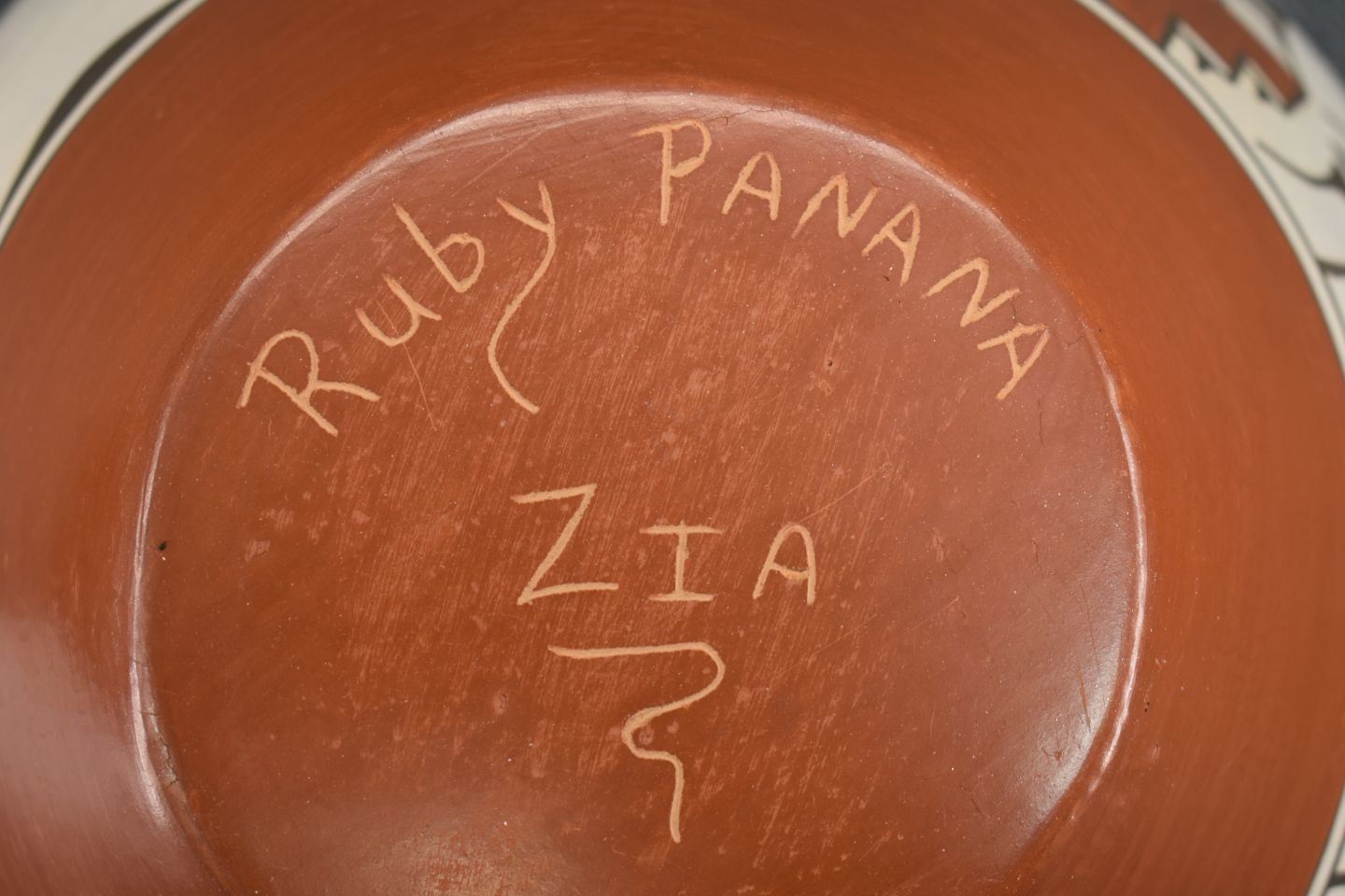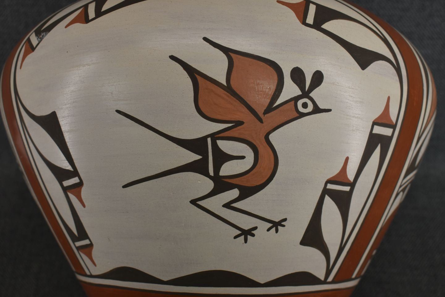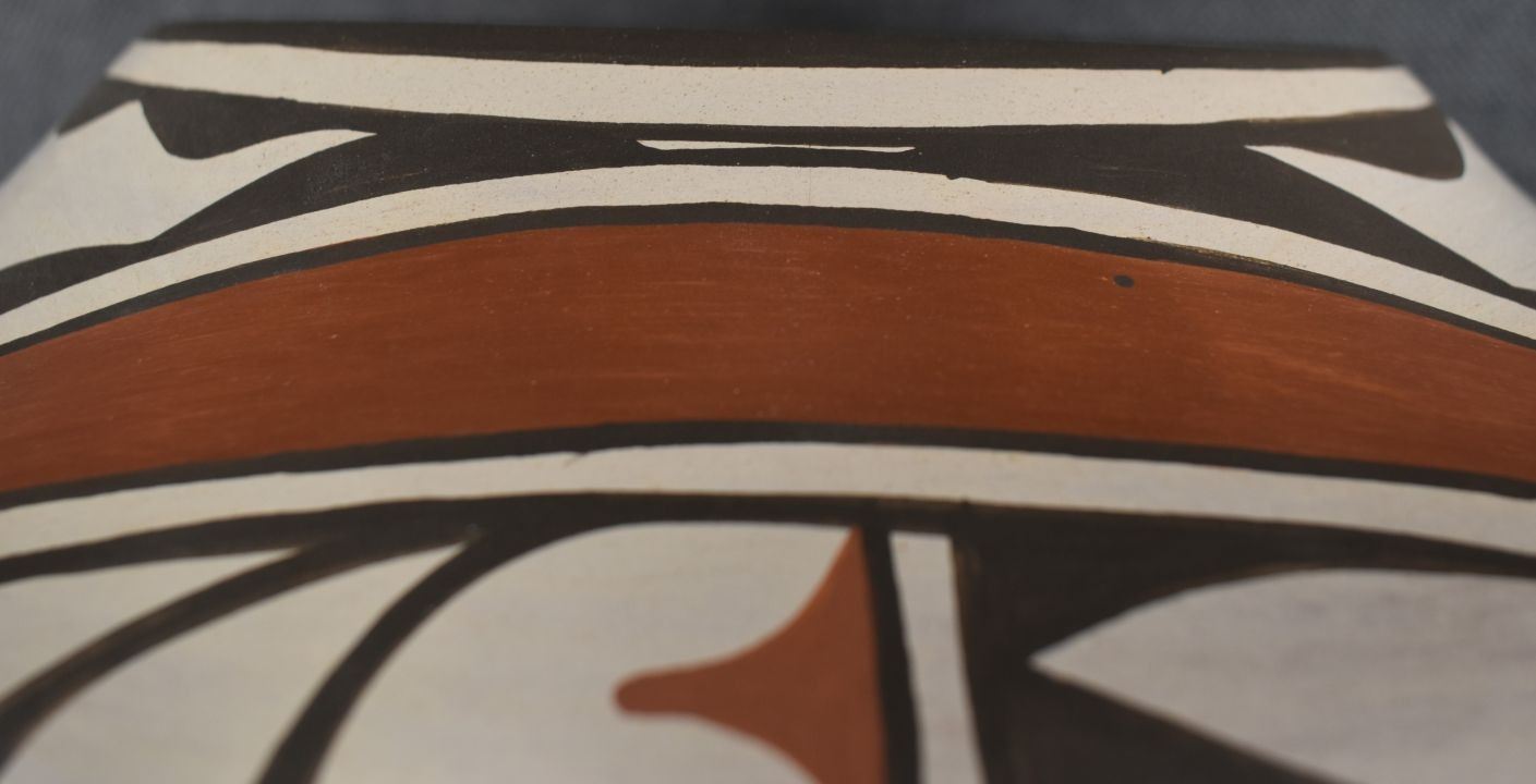 1980-90's Zia, hand coiled four color painted floral and bird design by Ruby Panana 10" x 12"