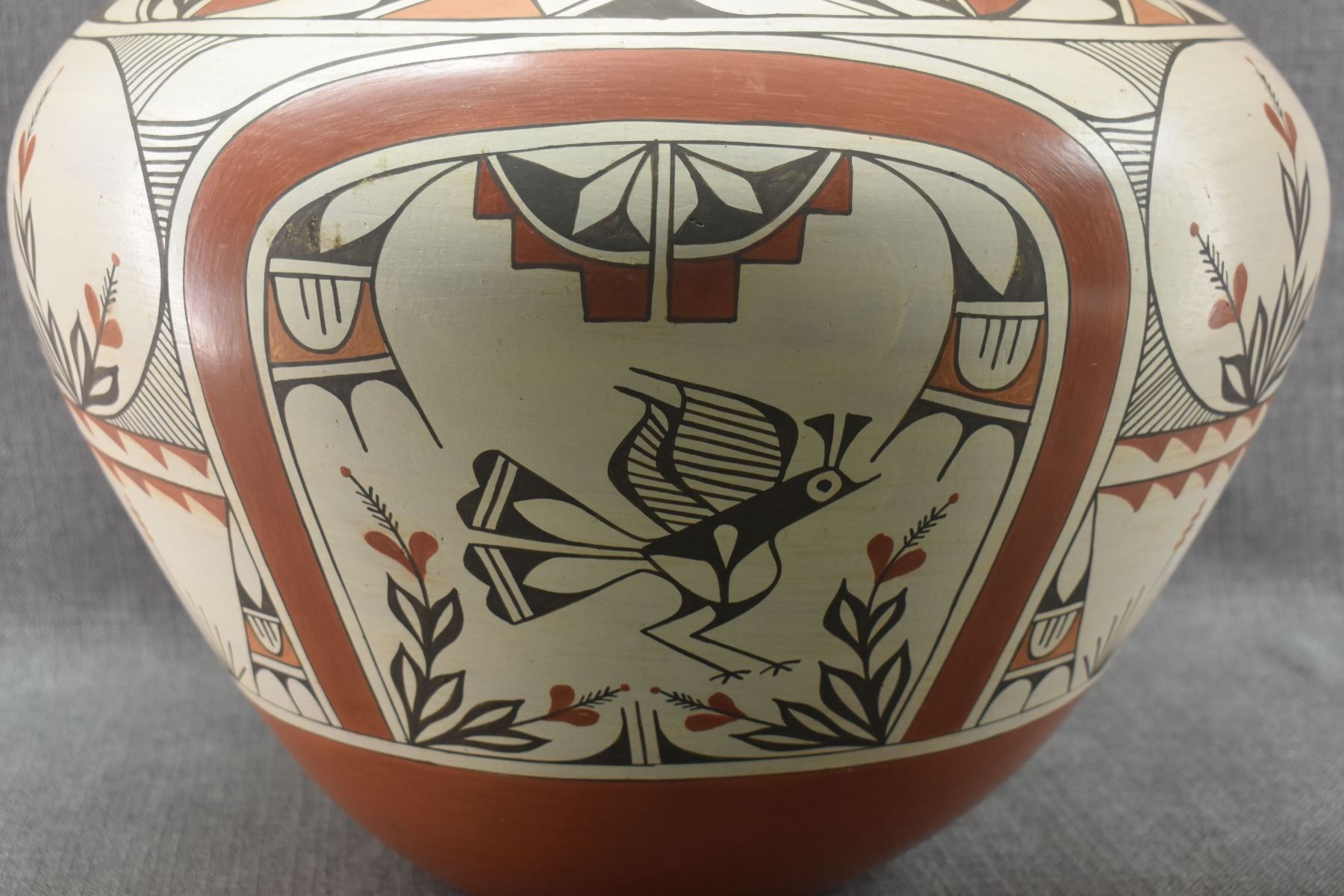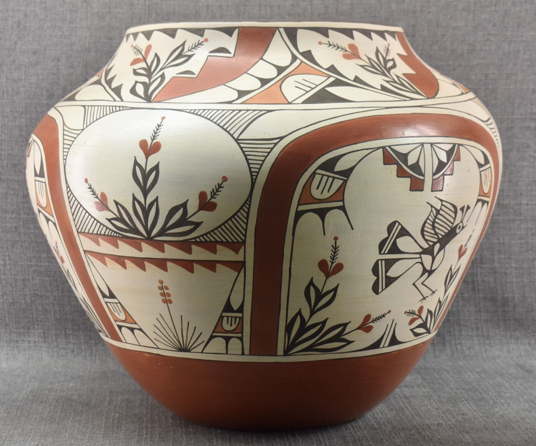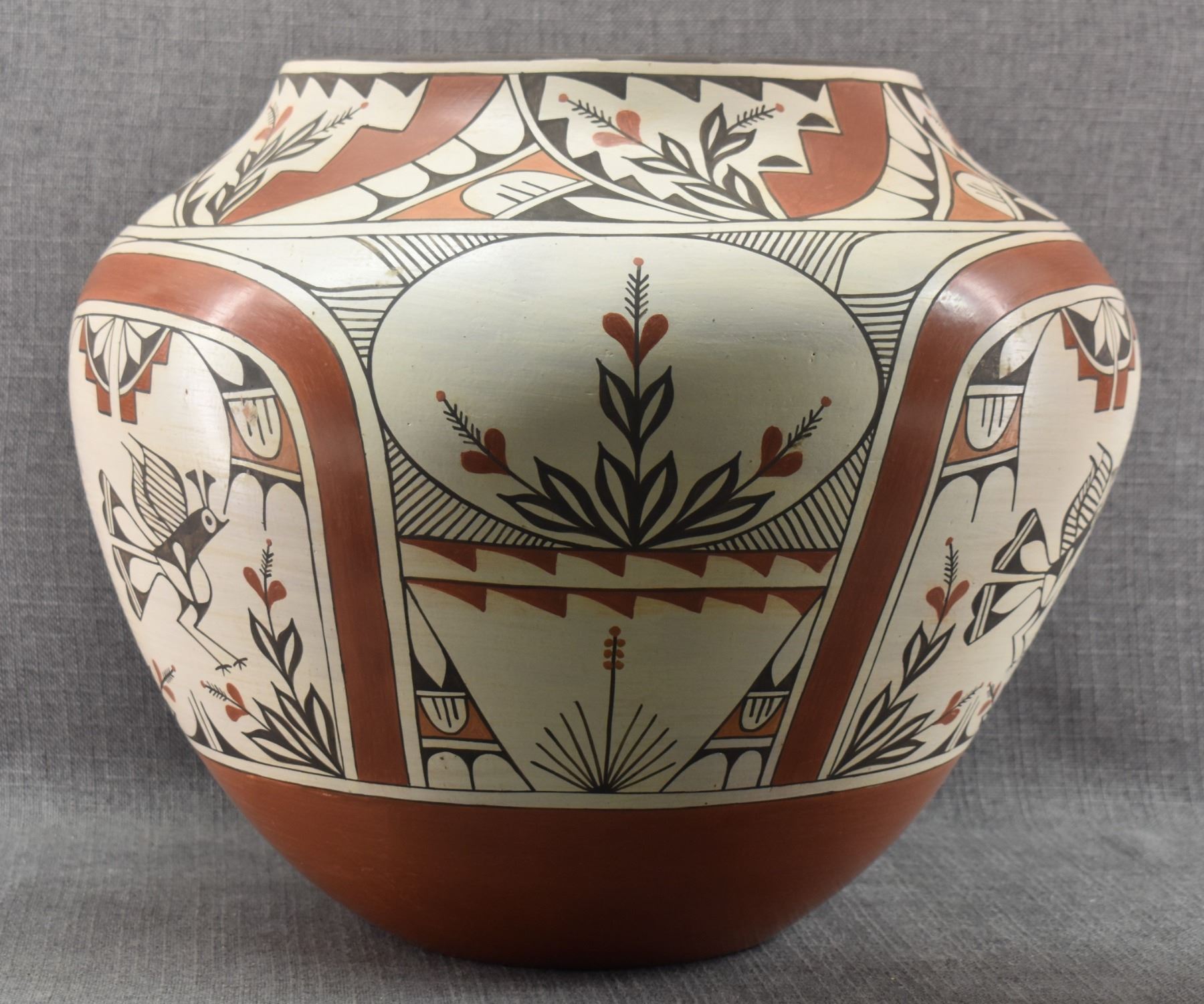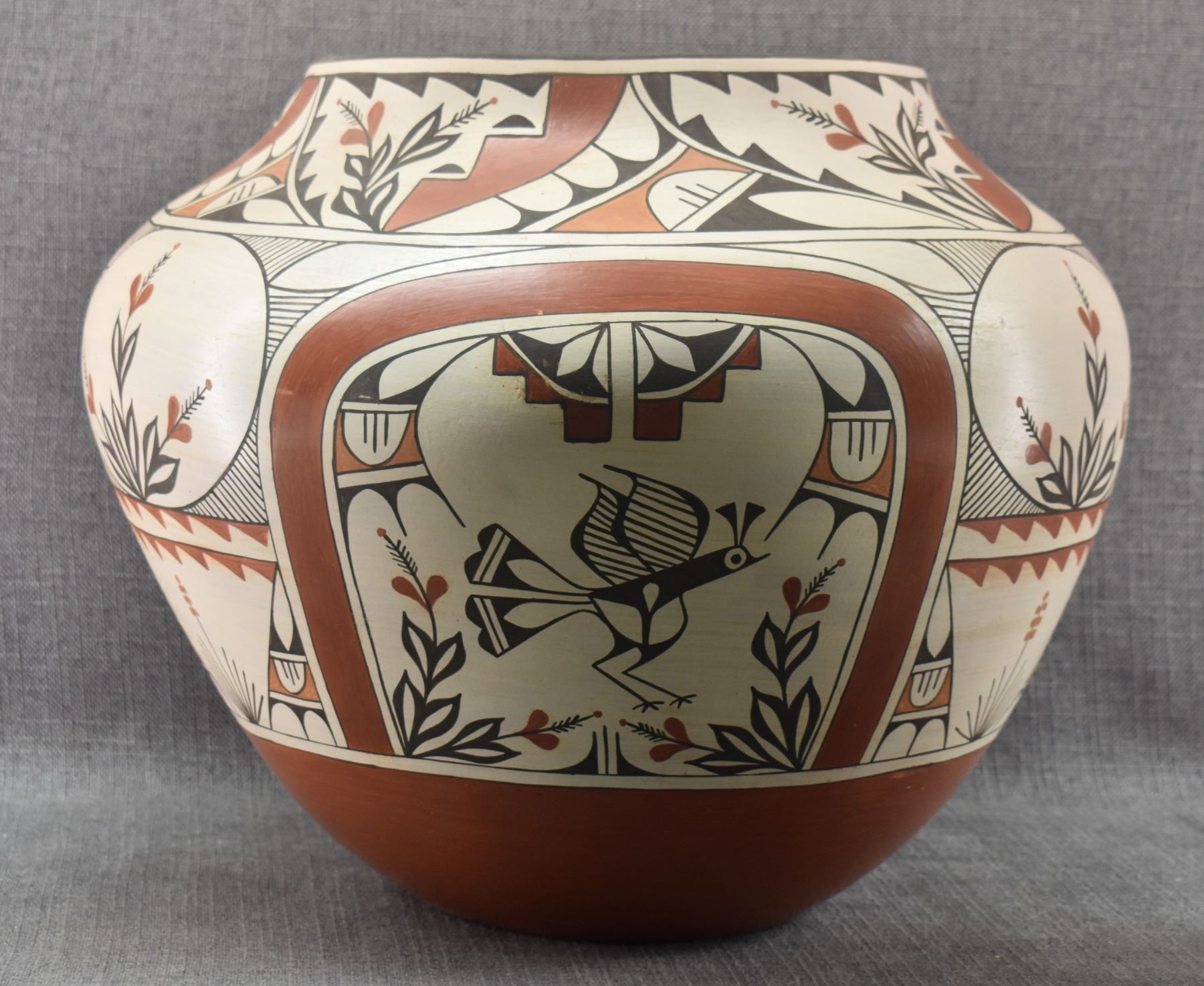 1980's Zia. Hand coiled traditional busy polychrome bird design pottery olla. signed Rudy Panana. 15'' x 18''