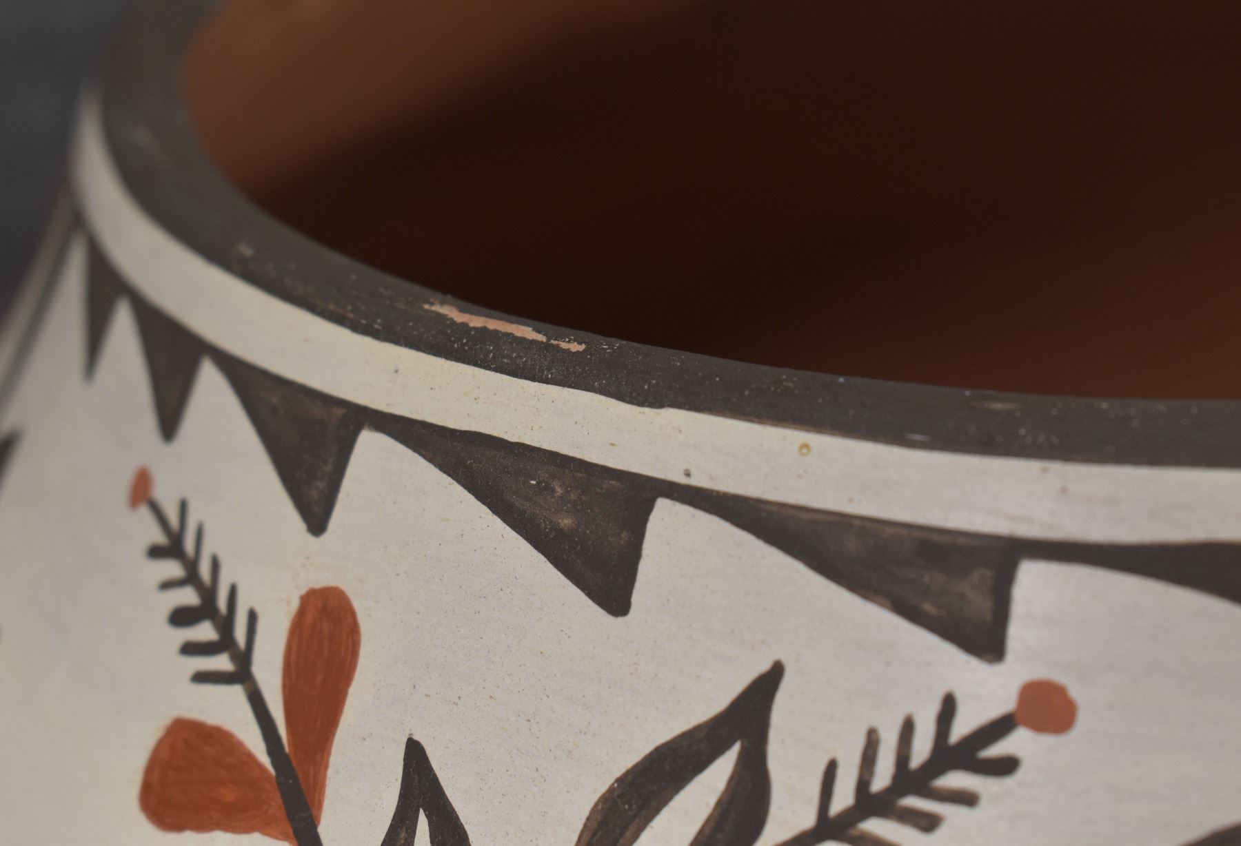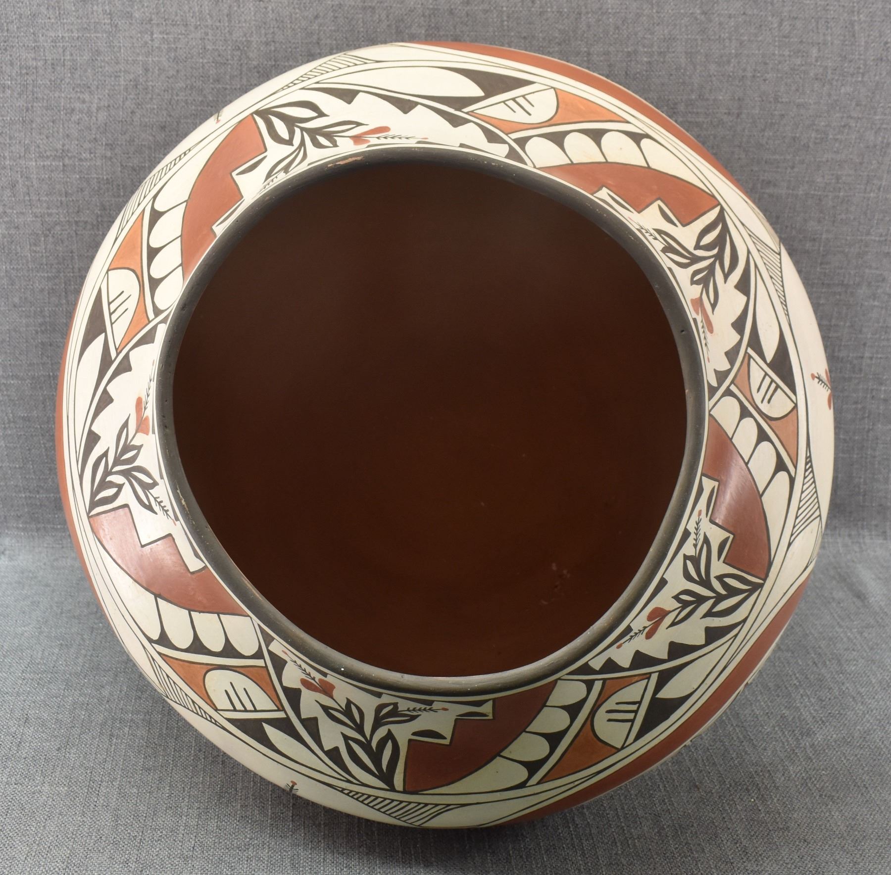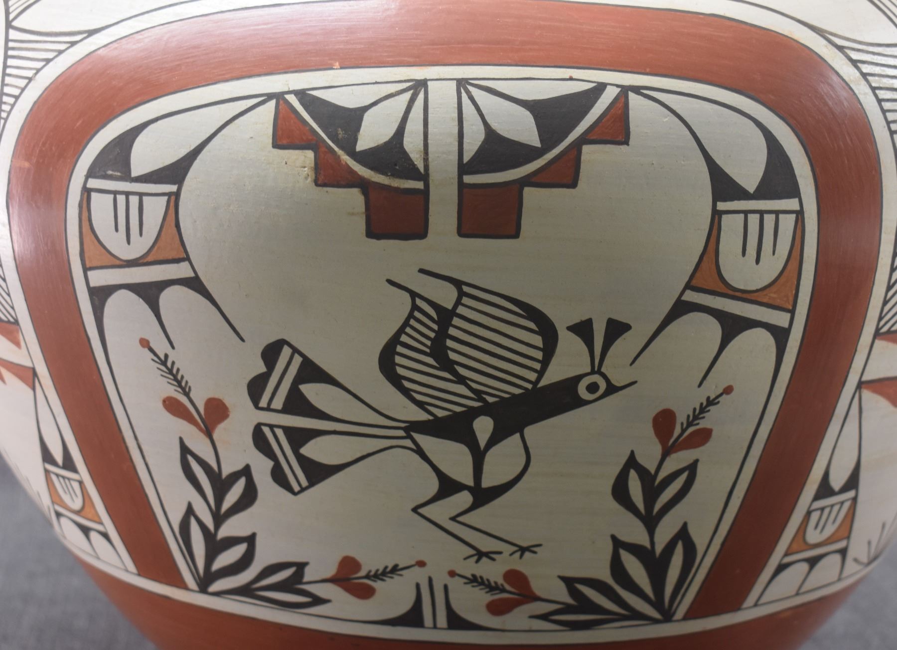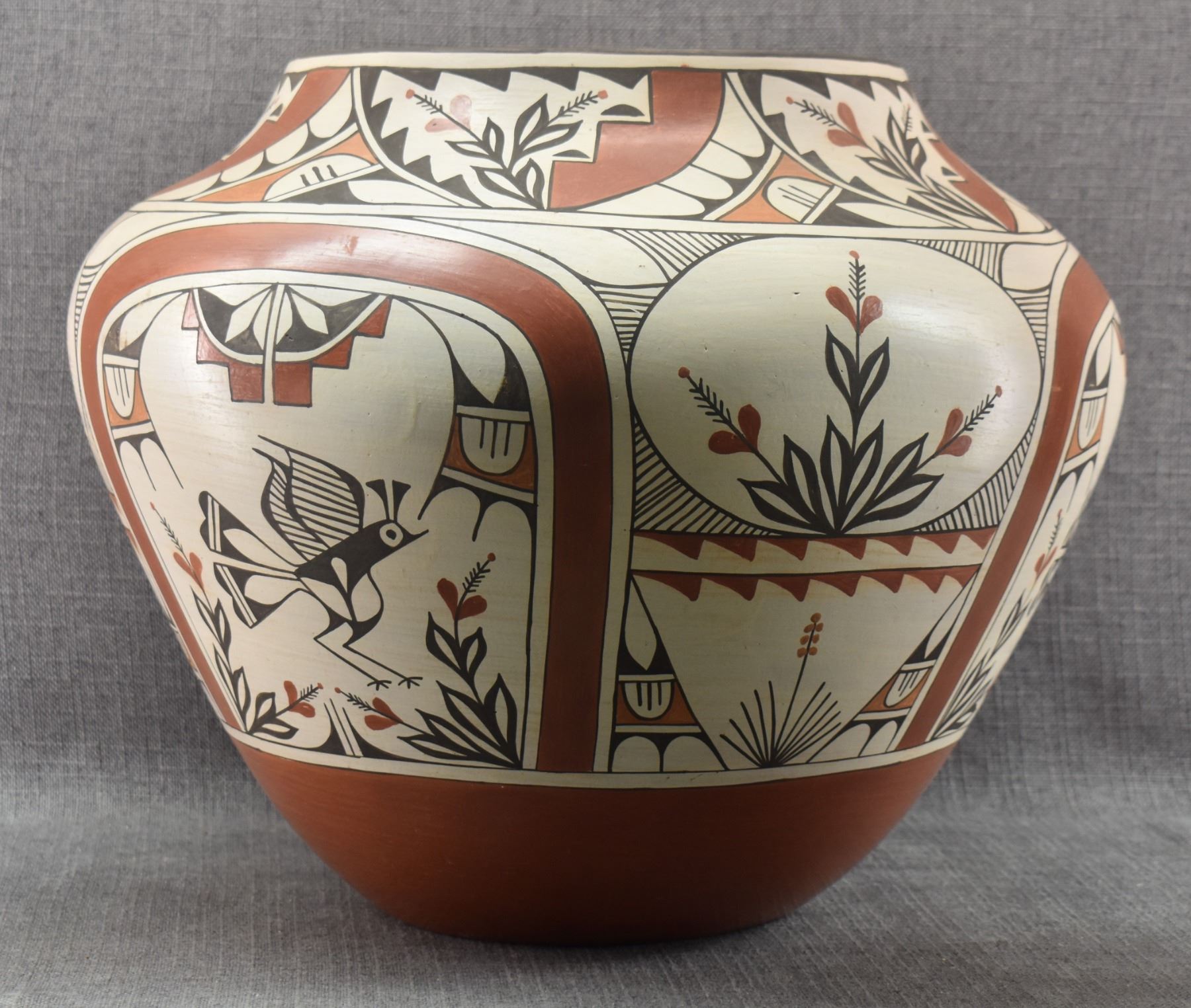 1980's Zia. Hand coiled traditional busy polychrome bird design pottery olla. signed Rudy Panana. 15'' x 18''