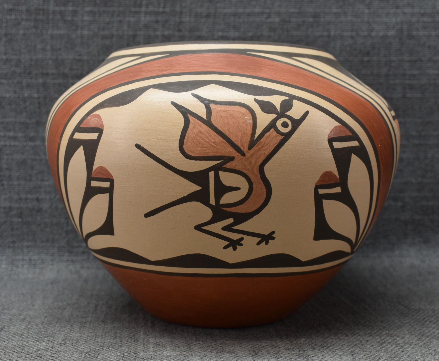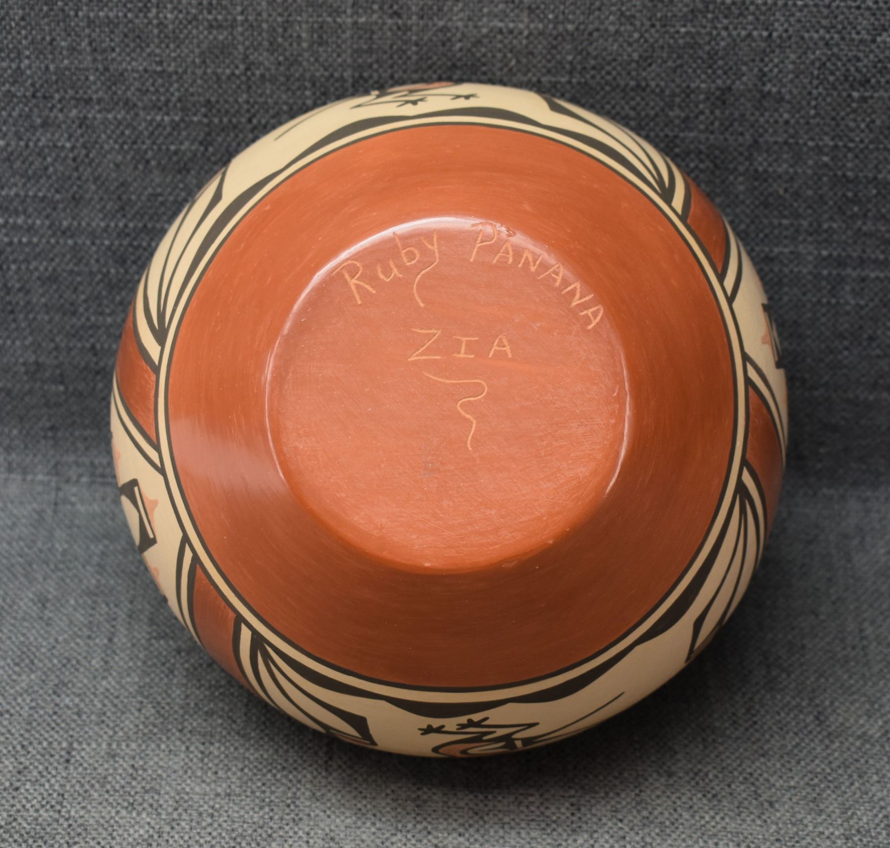 1980's Zia. Hand coiled traditional polychrome bird design pottery olla. signed Rudy Panana 5'' x 8''