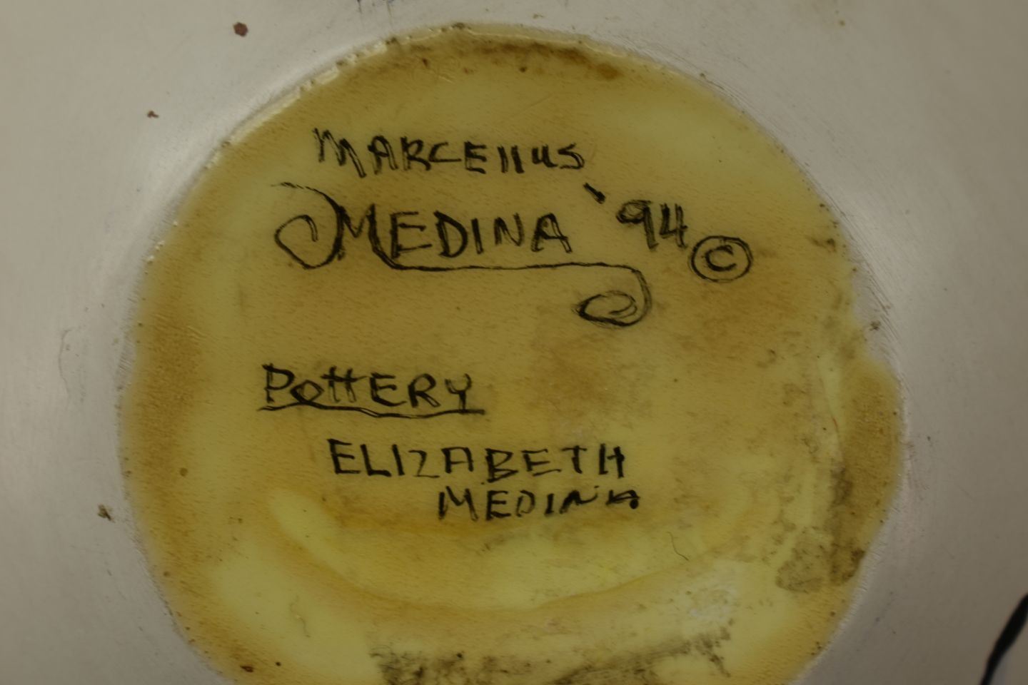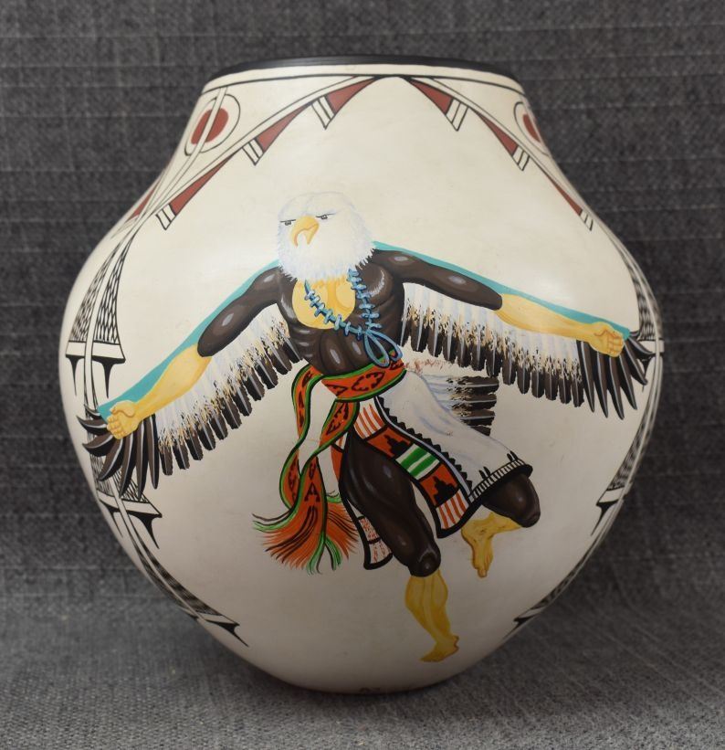 1994 Zia, hand coiled pottery vase by Elizabeth Medina, hand painted kachina dancer figures by Marcellus Medina 6.25" x 6.25"