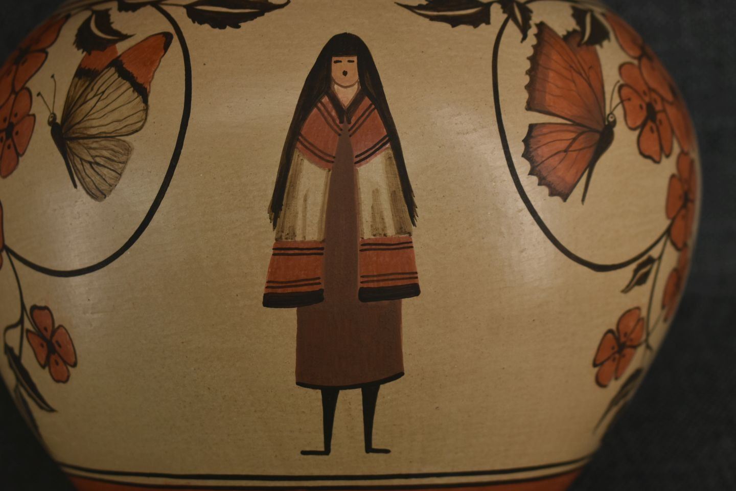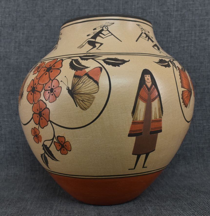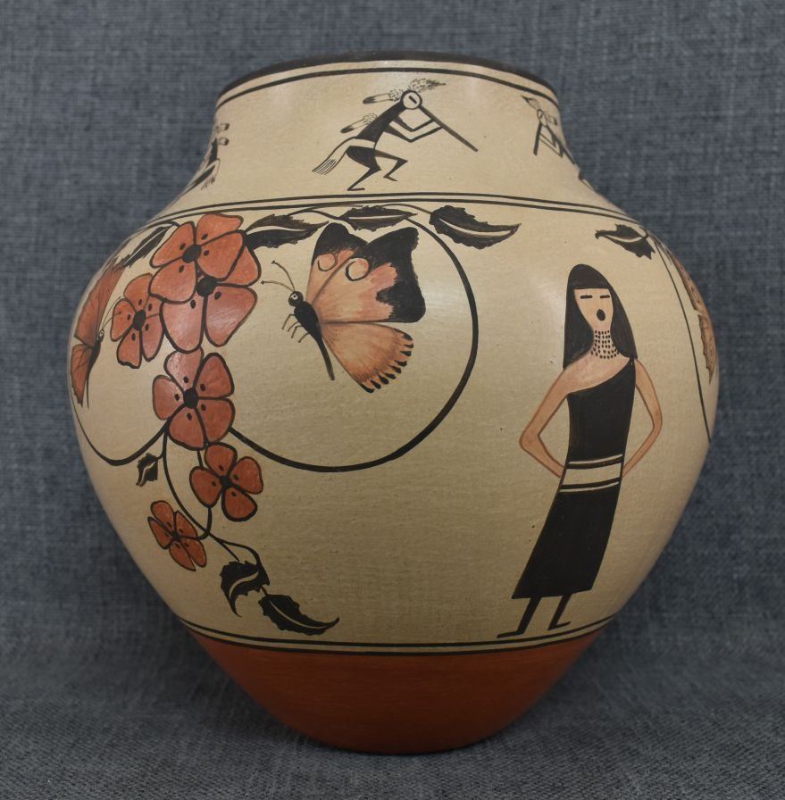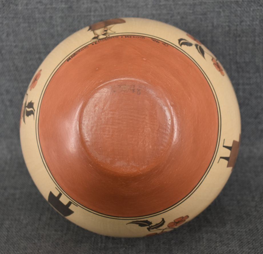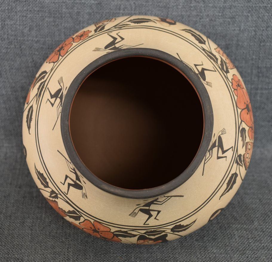 2006. Zia. Hand coiled and painted pueblo dancer design. Pottery olla signed Elizabeth & Marcellus Medina. 9'' x 7.58