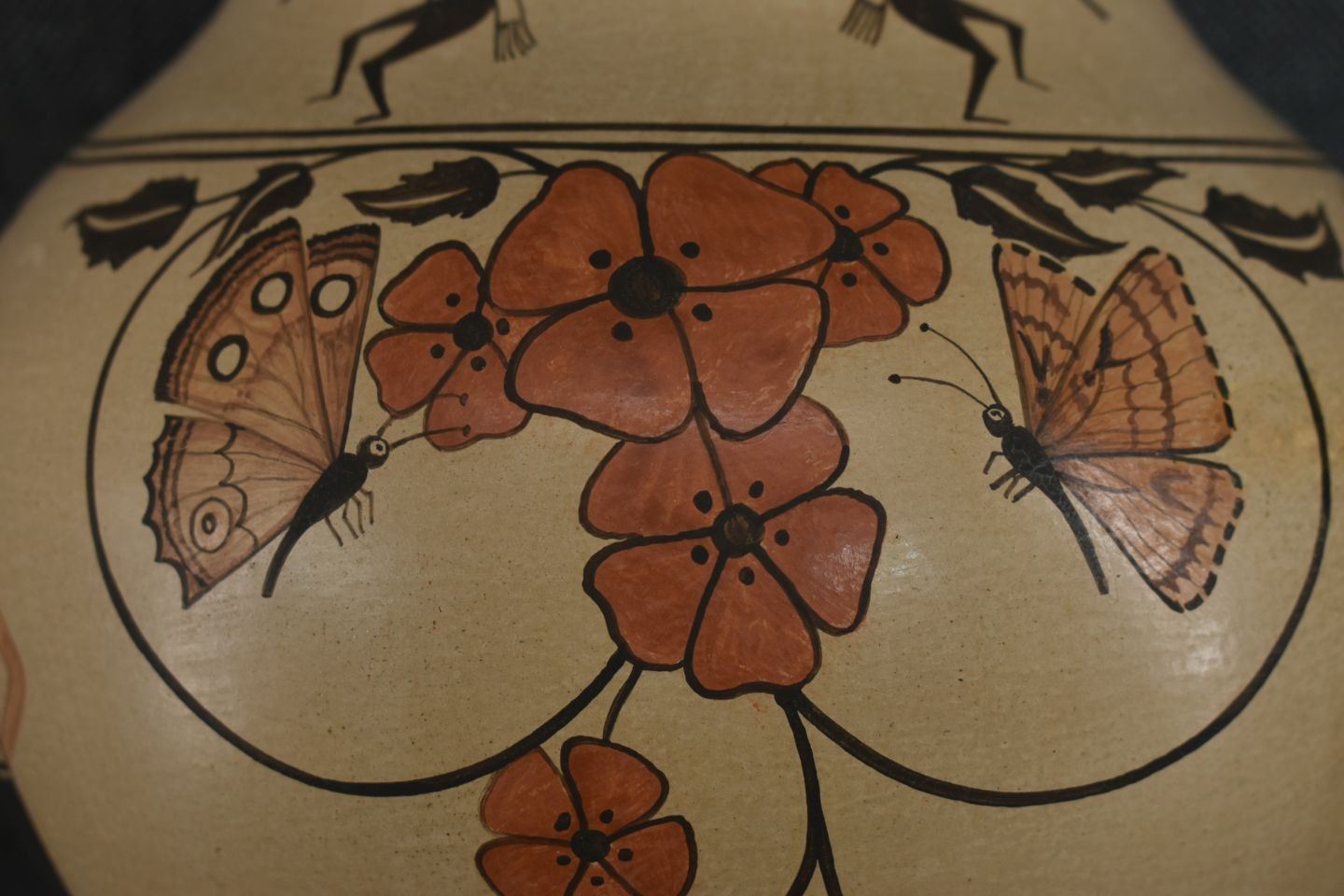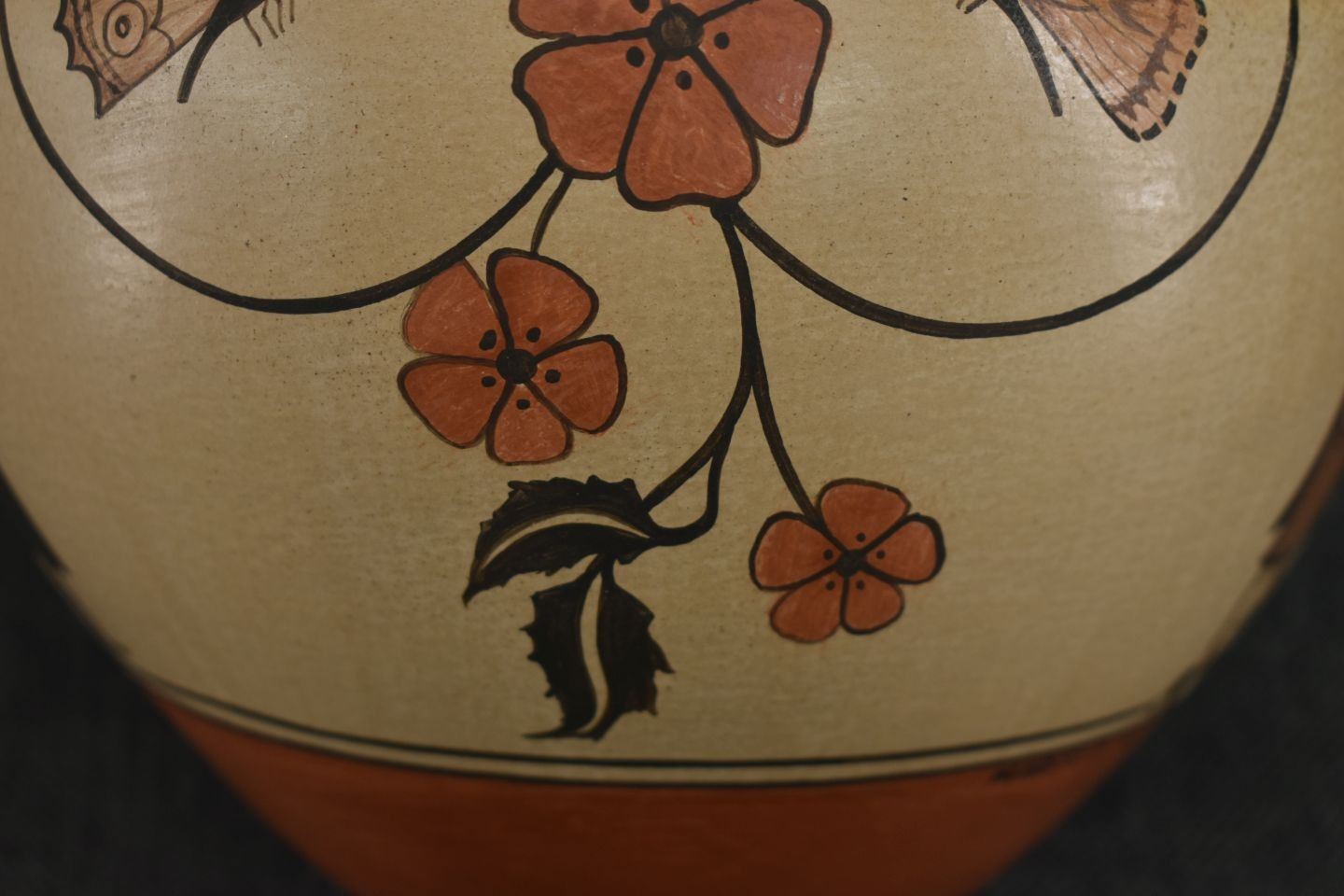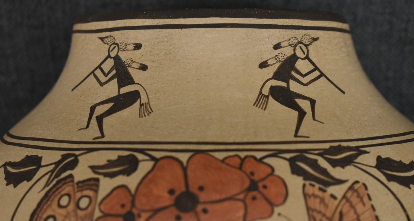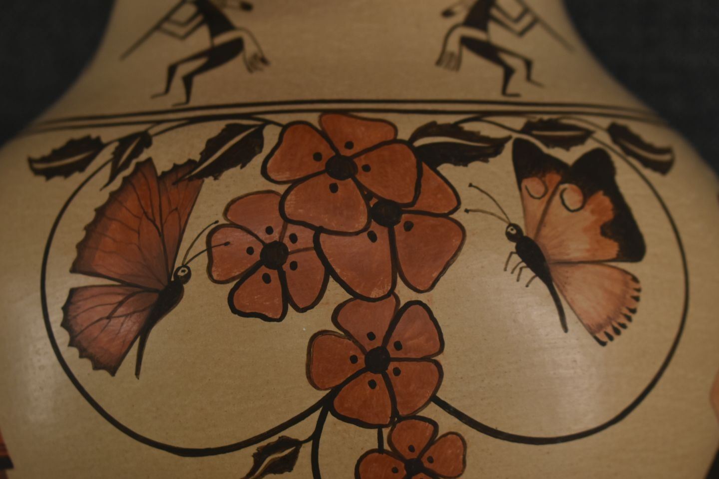 2006. Zia. Hand coiled and painted pueblo dancer design. Pottery olla signed Elizabeth & Marcellus Medina. 9'' x 7.58