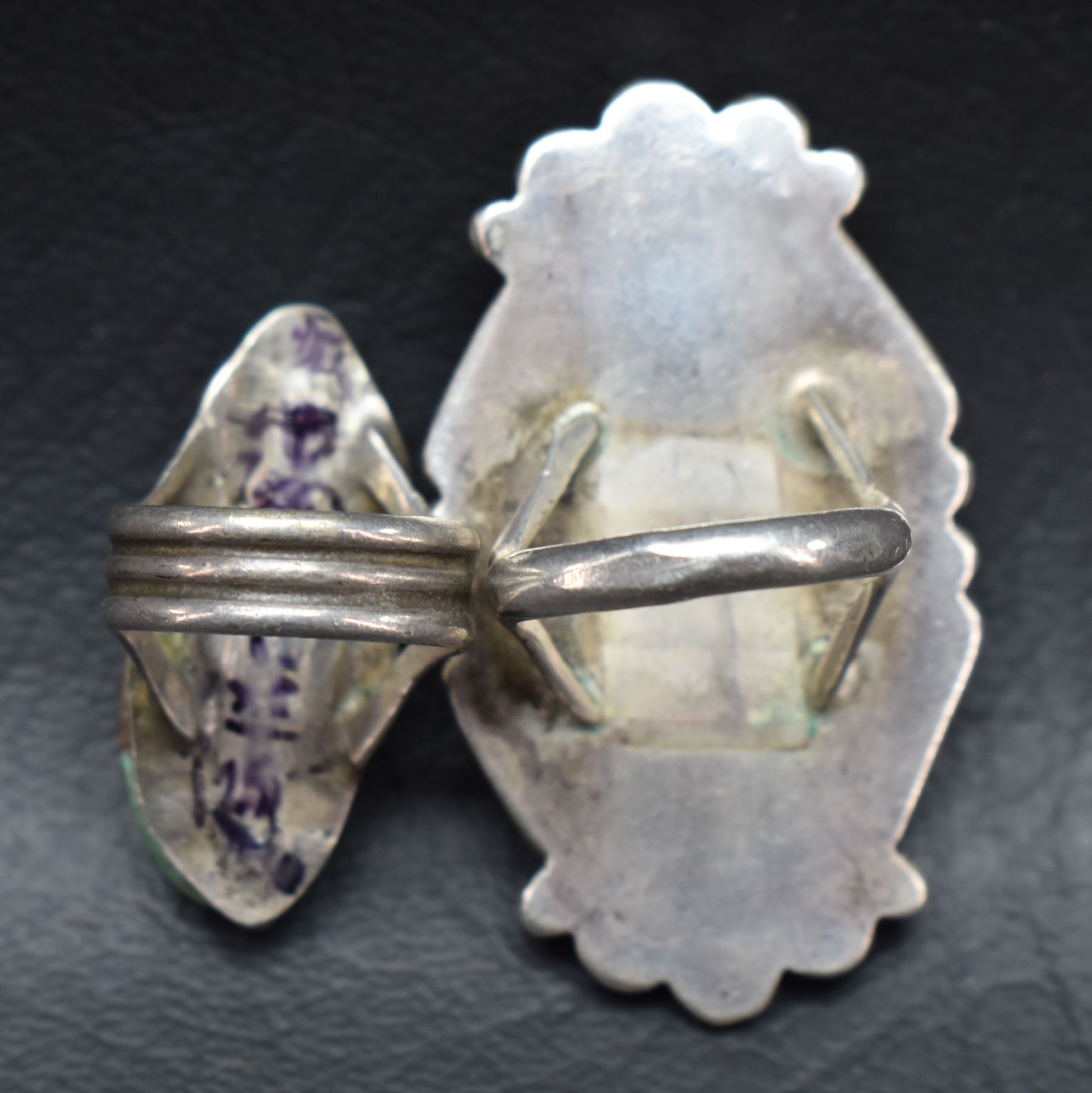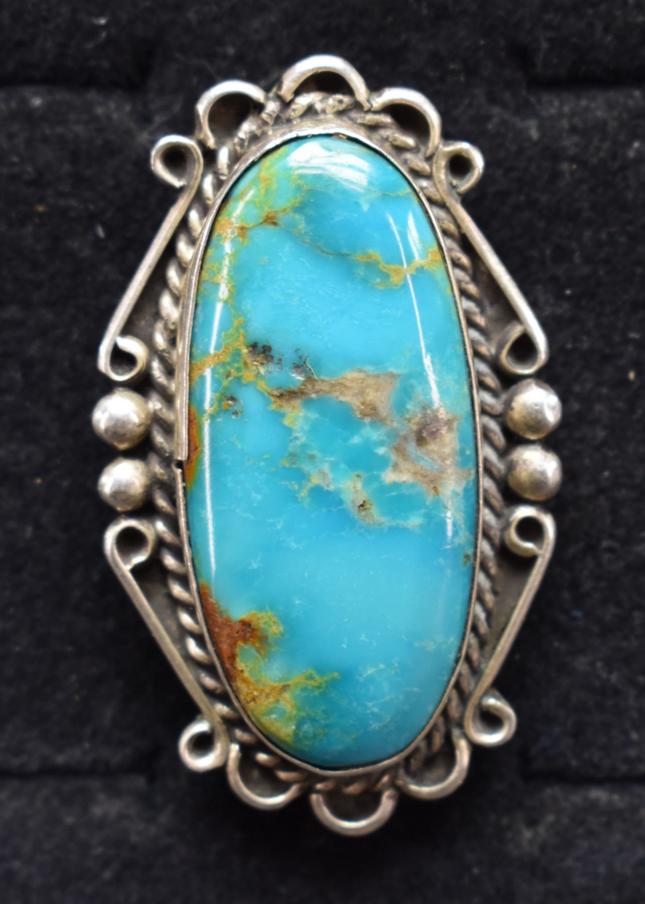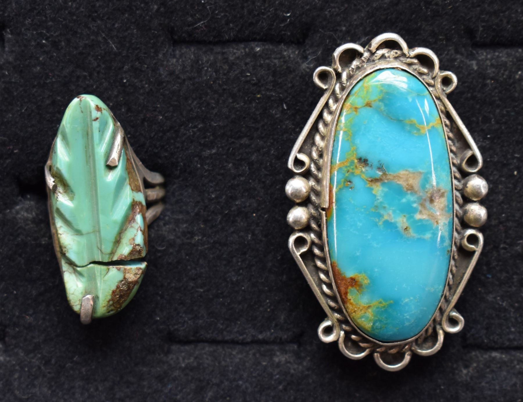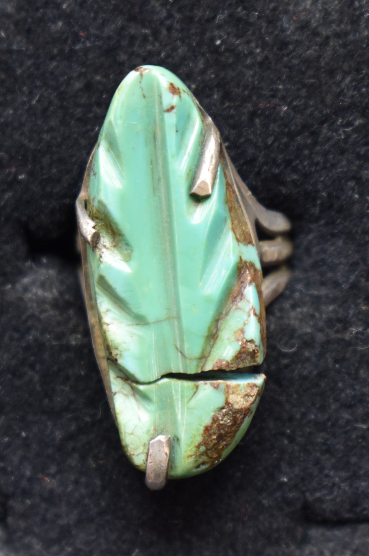 1960-70's Navajo Indian sterling silver and turquoise size 6.5 Zuni Indian sterling silver with carved turquoise leaf size 5, stone is cracked total weight 23 grams