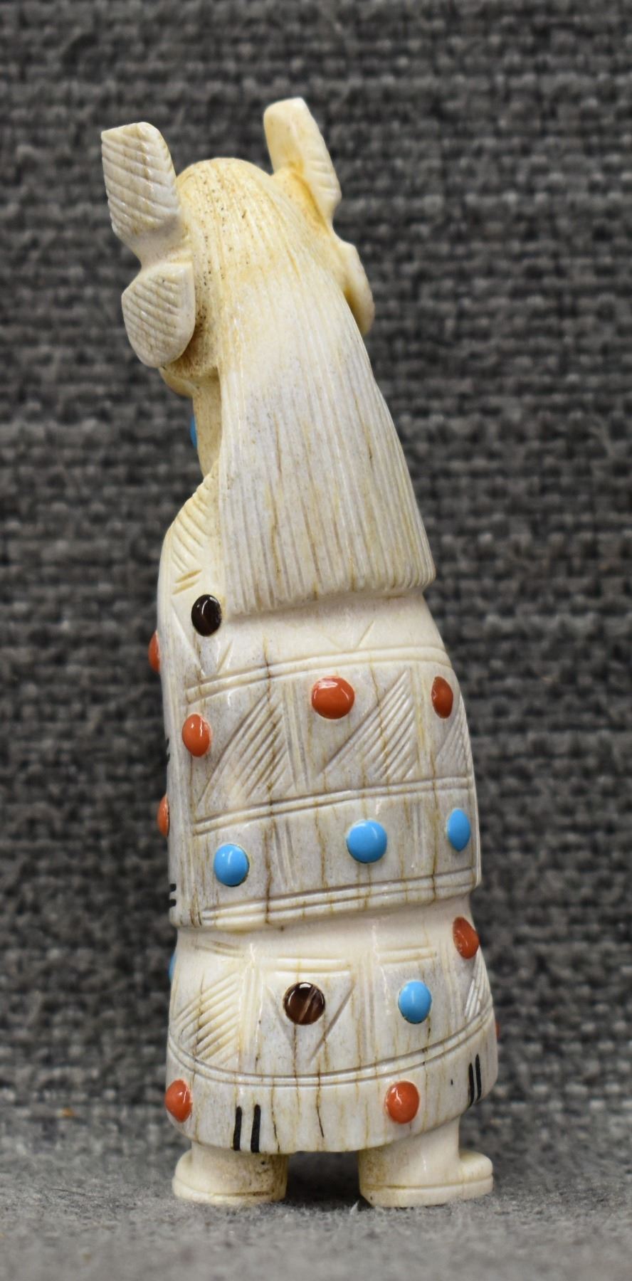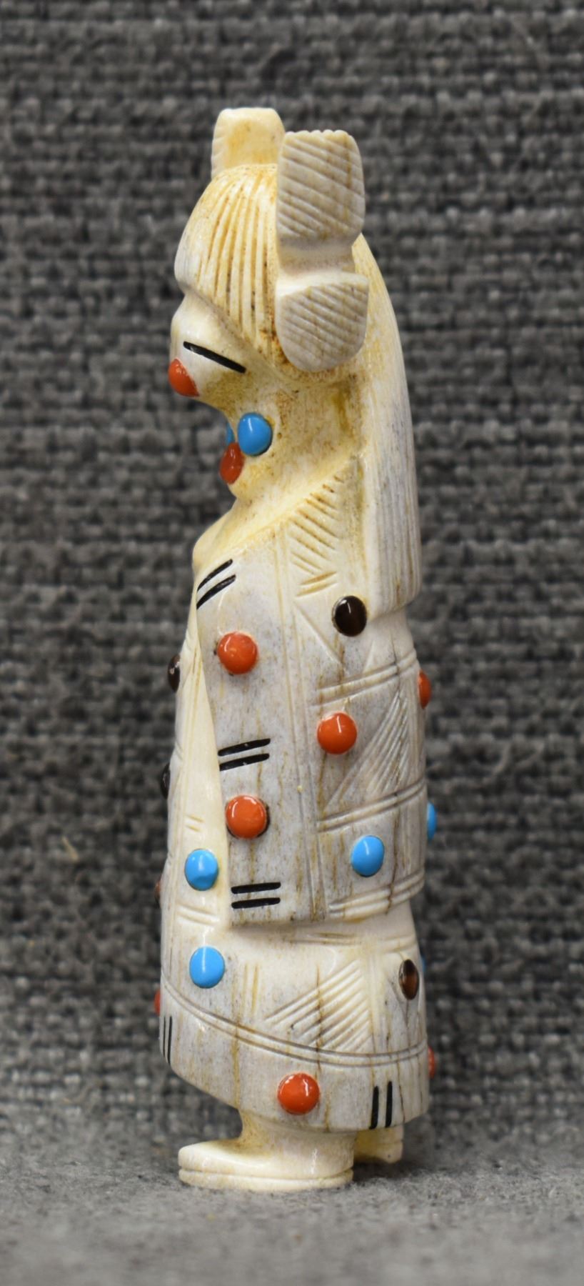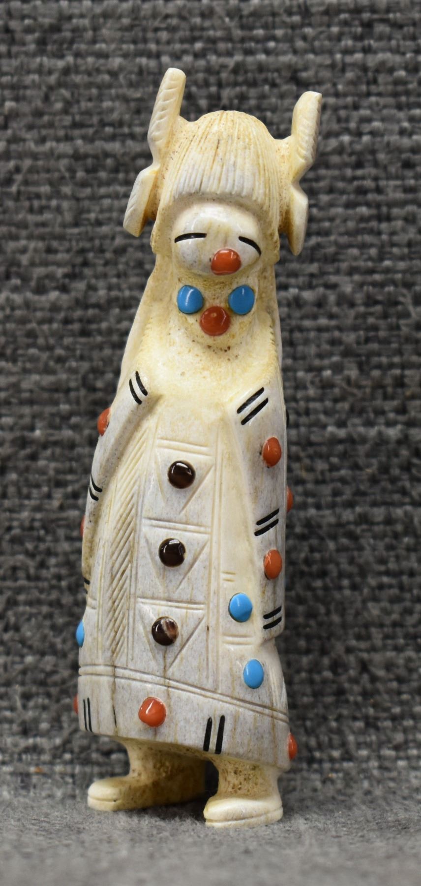 2000's Zuni, carved antler depicting Maiden with lapis turquoise coral and tiger eye by Troy. Scie 3.25" tall