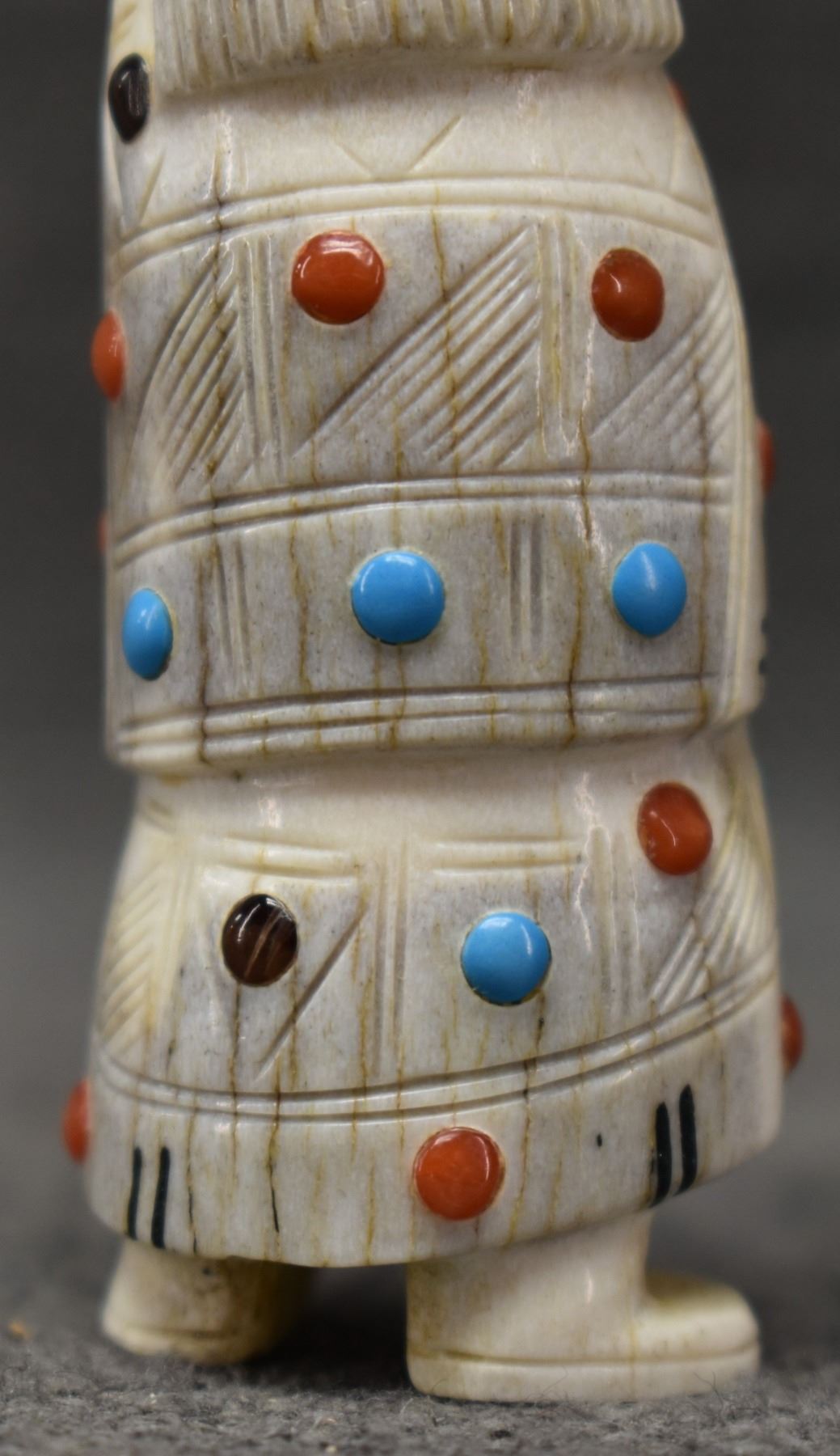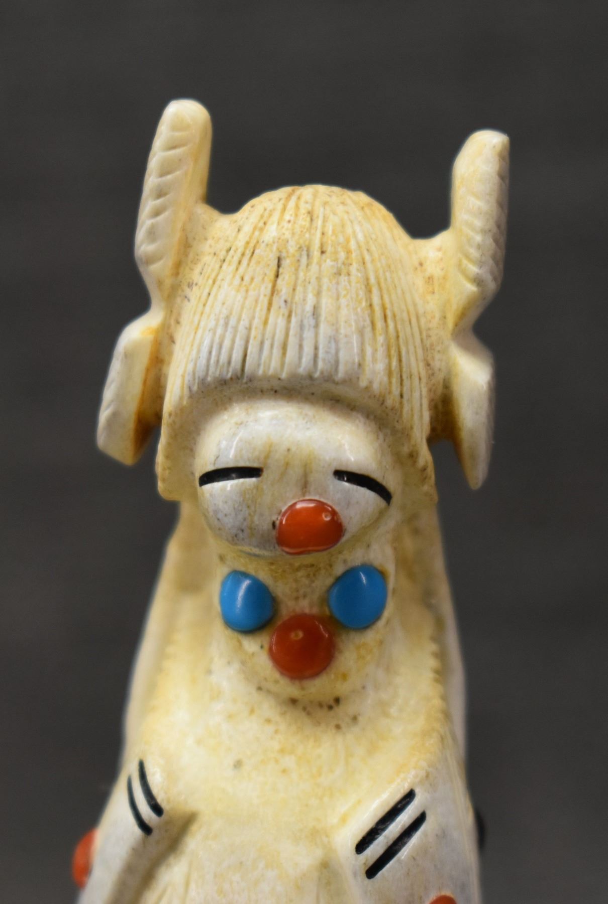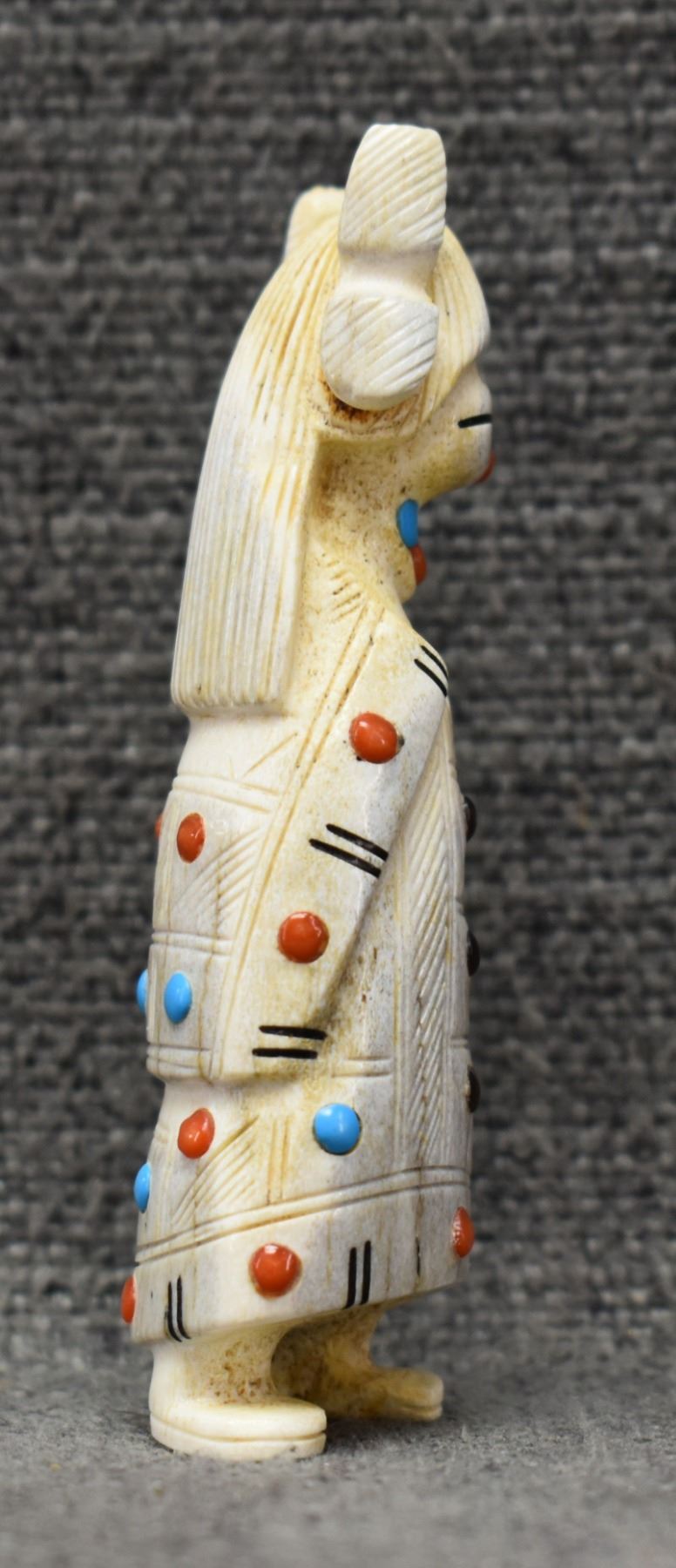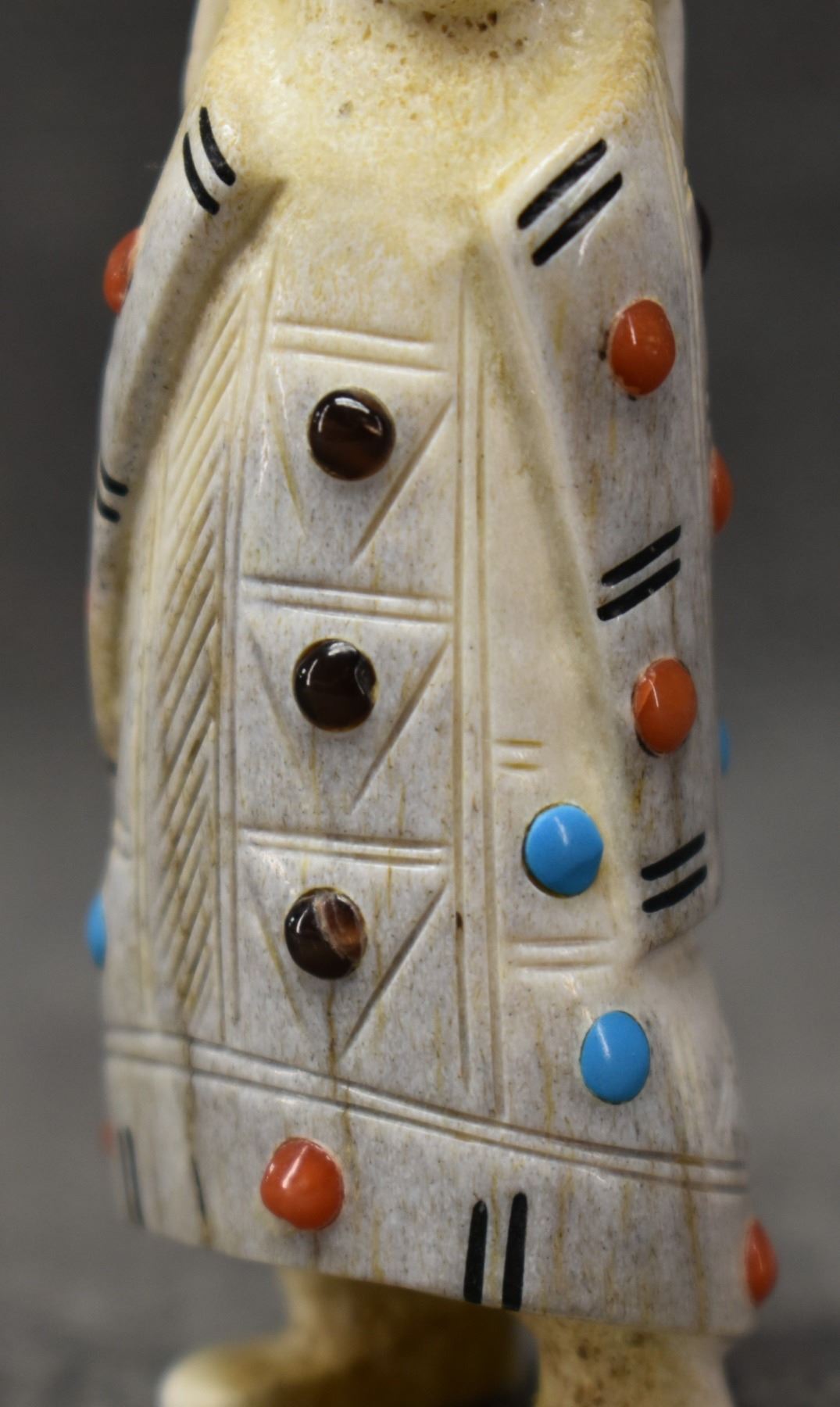 2000's Zuni, carved antler depicting Maiden with lapis turquoise coral and tiger eye by Troy. Scie 3.25" tall