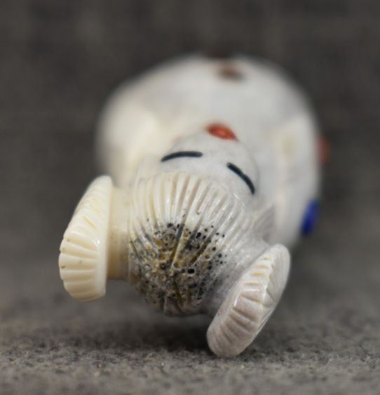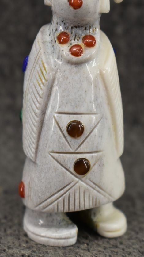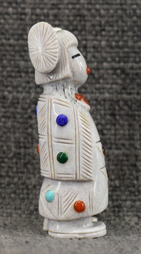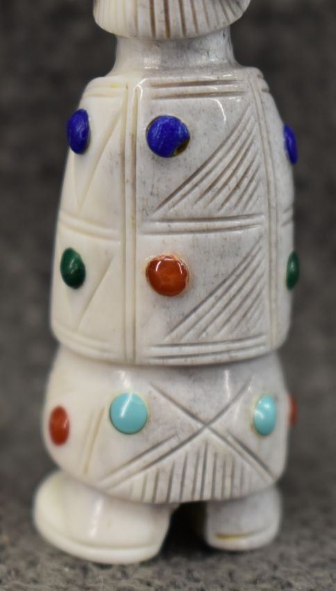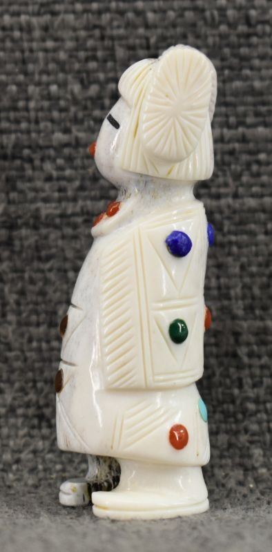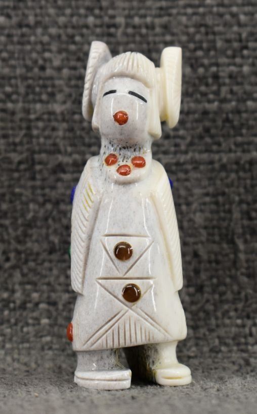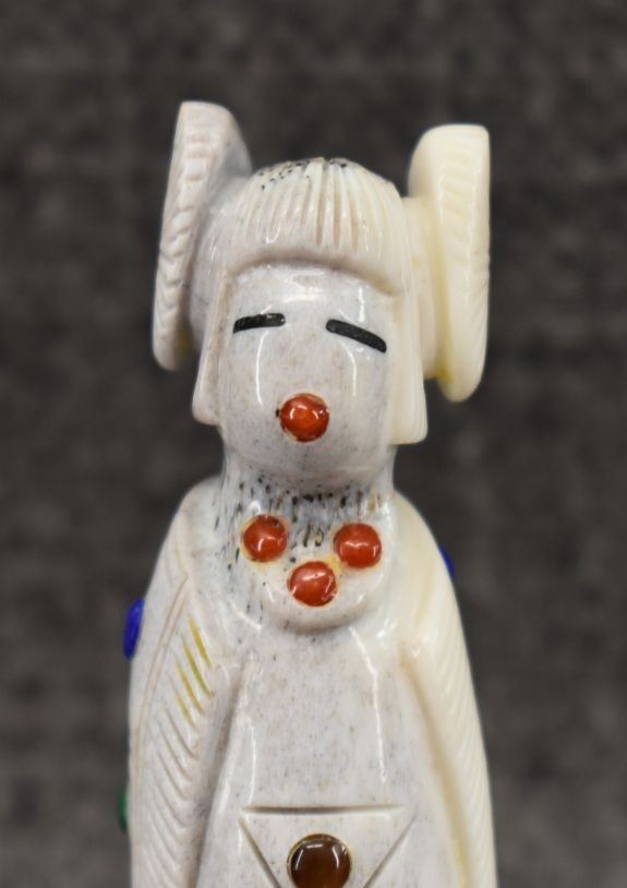 2004 Zuni, carved antler depicting Maiden with lapis turquoise coral and tiger eye by Troy Sice 2.5" x .75"