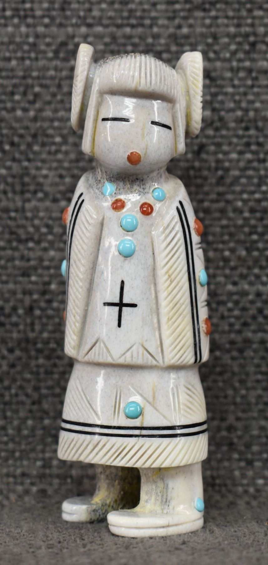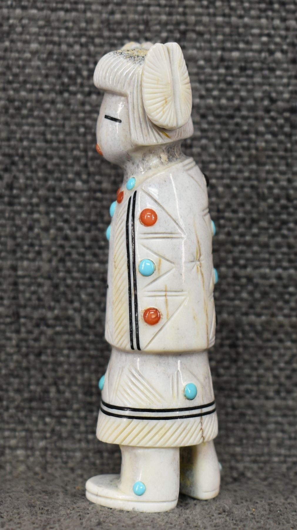 2000's Zuni, carved antler depicting Maiden with lapis turquoise coral and tiger eye by Troy Sice 3.25" x 1.25"
