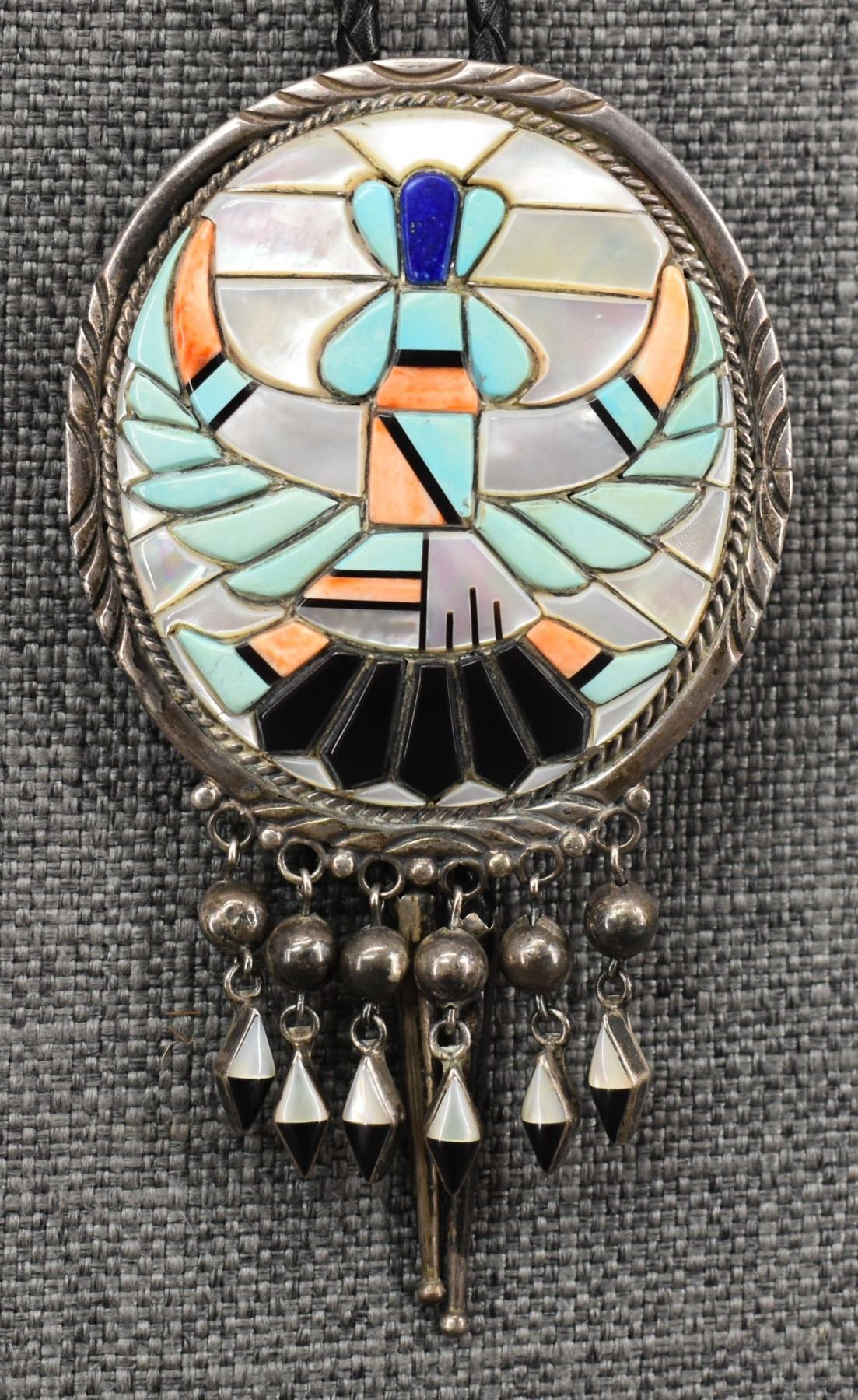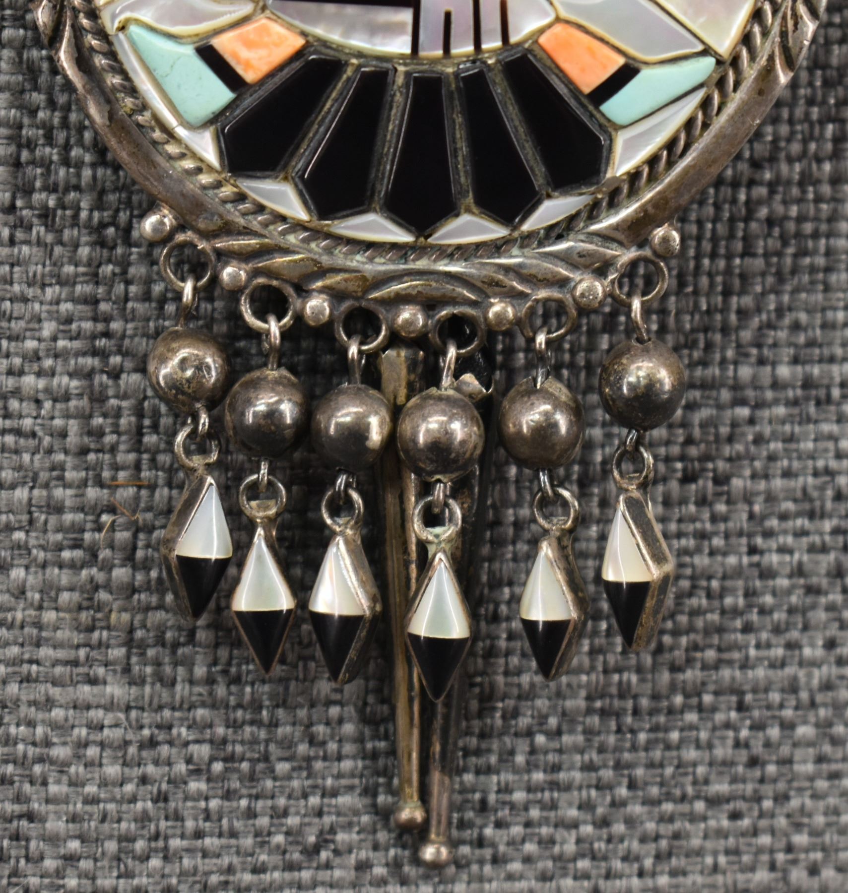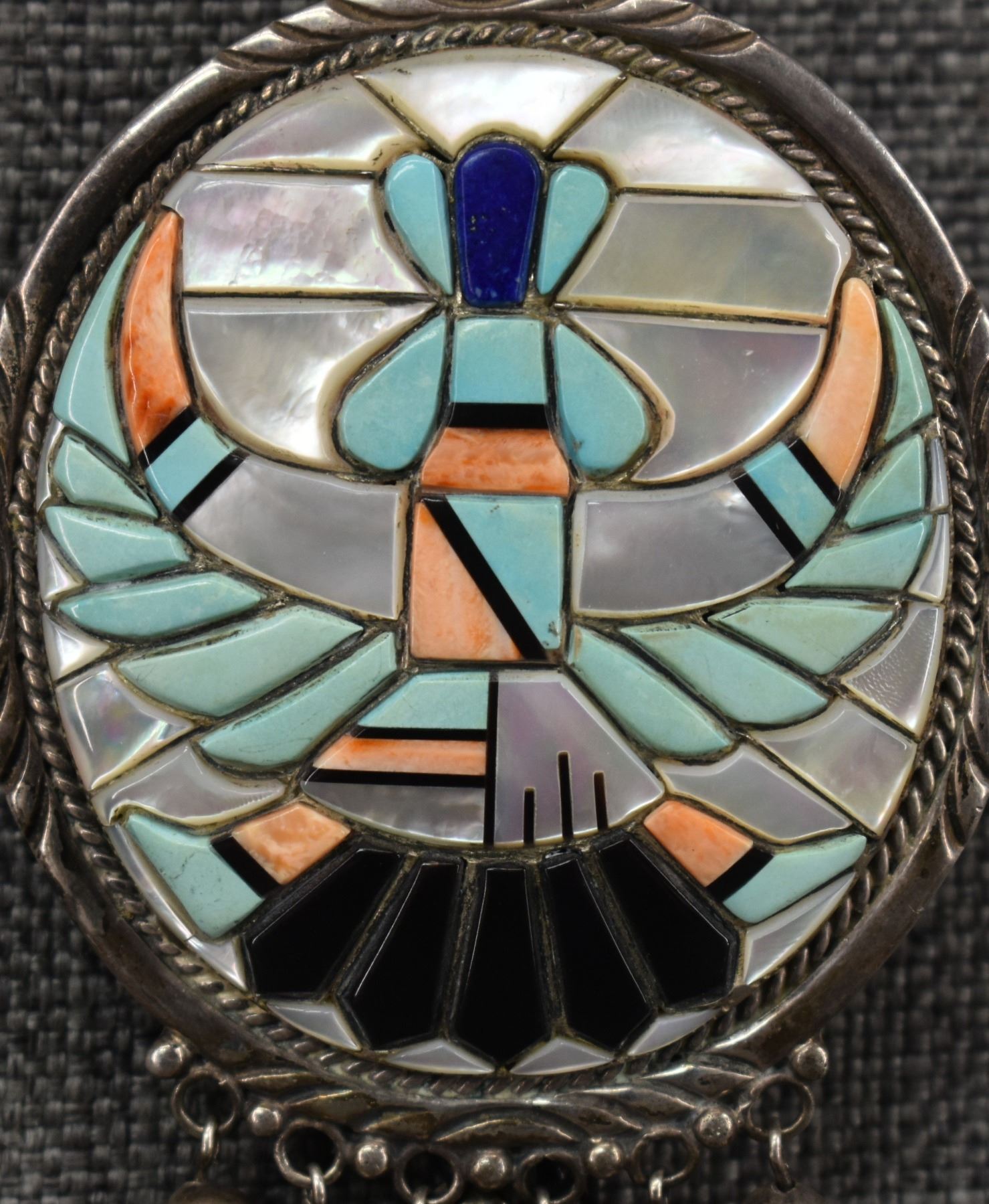 1970's Zuni, sterling silver channel inlaid turquoise shell jet and Lapis knife wing figure signed A. 4.25" x 2.75", total weight 101 grams