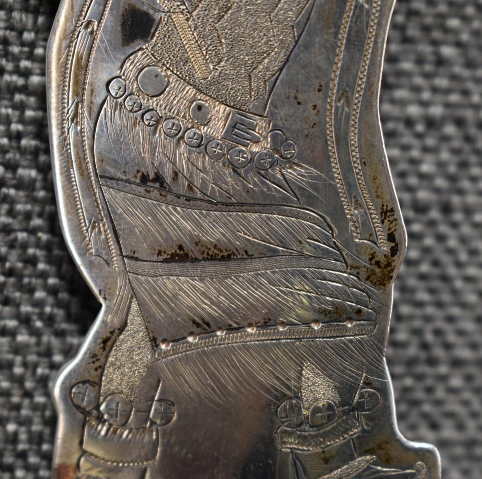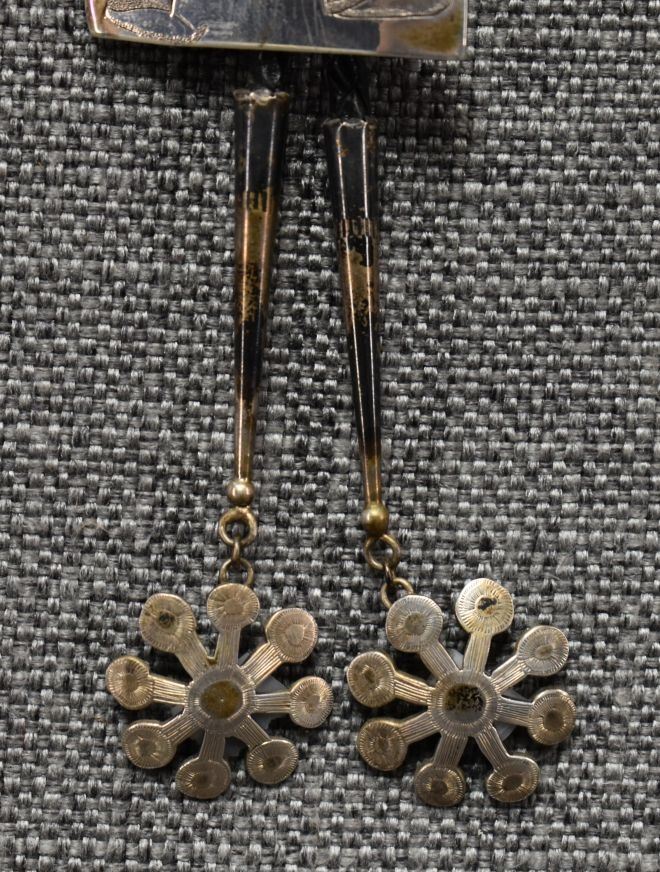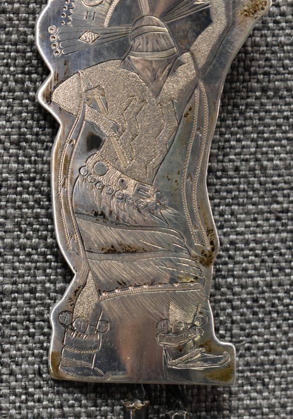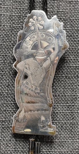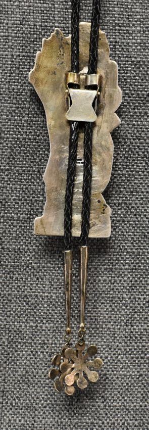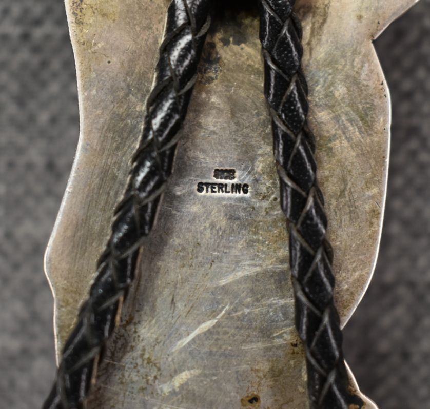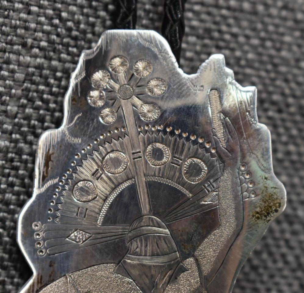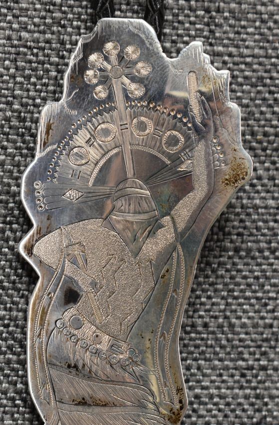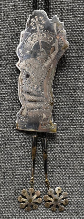 1980's Zuni. Sterling silver bolo depicting Crown Dancer, signed Sice. 4.5'' x 2'' total weight 83 grams