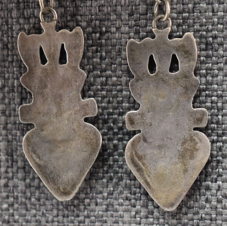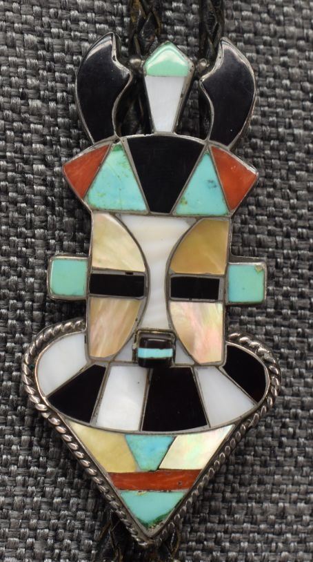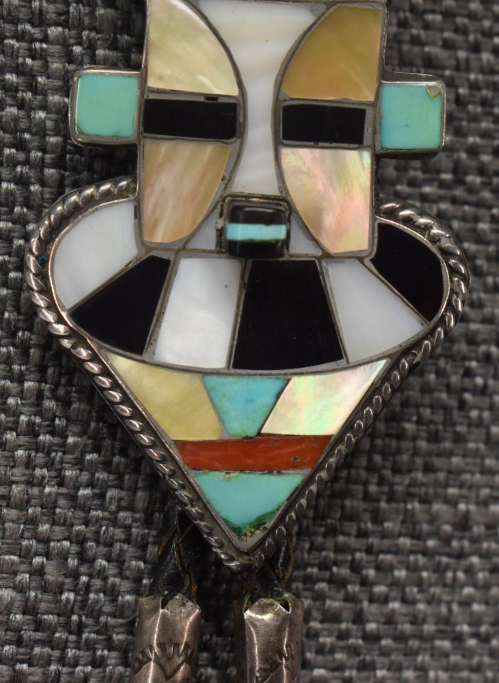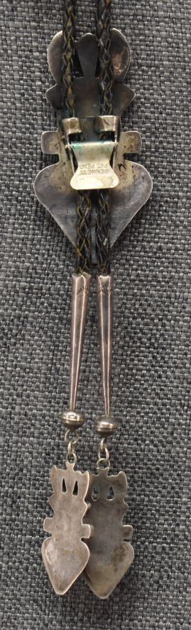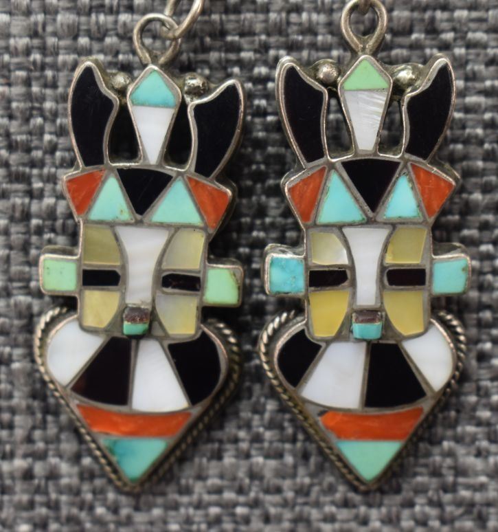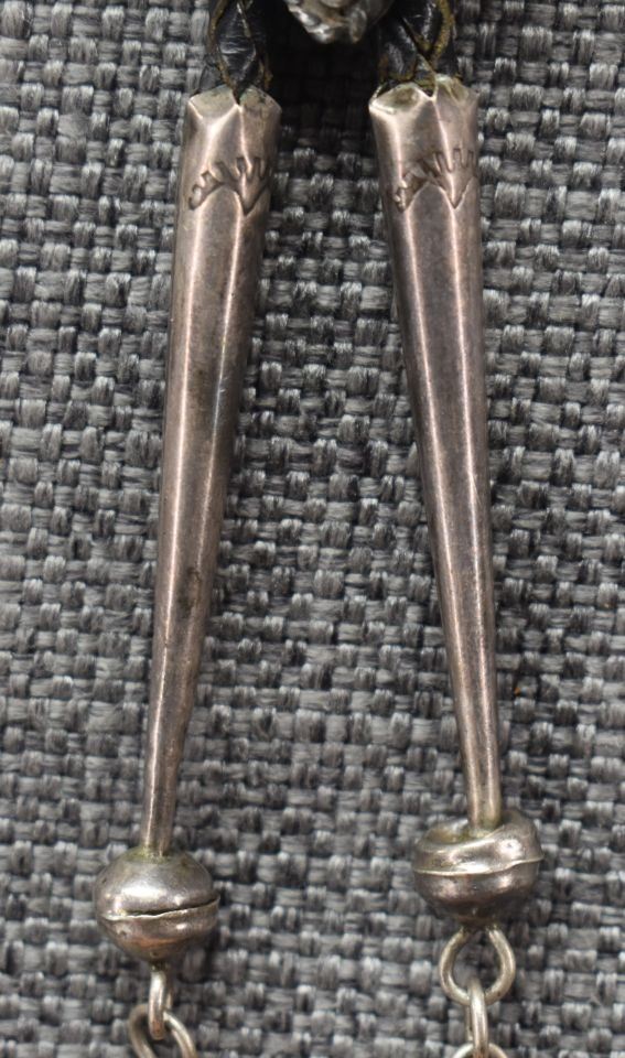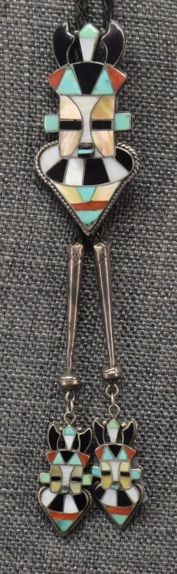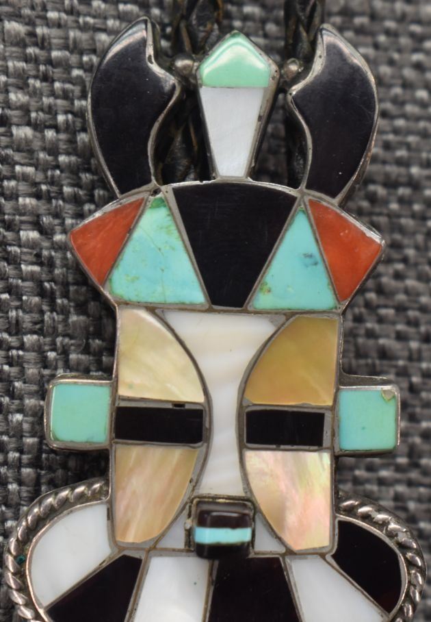1970-80's Zuni, sterling silver with channel inlaid turquoise shell and coral by Lichen L Shetima 3" x 1.5" with matching tips 1.75" x .75" total weight 50 grams