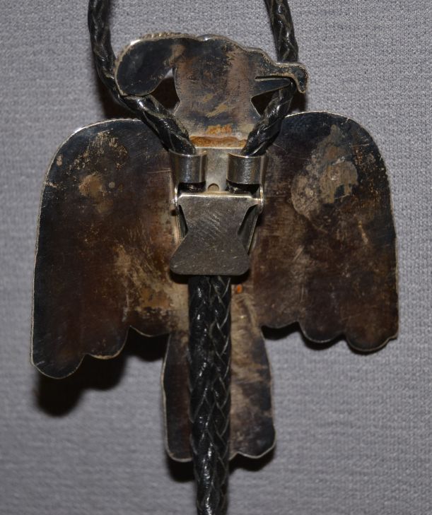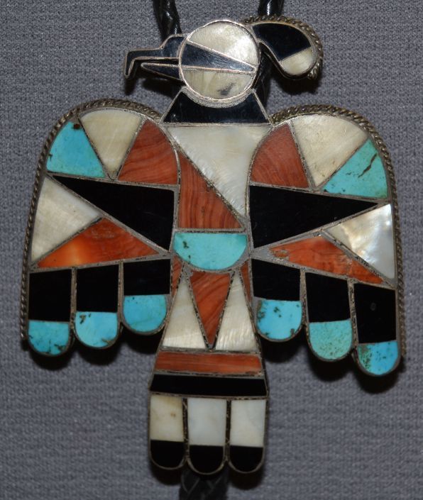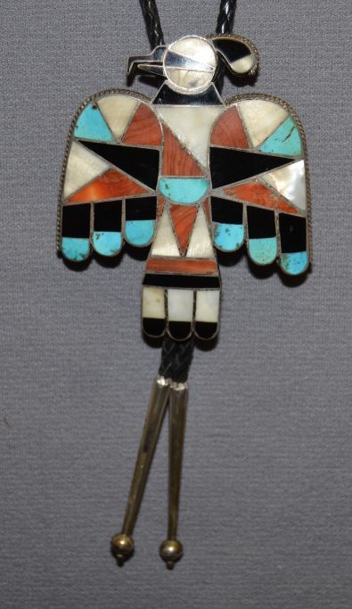1940's channel inlayed thunder bird turquoise , jet and shell 3.5" x 3"