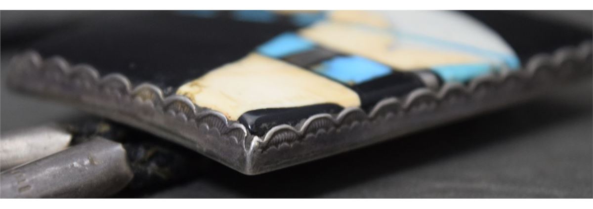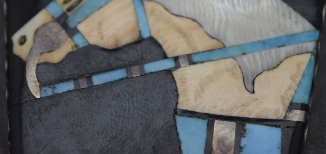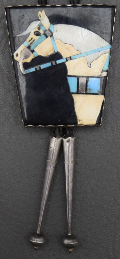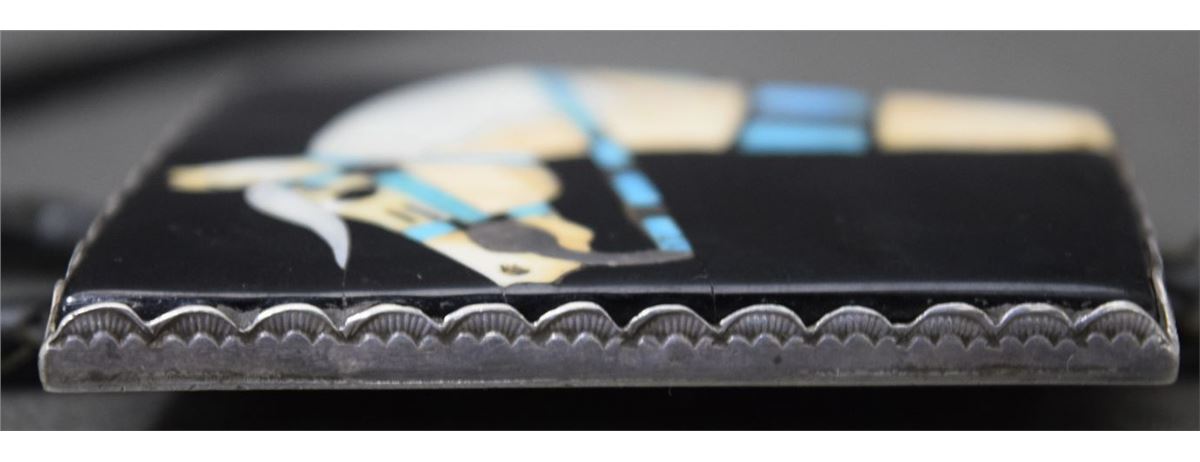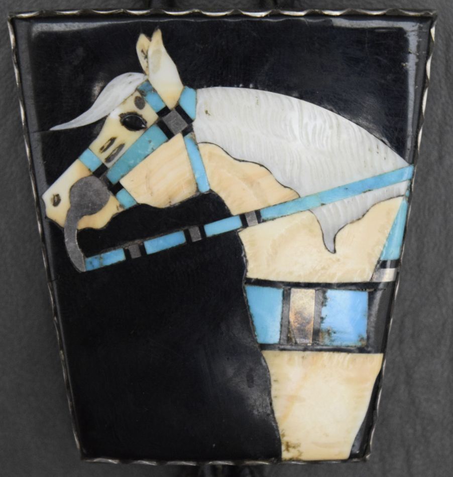 1950's turquoise shell and jet depicting horse head set in sterling silver 2.25'' x 2''