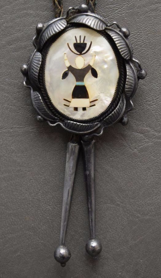 1960's mosaic inlay shell depicting crown dancer set in sterling silver . 2.25'' x 2'' total weight 47 grams