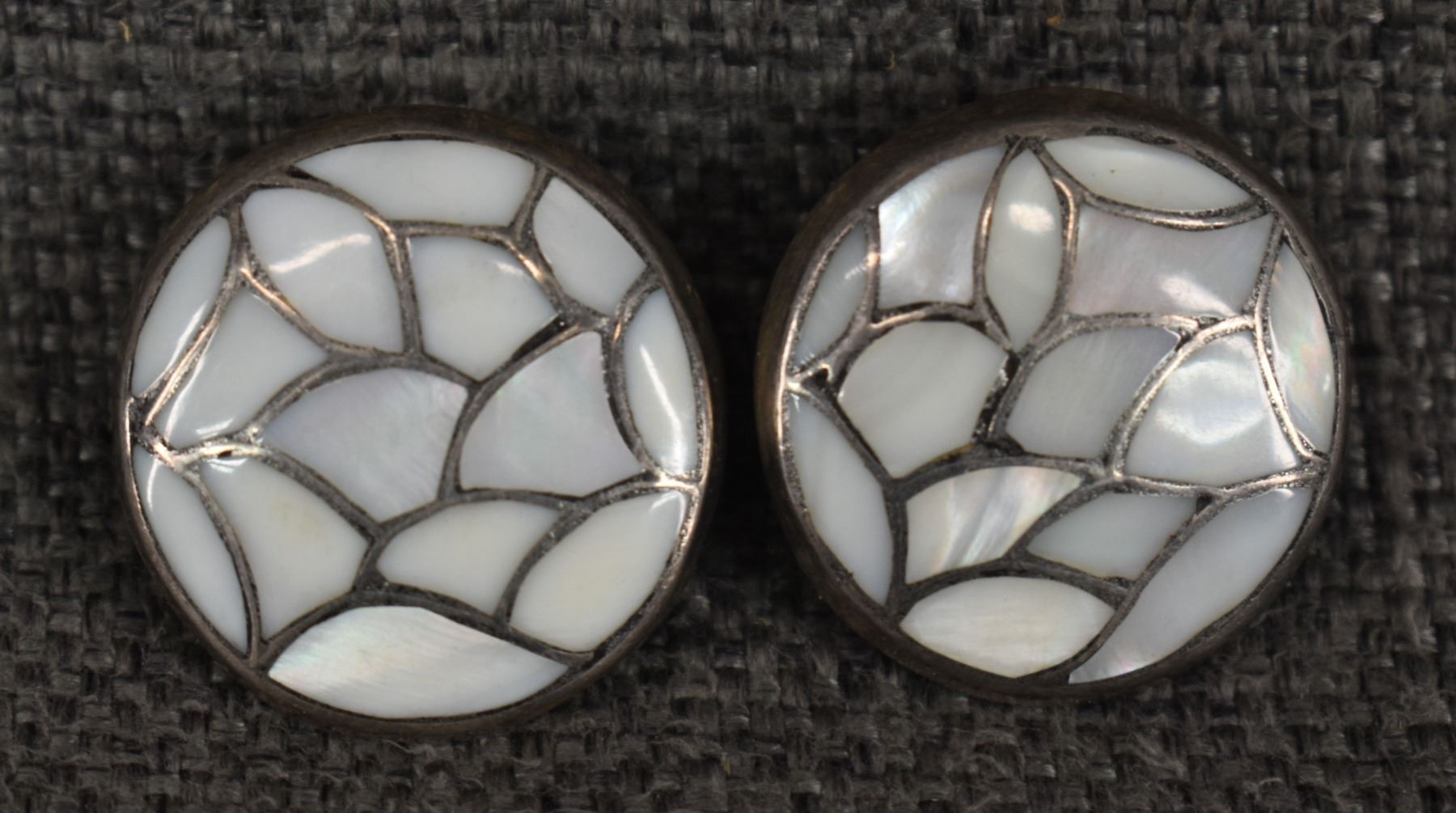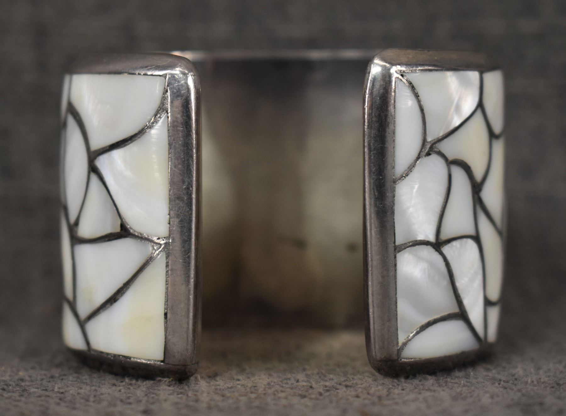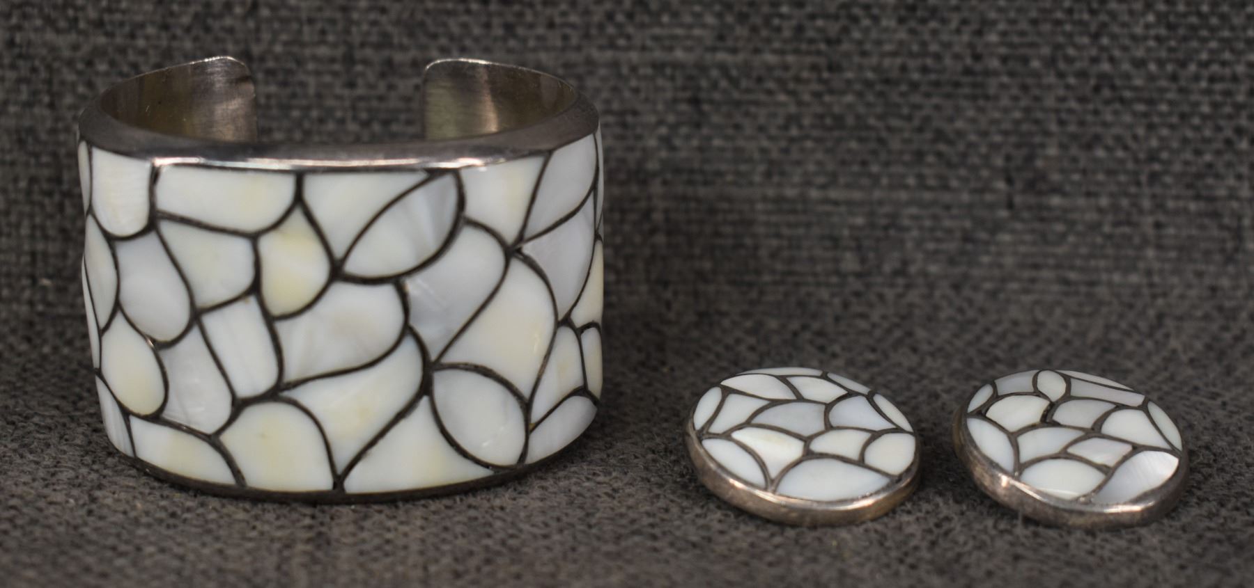 1960's Zuni, sterling silver channel inlaid shell, 1.5" x 5" x .75" earrings 1" diameter, total weight 90 grams