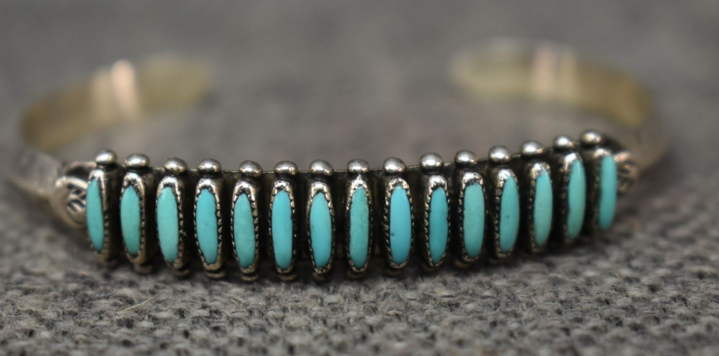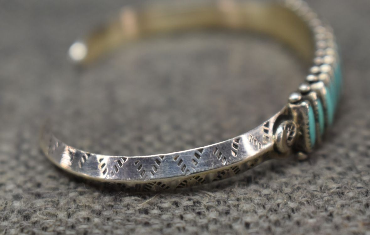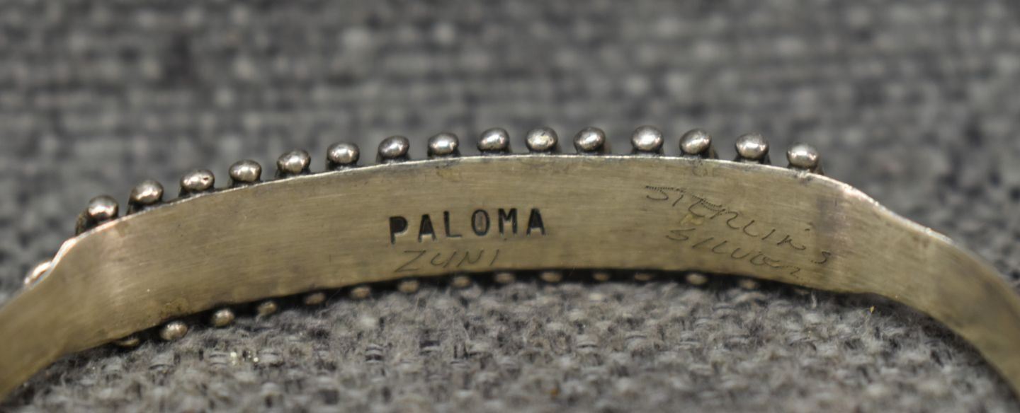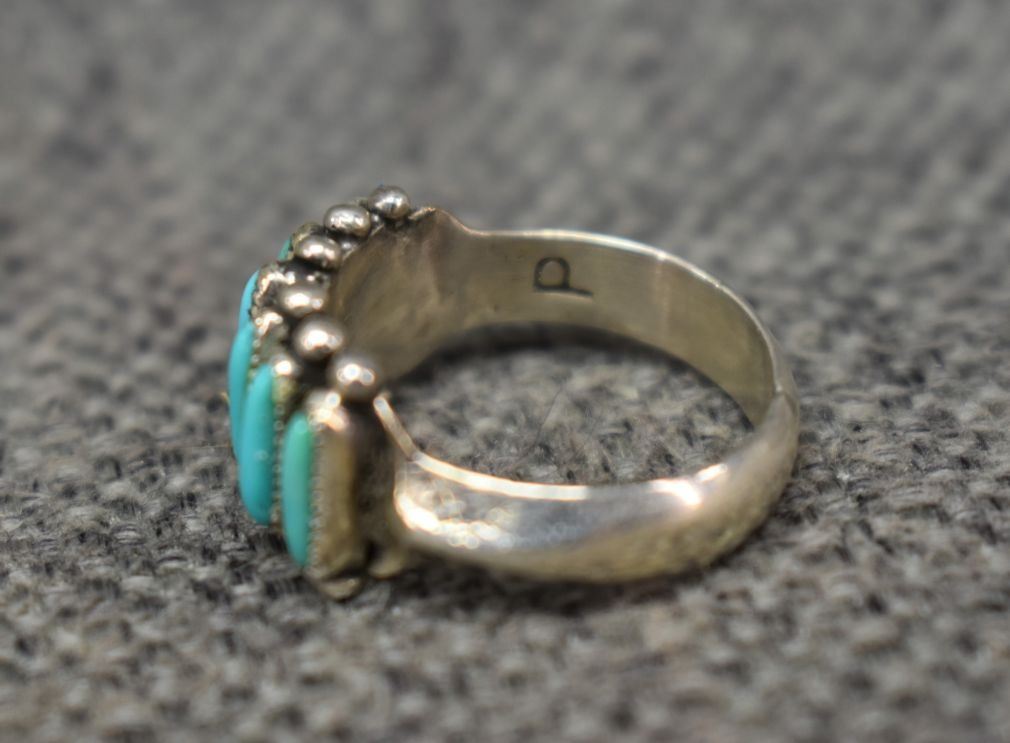 1980's Zuni, sterling silver with stamped design and needlepoint turquoise signed Paloma, 3/8" x 5" x 1" ring size 7 total weight 17 grams