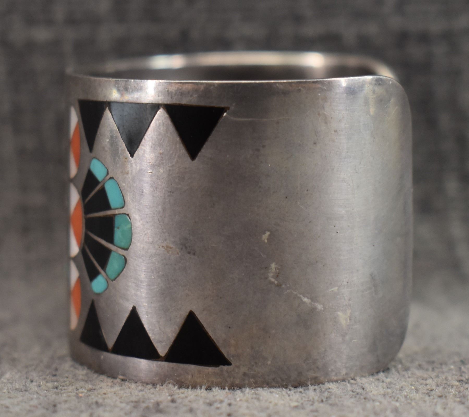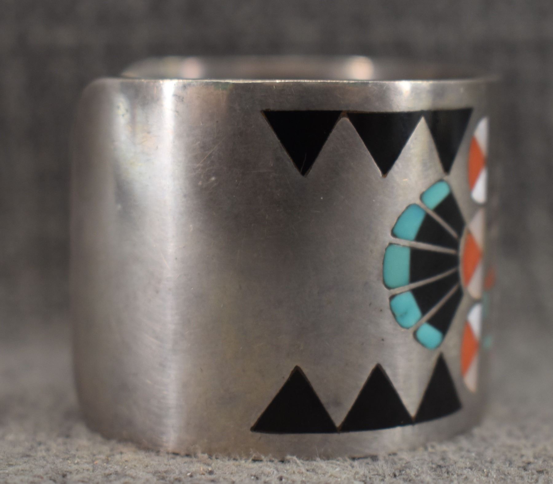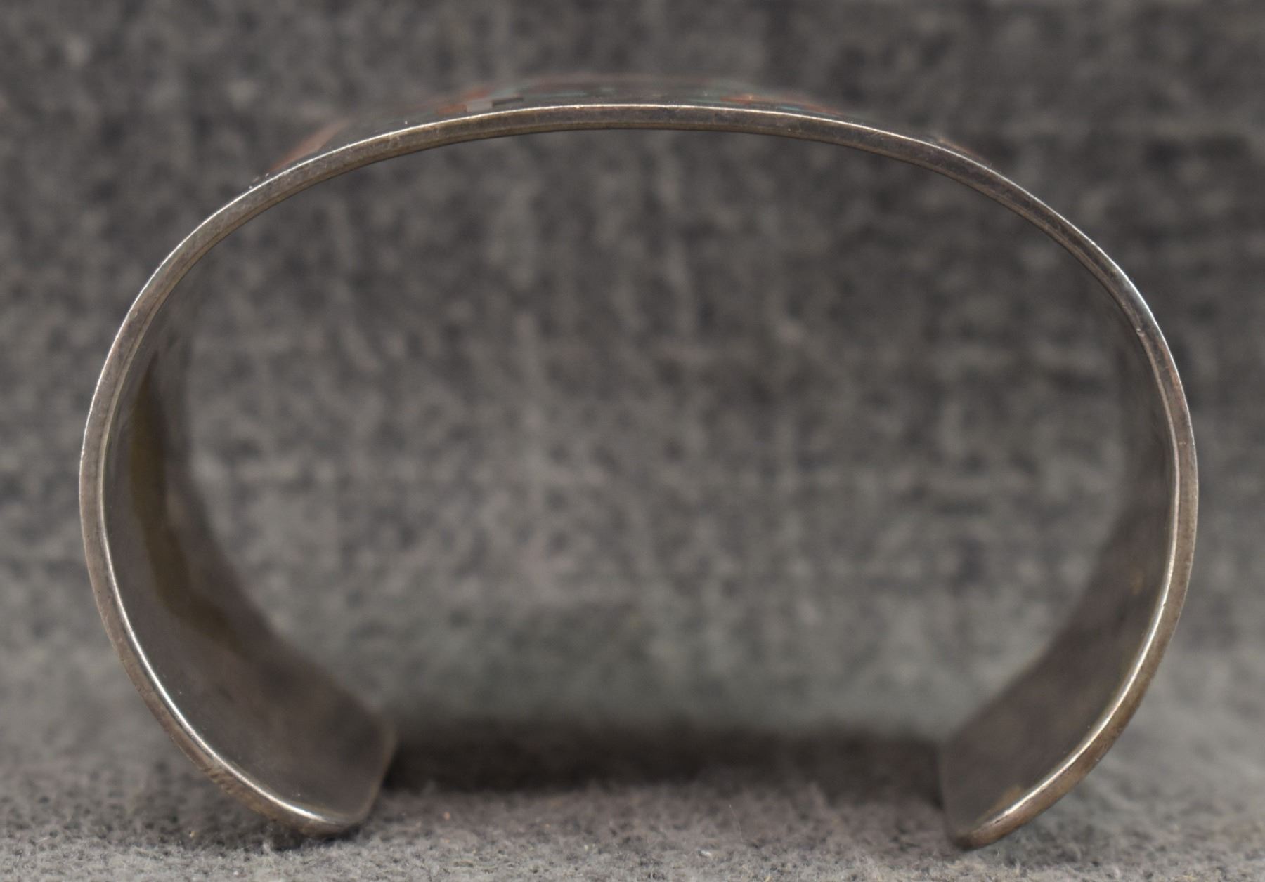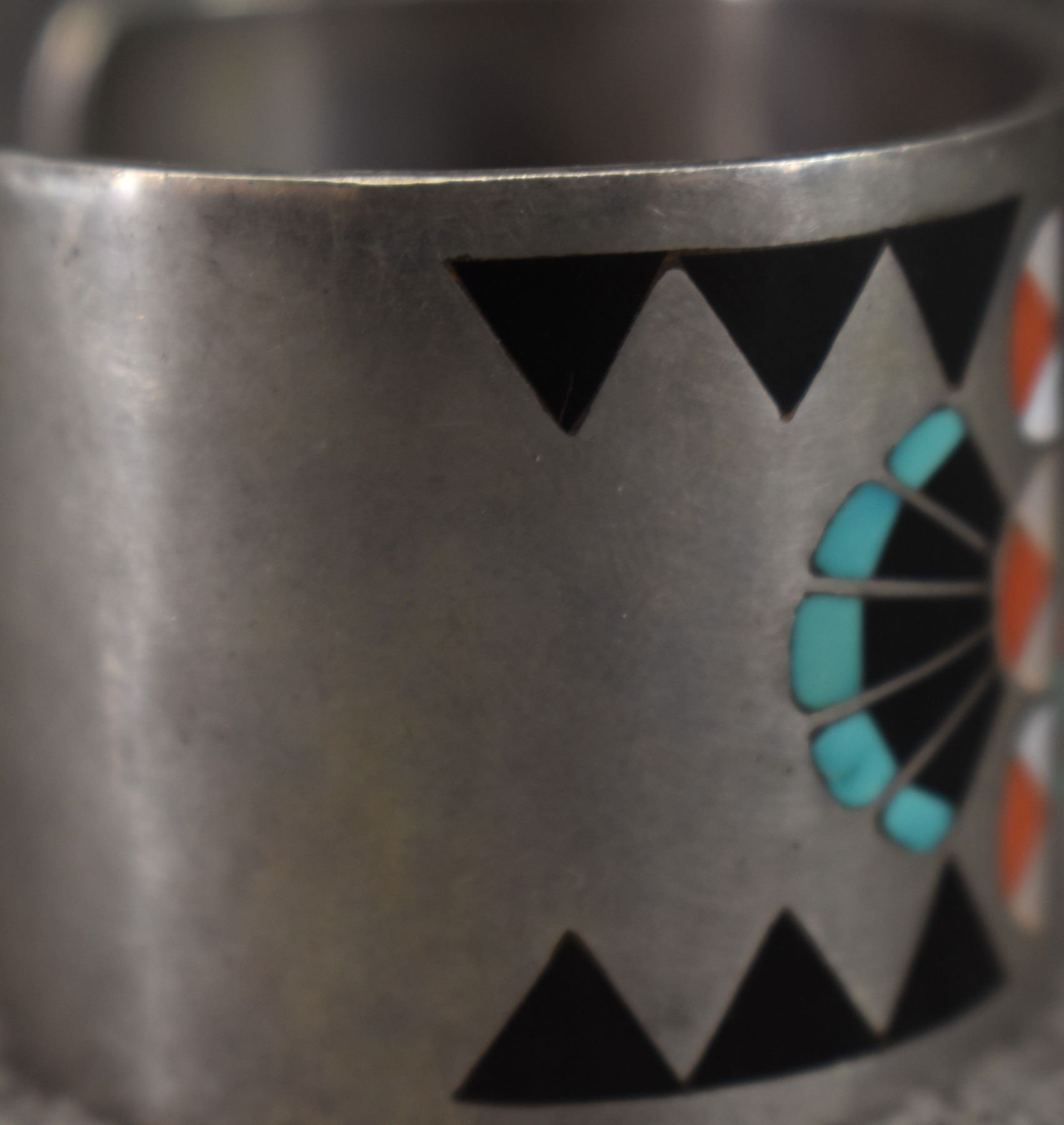 1960's Zuni. Sterling silver turquoise coral and shell 1.5'' x 5.5'' x 1.5''. Total weight 79 grams