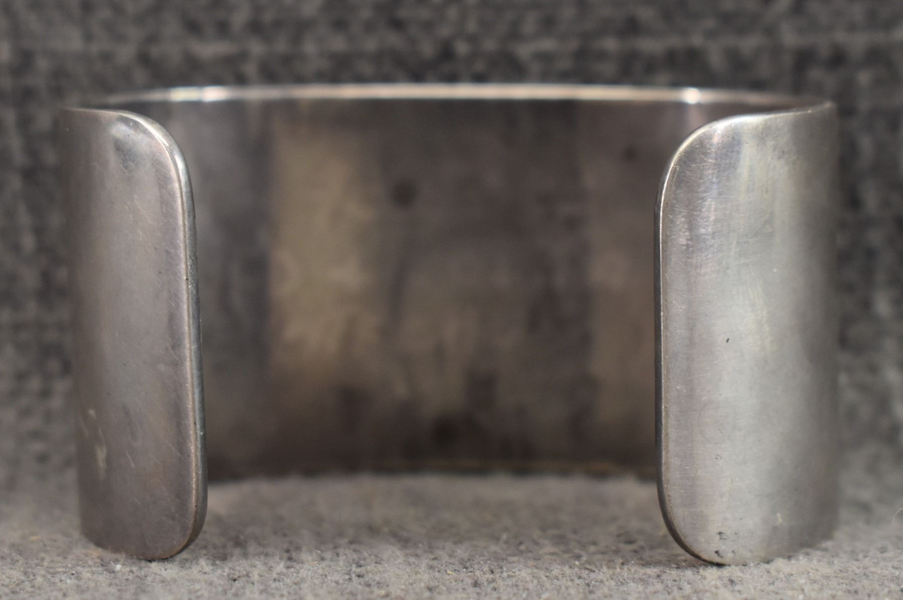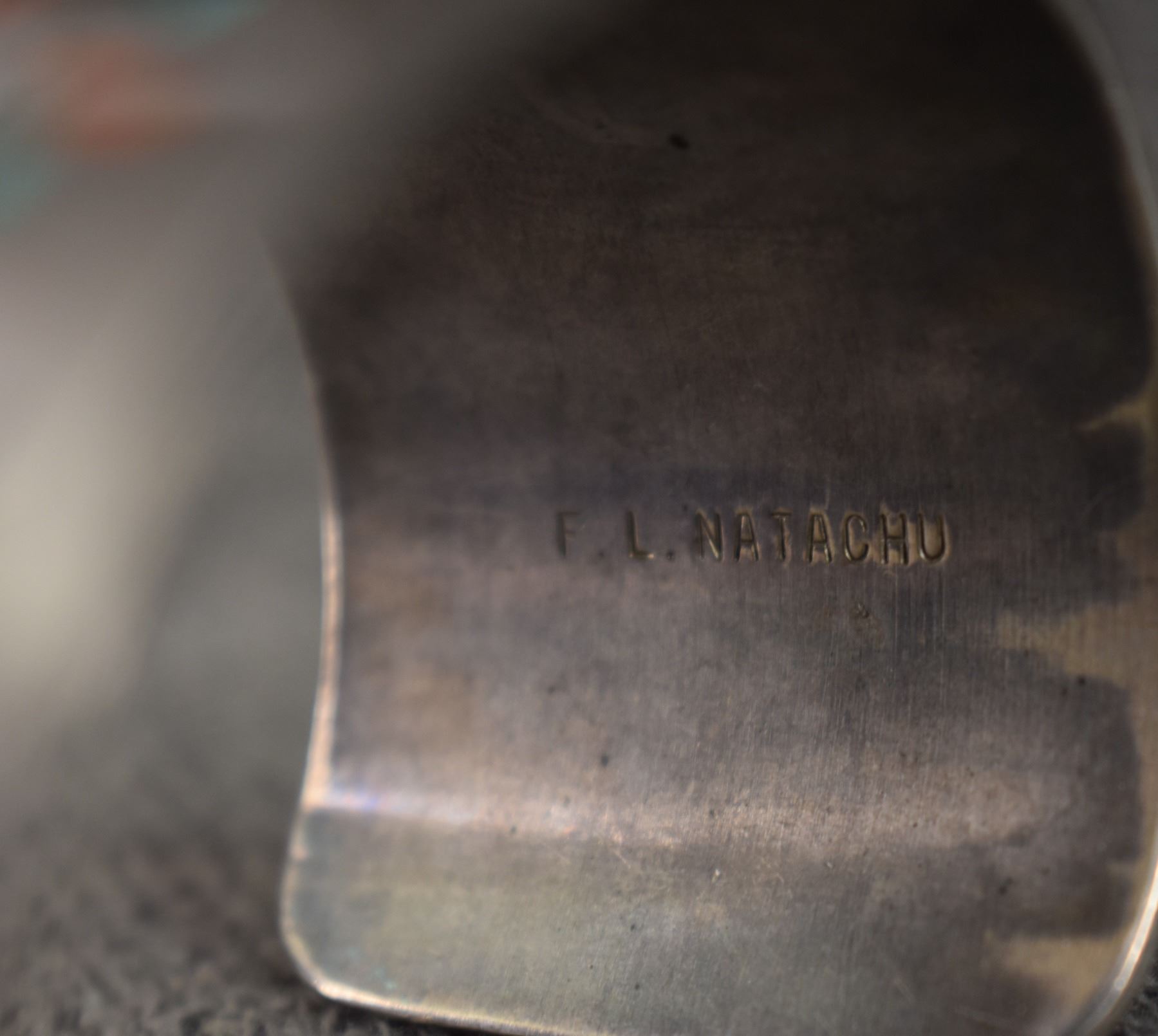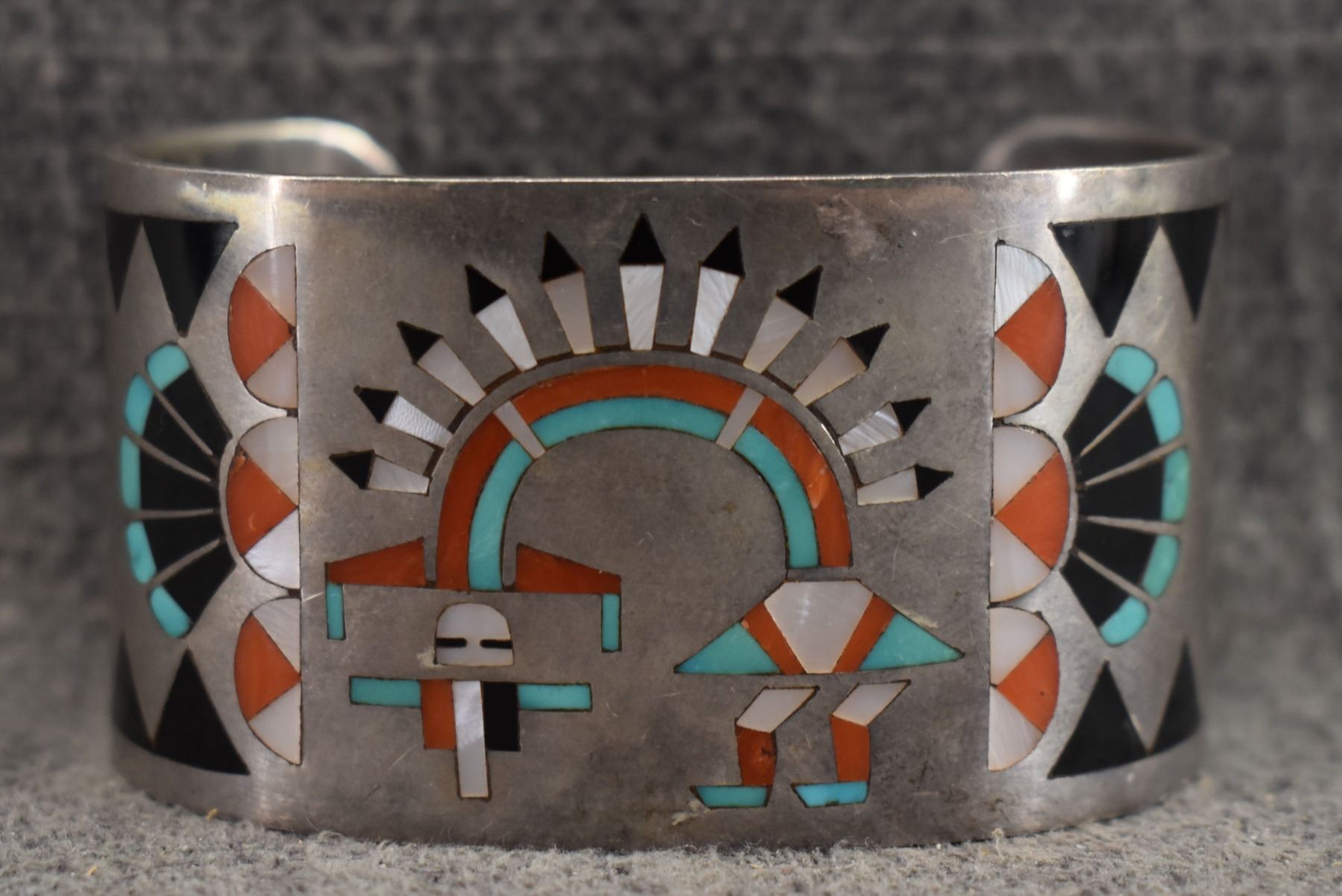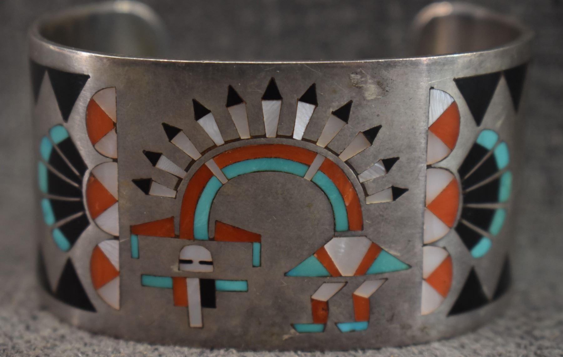 1960's Zuni. Sterling silver turquoise coral and shell 1.5'' x 5.5'' x 1.5''. Total weight 79 grams