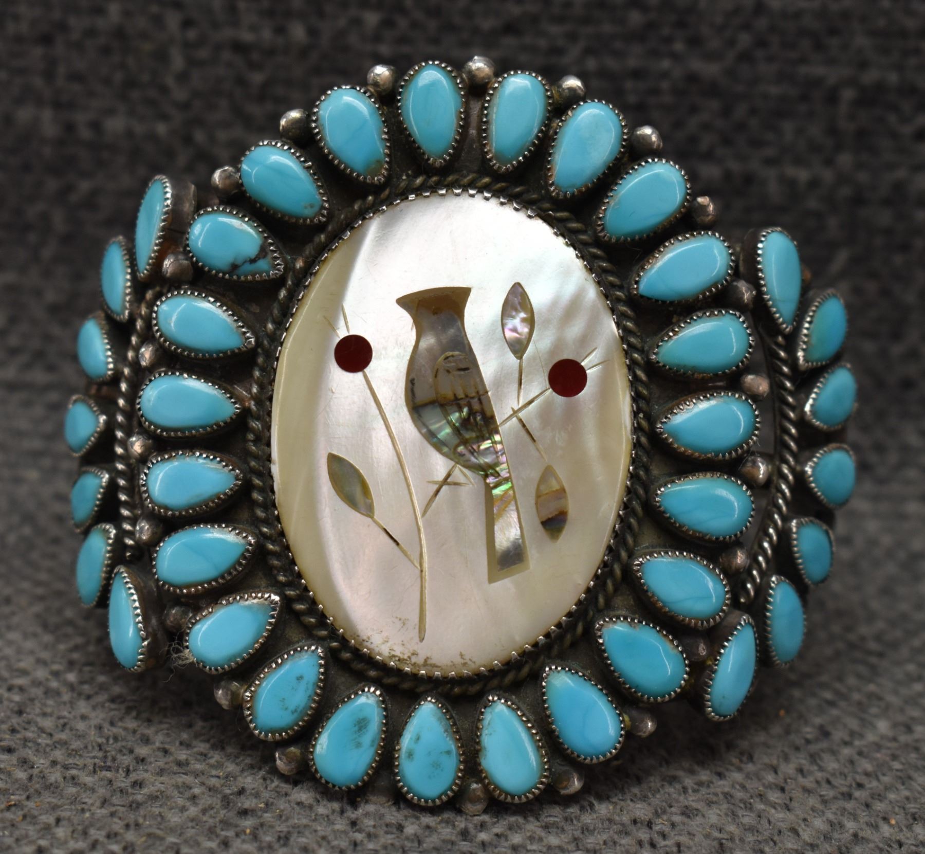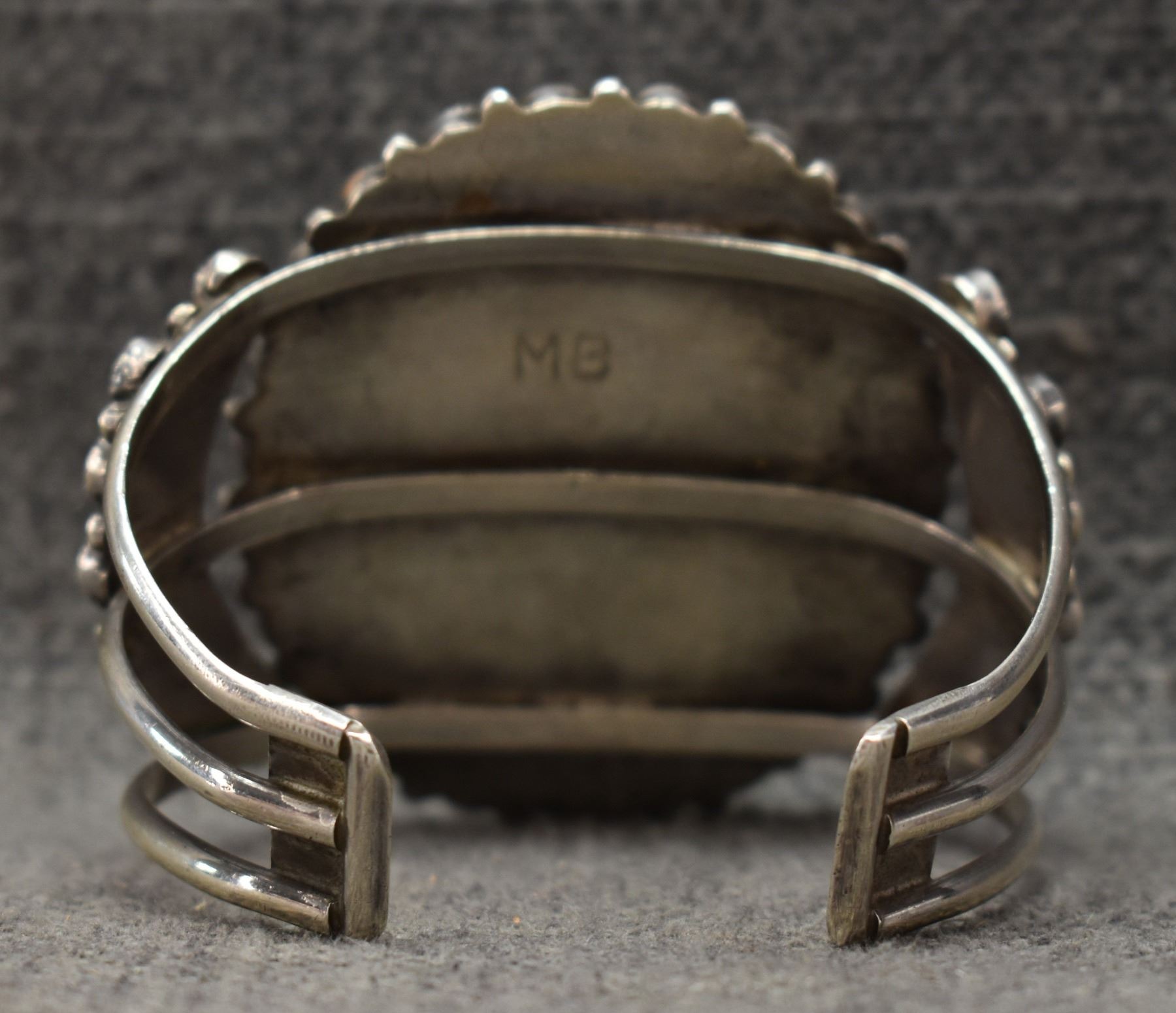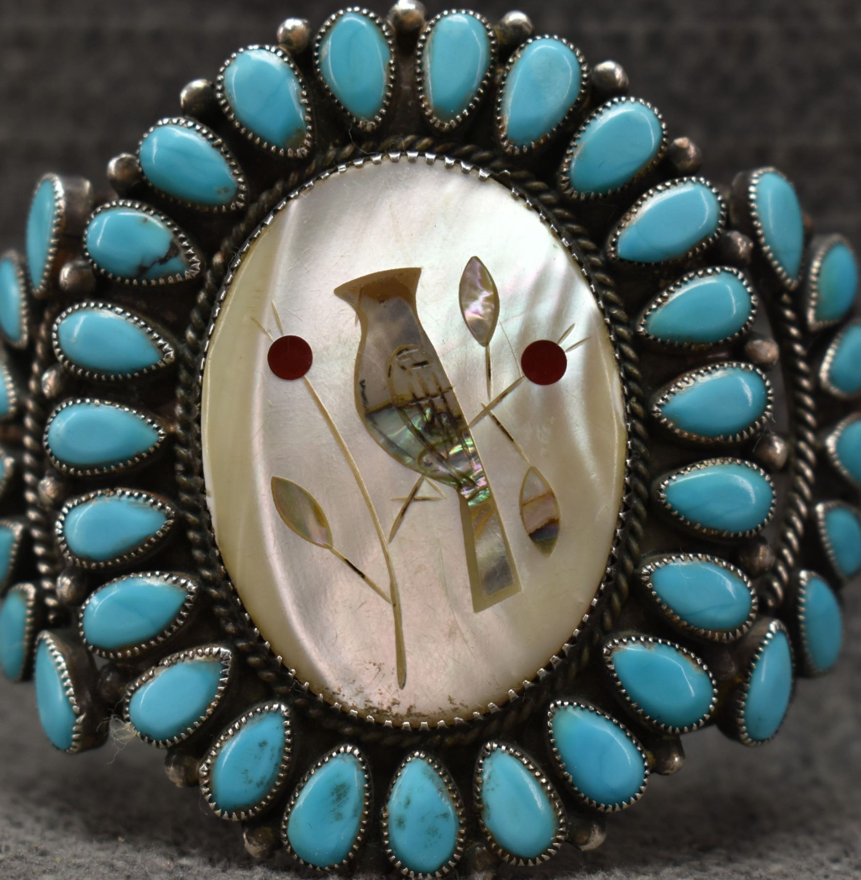 1970's Zuni. Sterling silver turquoise and shell bracelet 2.5'' x 5.5'' x 1''. signed .M.B. total weight 54 grams