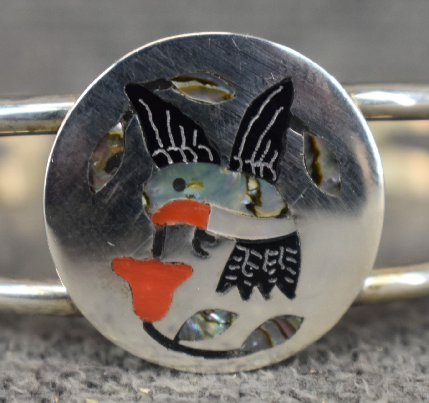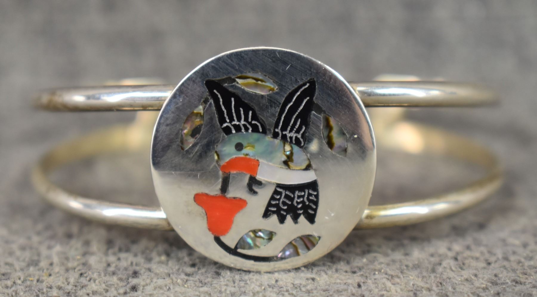 2000-10's Zuni, sterling silver with mosaic inlaid shell jet and coral hummingbird design signed SC Edaakie, 1" x 5.25" x 1" total weight 15 grams