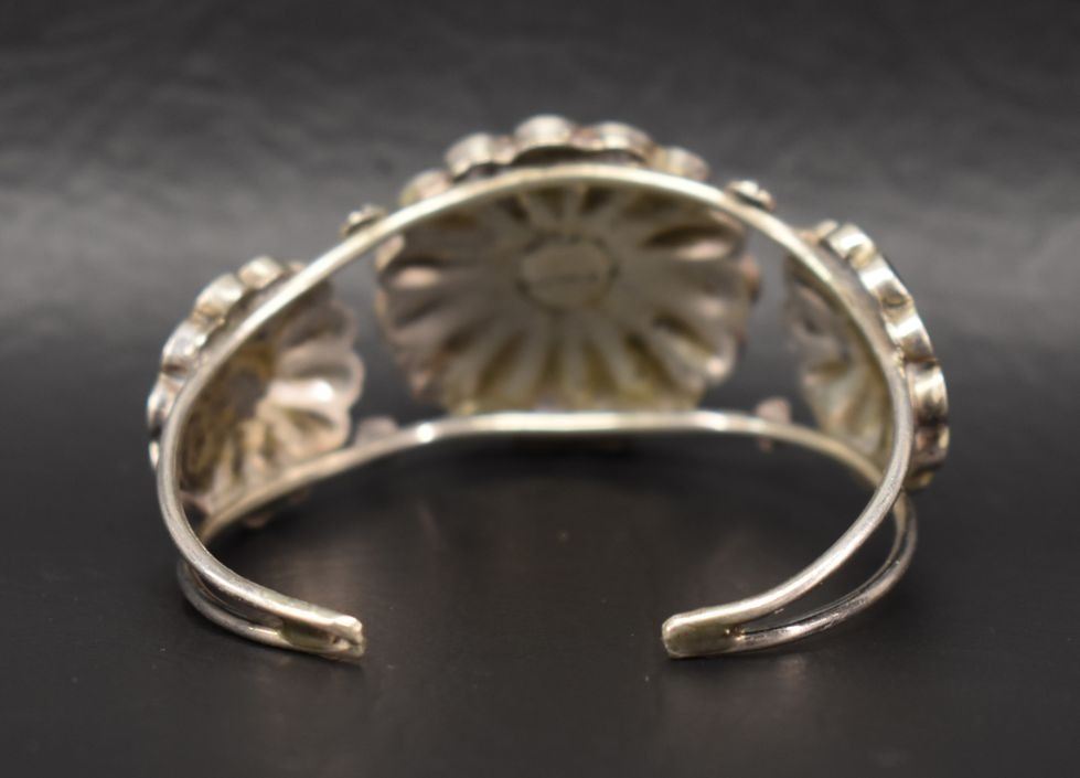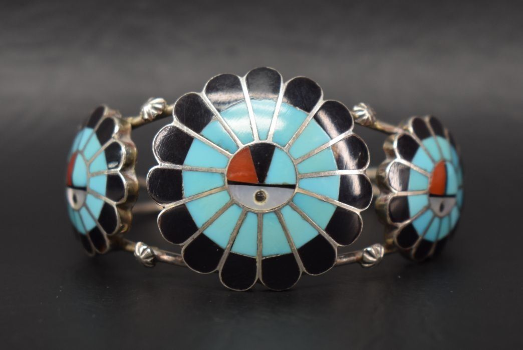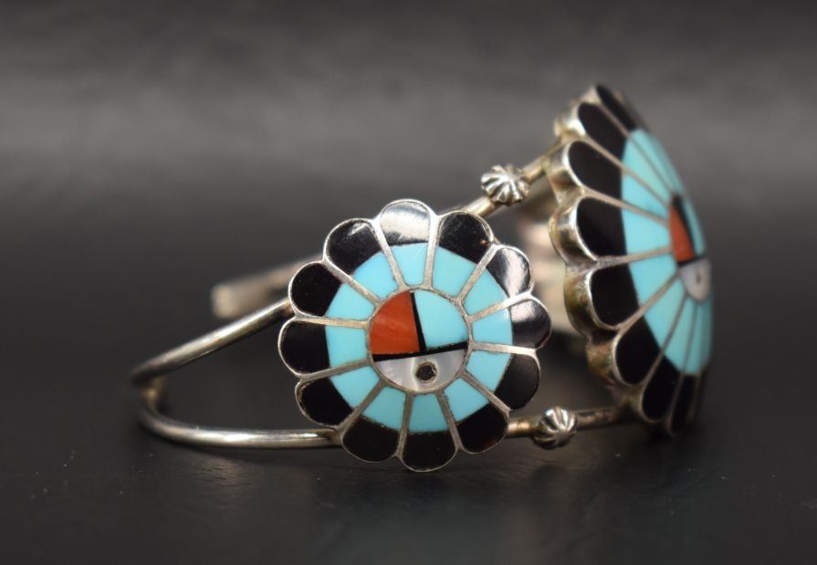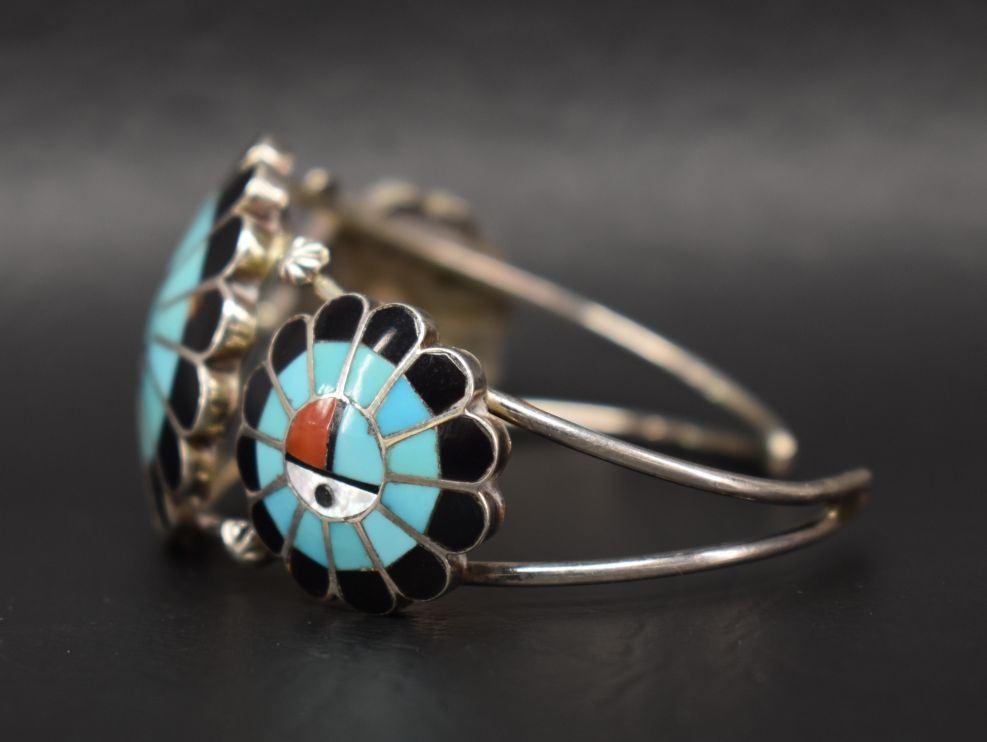 1980's Zuni, sterling silver with channel and mosaic inlaid turquoise shell and coral sun face design signed 1" x 5" x .75" total weight 21 grams