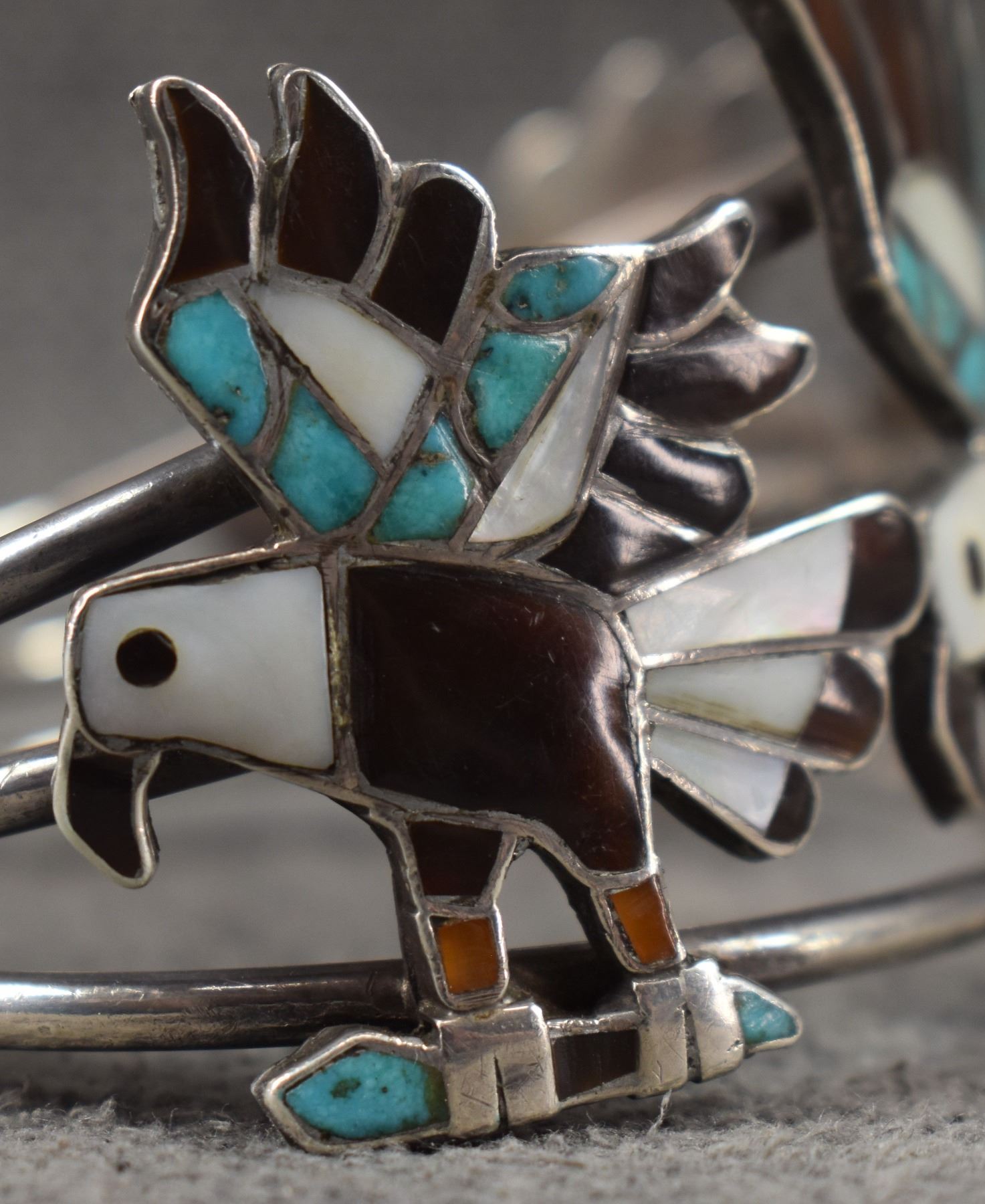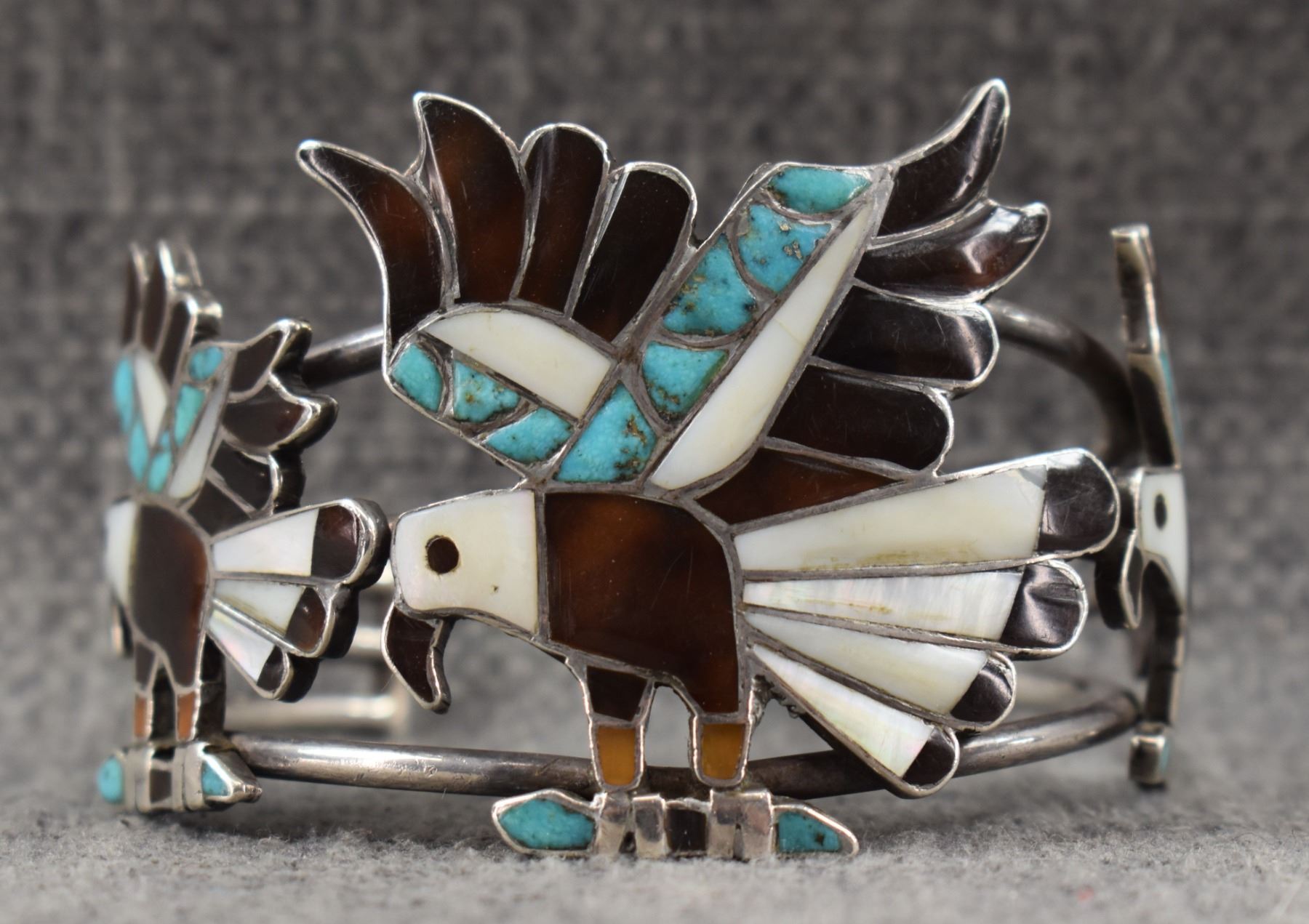 1960's Zuni, sterling silver with channel inlaid turquoise and shell eagle design 1.75" x 5.25" x 1"