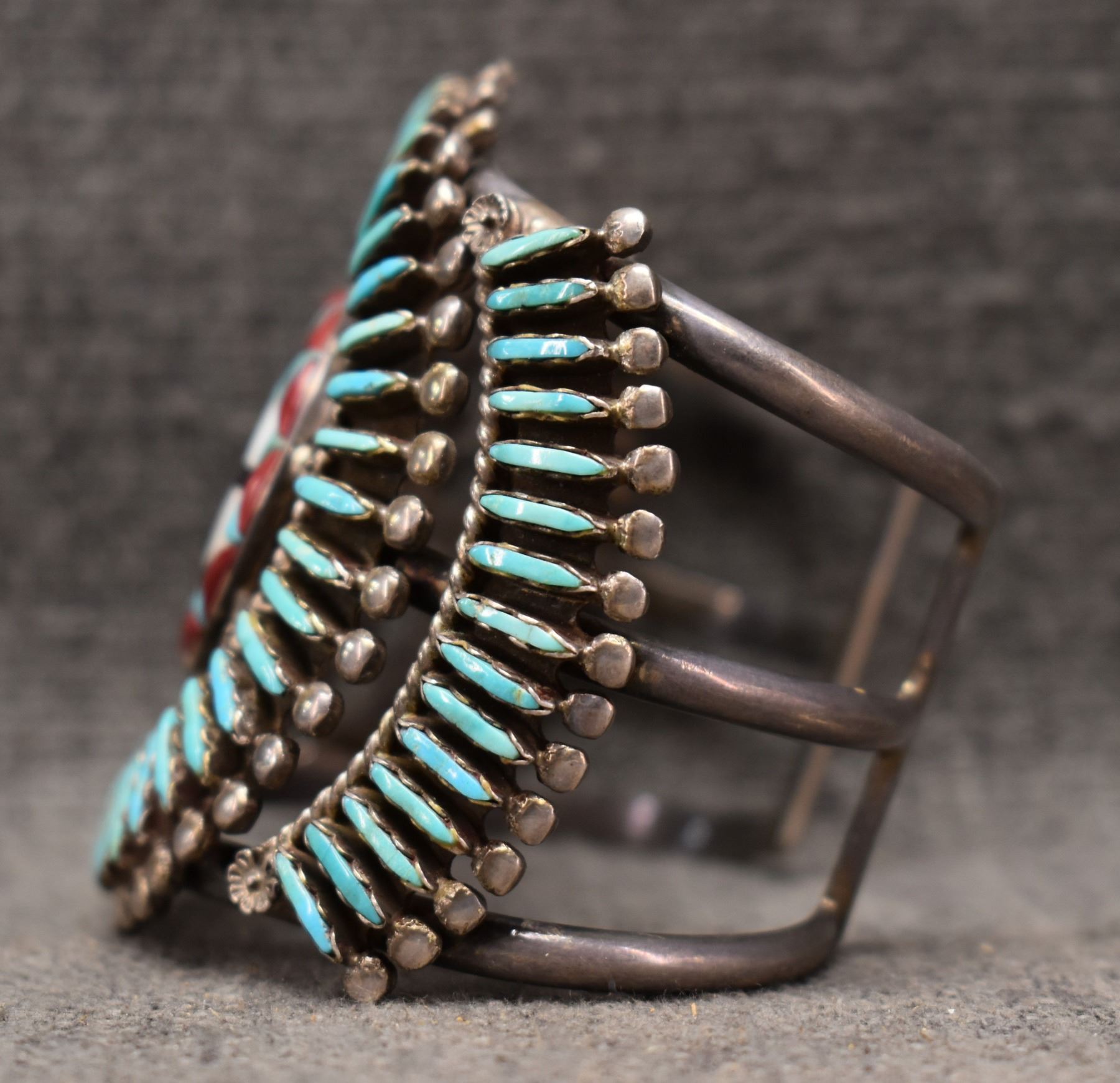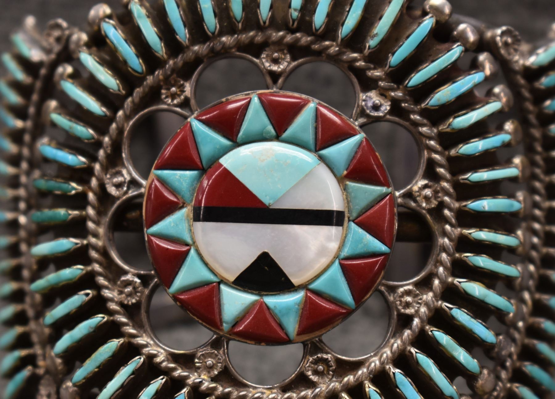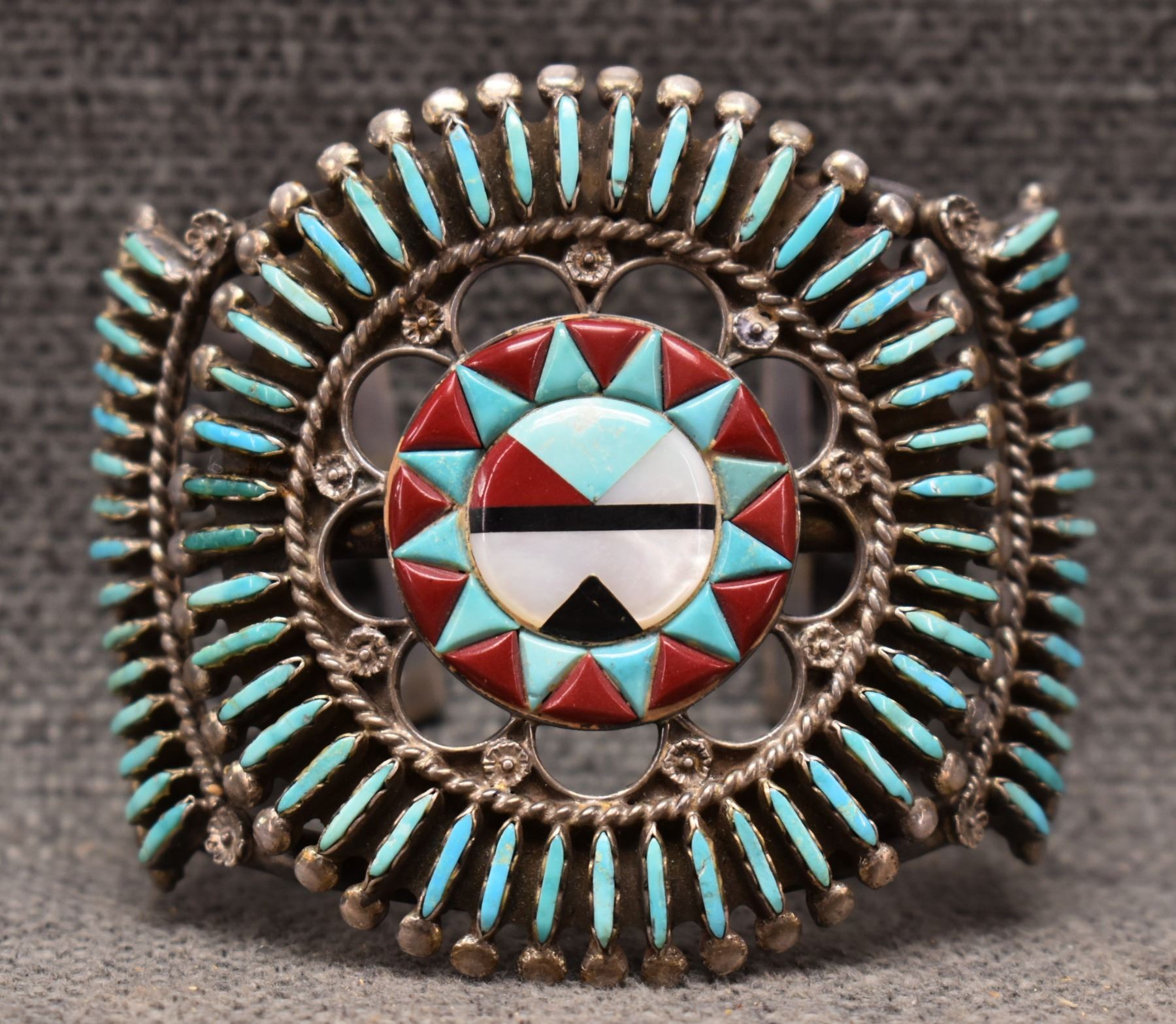 1970's Zuni. Sterling silver turquoise coral and shell bracelet. 2.75'' x 6'' x 1.25''. Total weight 105 grams